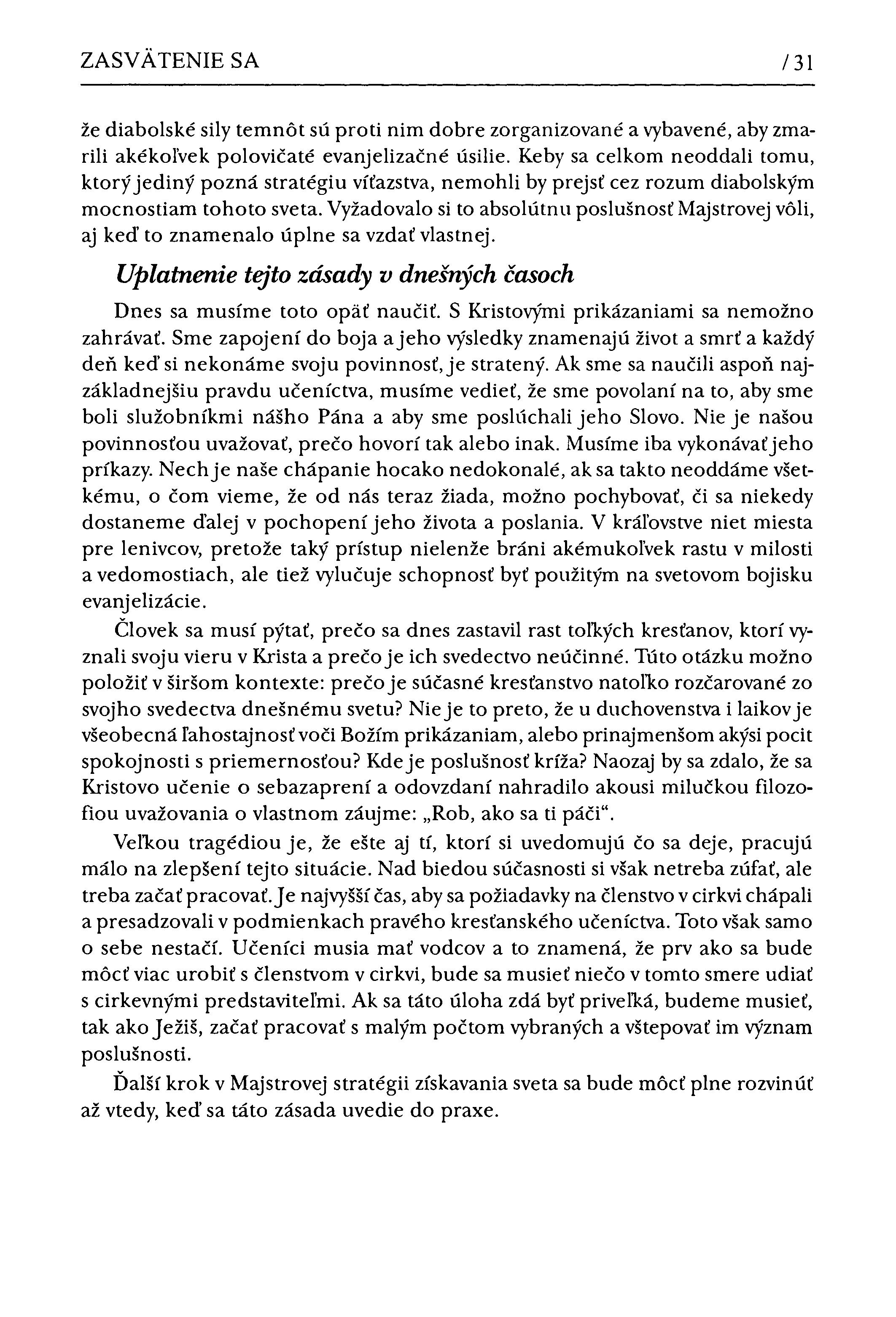 Z tohto d6vodu ma tato kniha casom neohranicenu kvalitu a tak, ako sa prihovarala k mufom a zenam pocas troch desarrocf, aj dnes si zasluzi, aby bola znova objavena dnesnou generaciou kresranov, ktorf nahliadli do Panovho srdca a uvideli jeho zapal pre evanjelizaciu.
