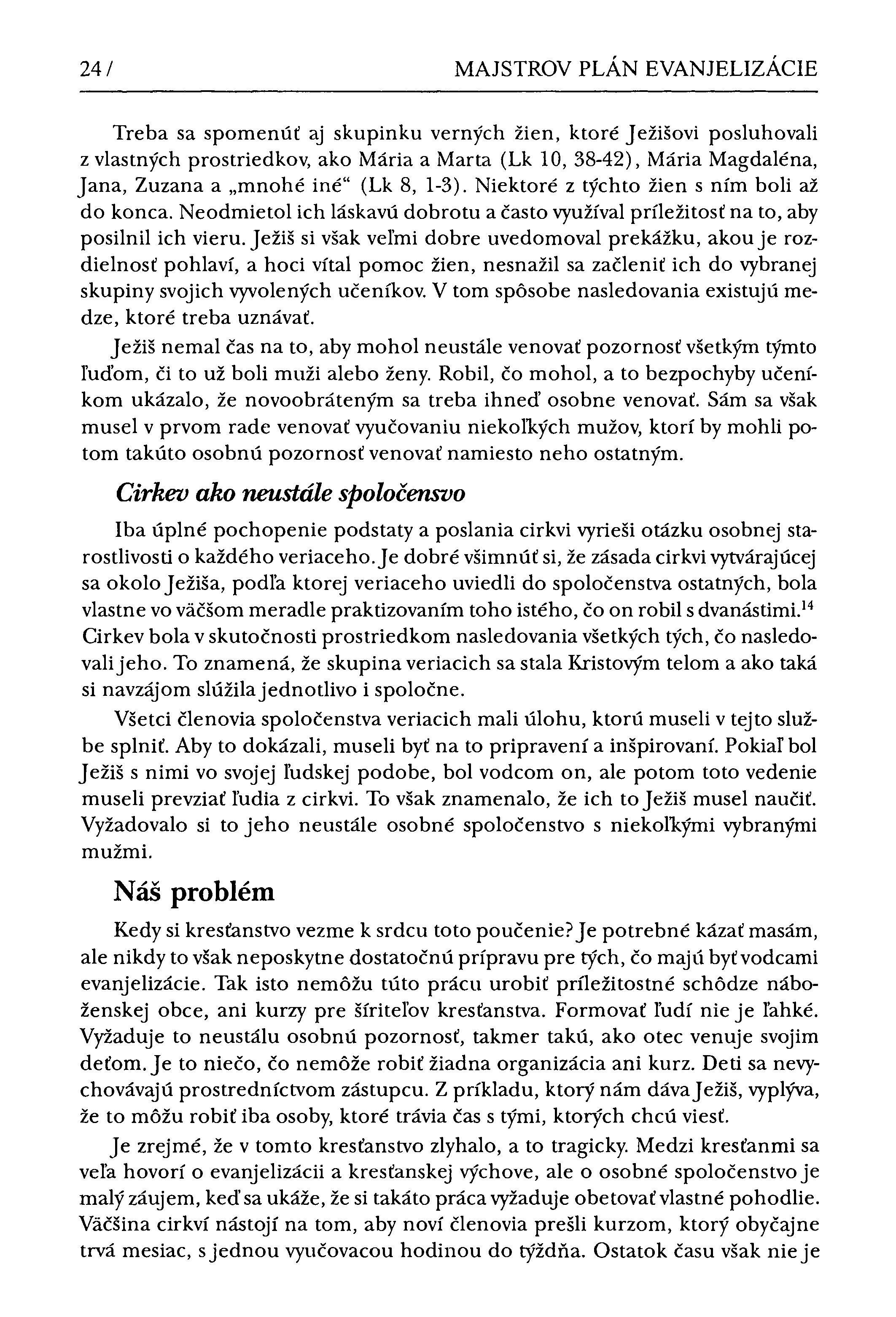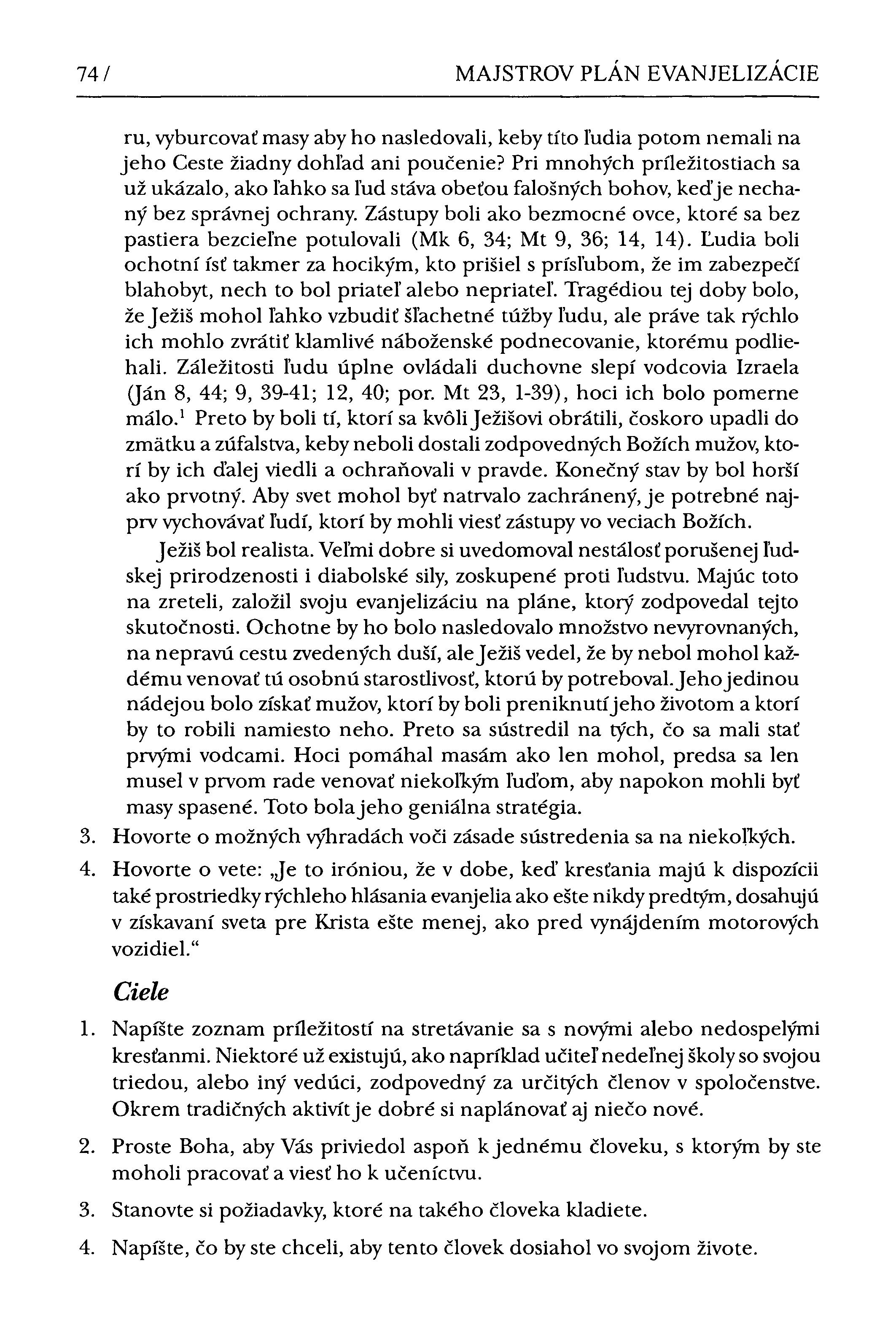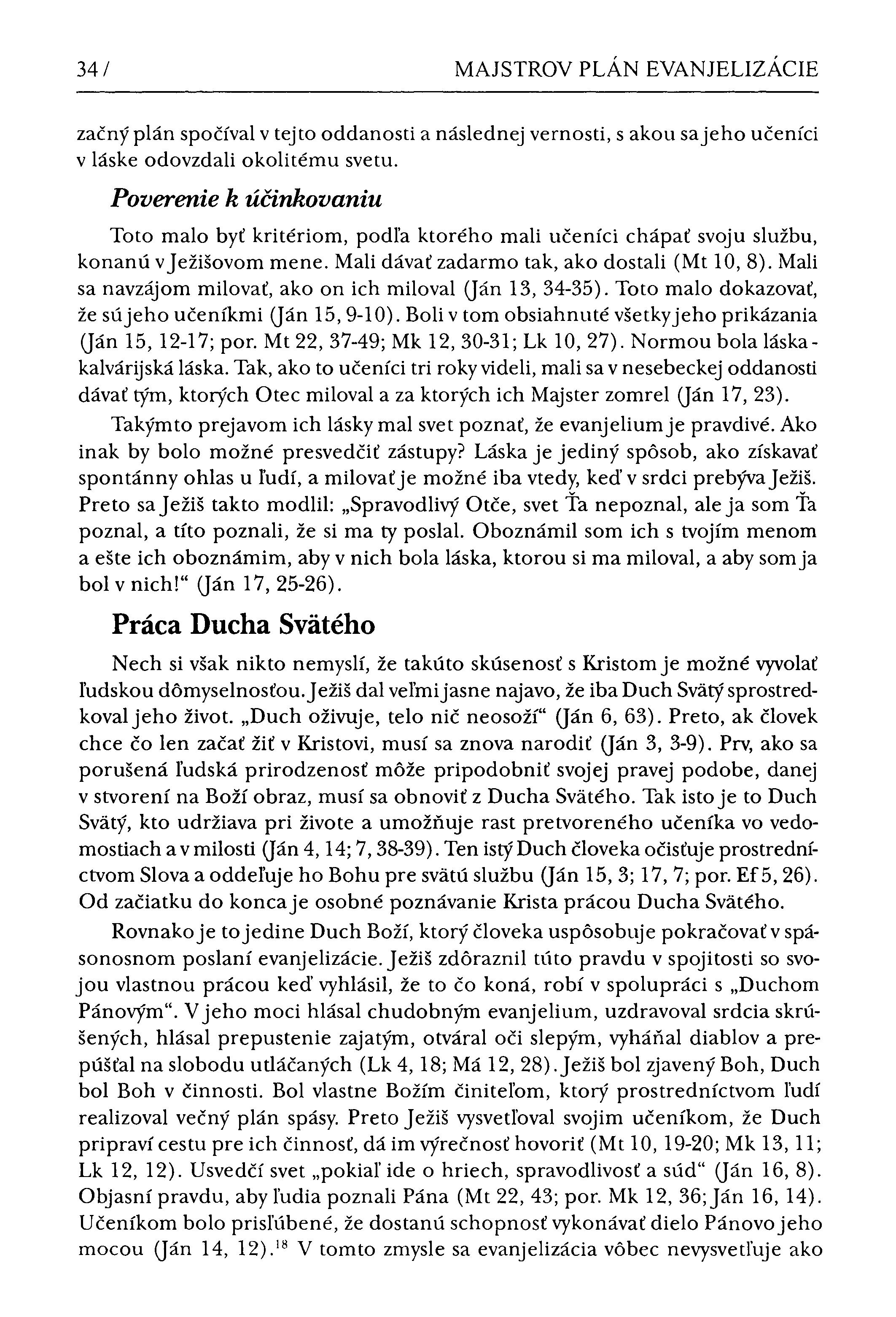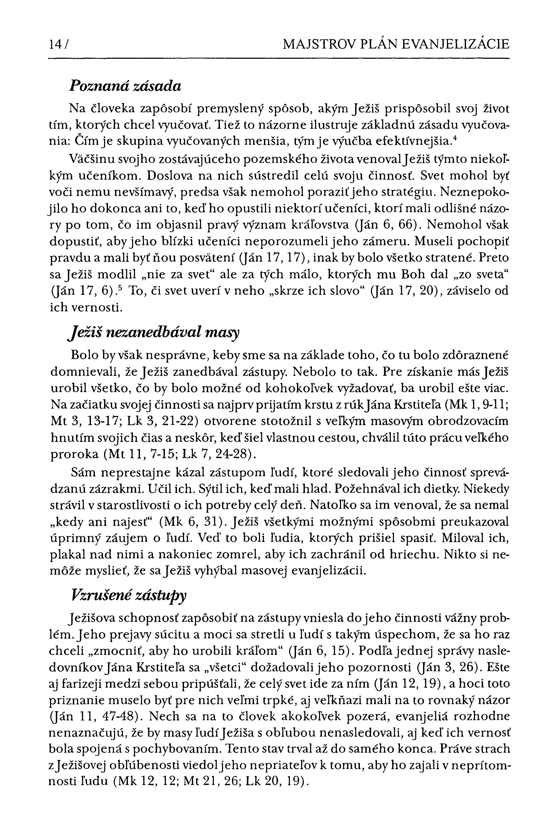 Uvadzame iba skrateny vyber z poznamok, uvedenych v originali. Vynechavame bohate citaty pramenov, ktore su nasmu citatefovi sotva dostupne. Prfpadnym zaujemcom odporucame studium originalu: Robert E. Coleman, THE MASTER PLAN OF EVANGELISM, Fleming H. Revell Company, Old Tappan, New Jersey, feb. 1995, sest'.desiate sieste vydanie. Preklad povoleny autorom. Vsetky biblicke texty su zo slovenskeho ekumenickeho prekladu Pfsma Svateho, Novej zmluvy a Zalmov, Slovenska biblicka spolocnost'., Banska Bystrica 1995.