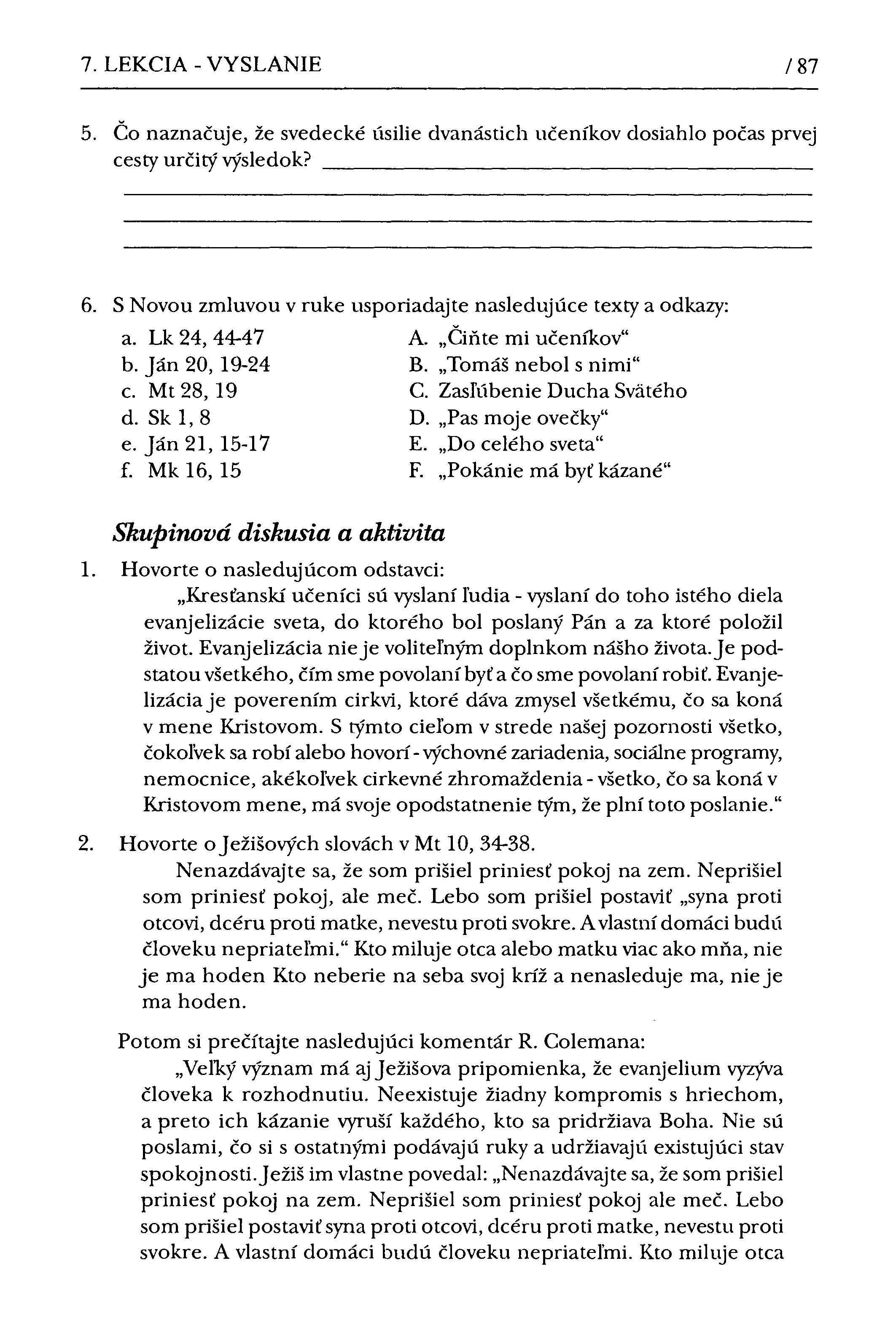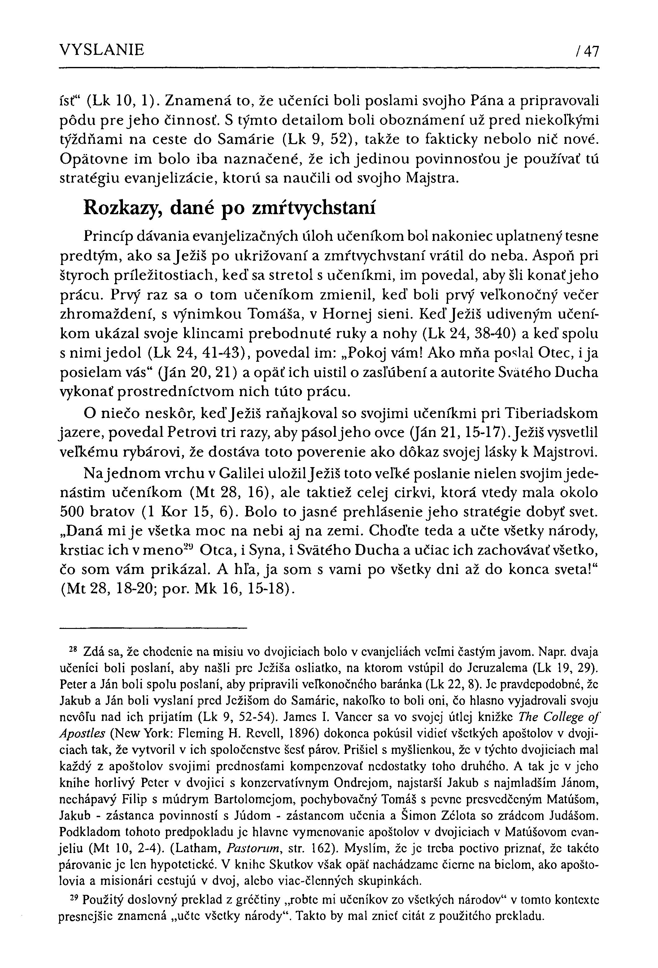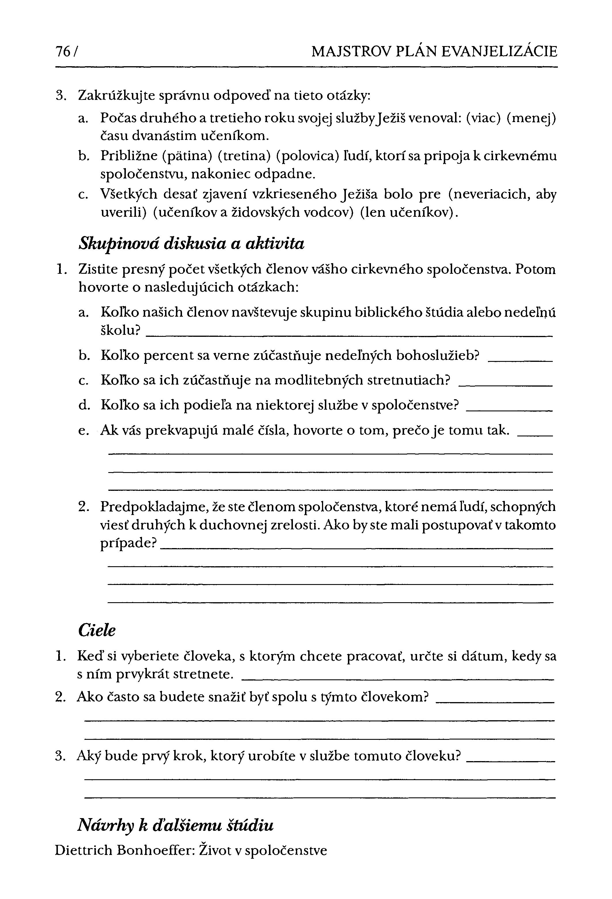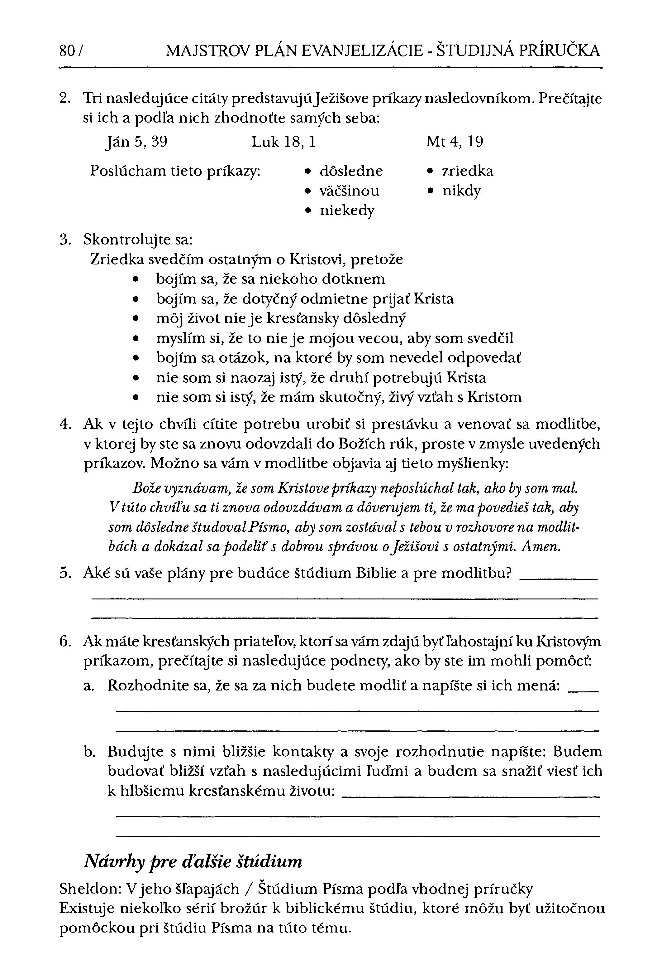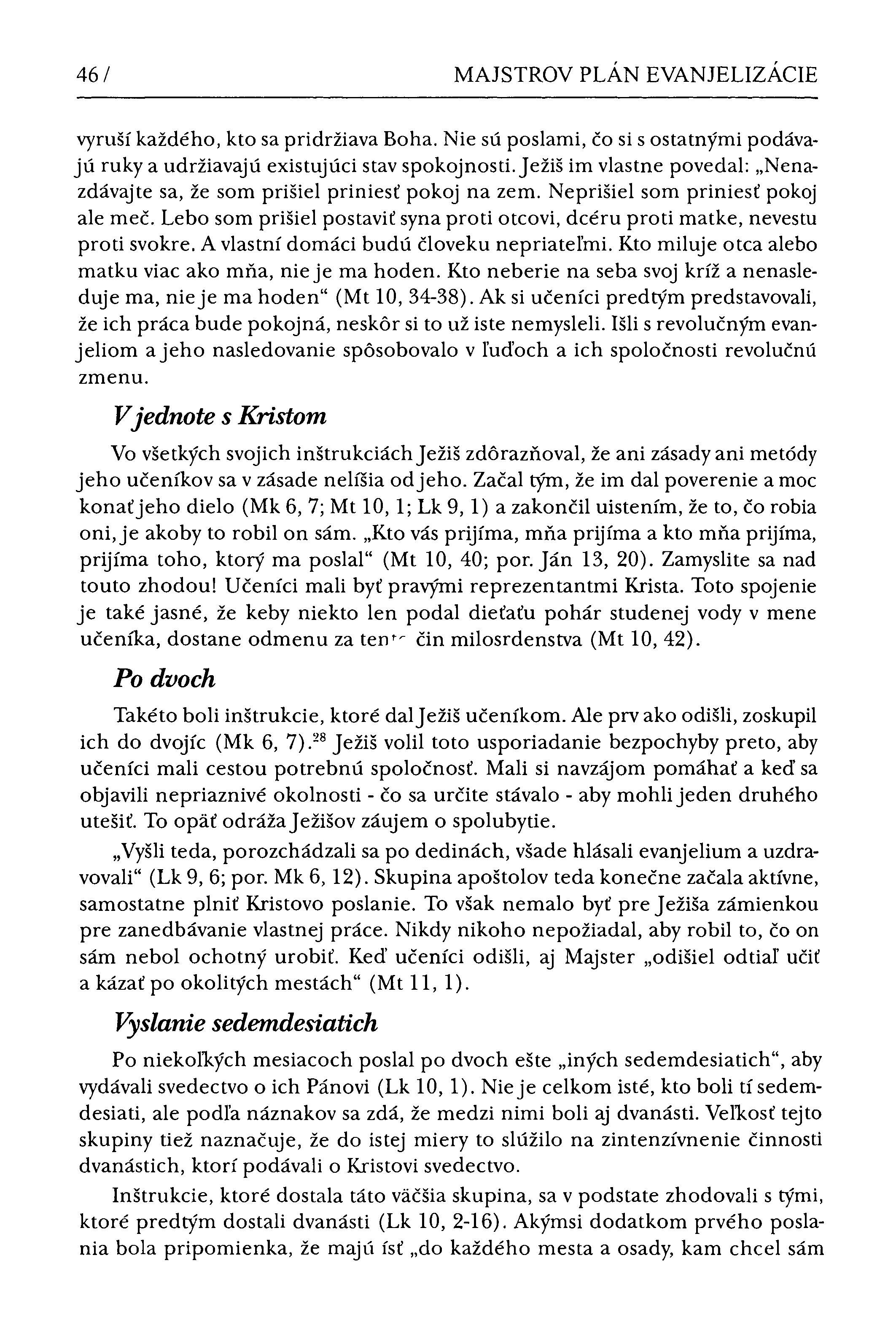 Uvadzame iba skrateny vyber z poznamok, uvedenych v originali. Vynechavame bohate citaty pramenov, ktore su nasmu citatefovi sotva dostupne. Prfpadnym zaujemcom odporucame studium originalu: Robert E. Coleman, THE MASTER PLAN OF EVANGELISM, Fleming H. Revell Company, Old Tappan, New Jersey, feb. 1995, sest'.desiate sieste vydanie. Preklad povoleny autorom. Vsetky biblicke texty su zo slovenskeho ekumenickeho prekladu Pfsma Svateho, Novej zmluvy a Zalmov, Slovenska biblicka spolocnost'., Banska Bystrica 1995.