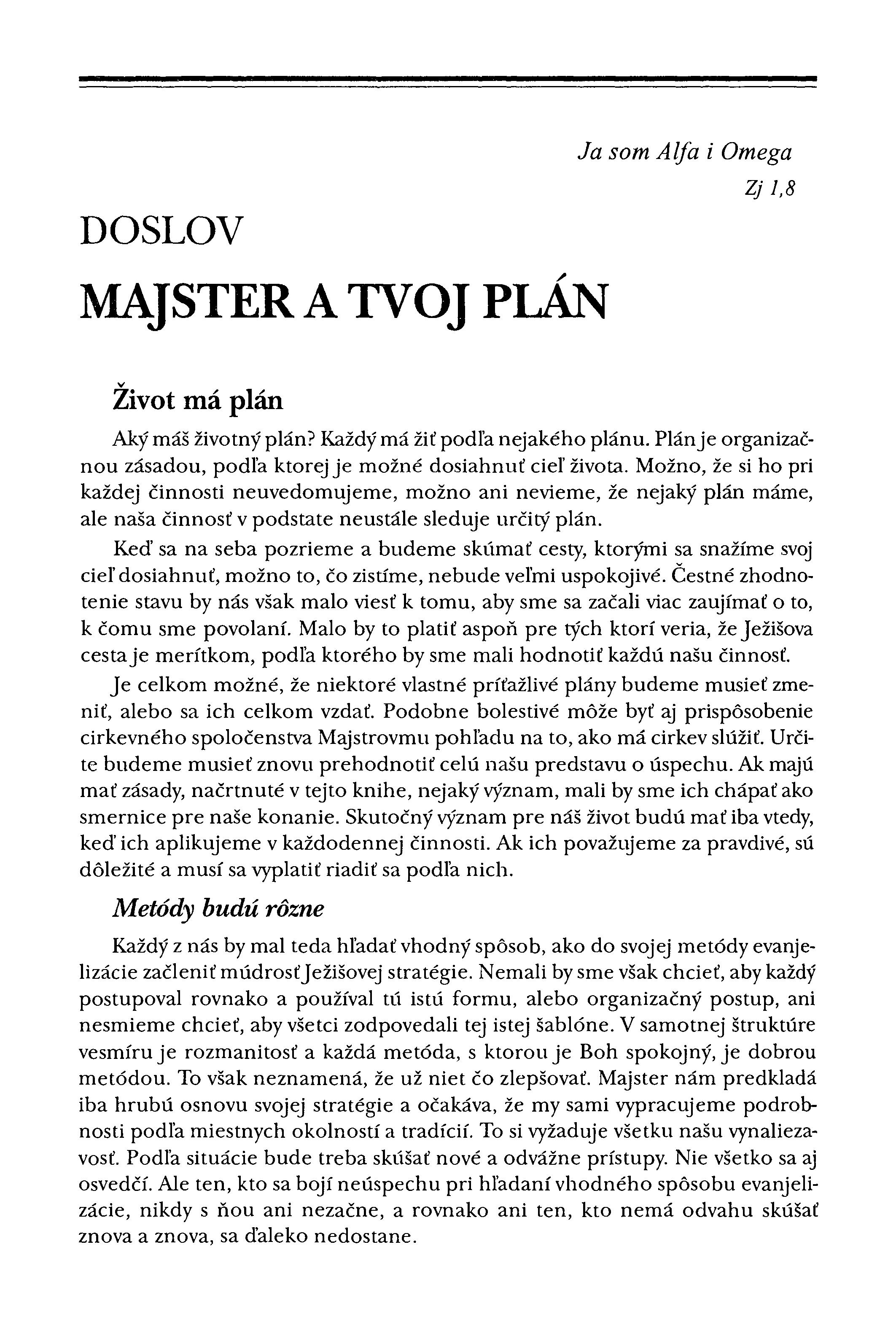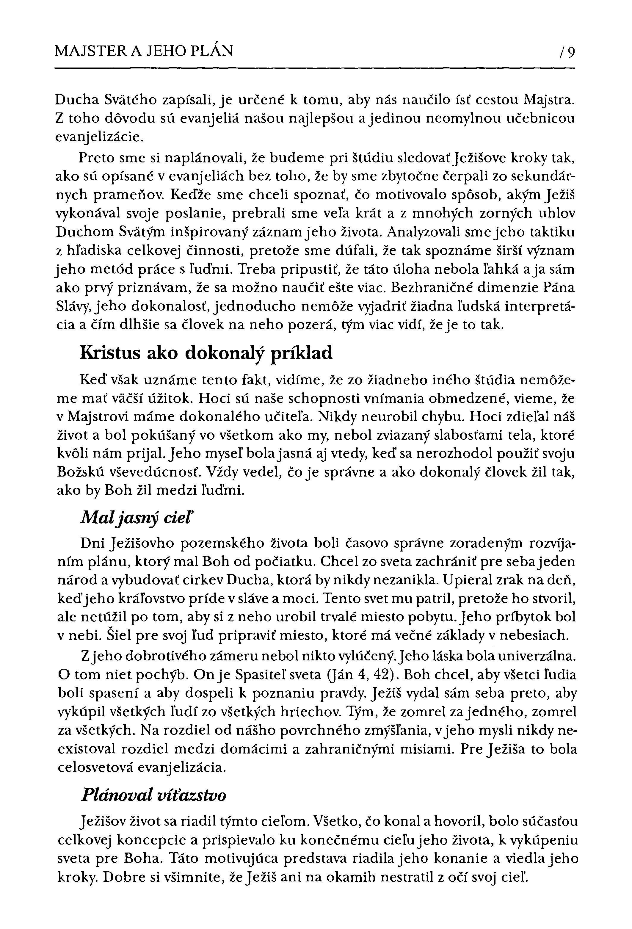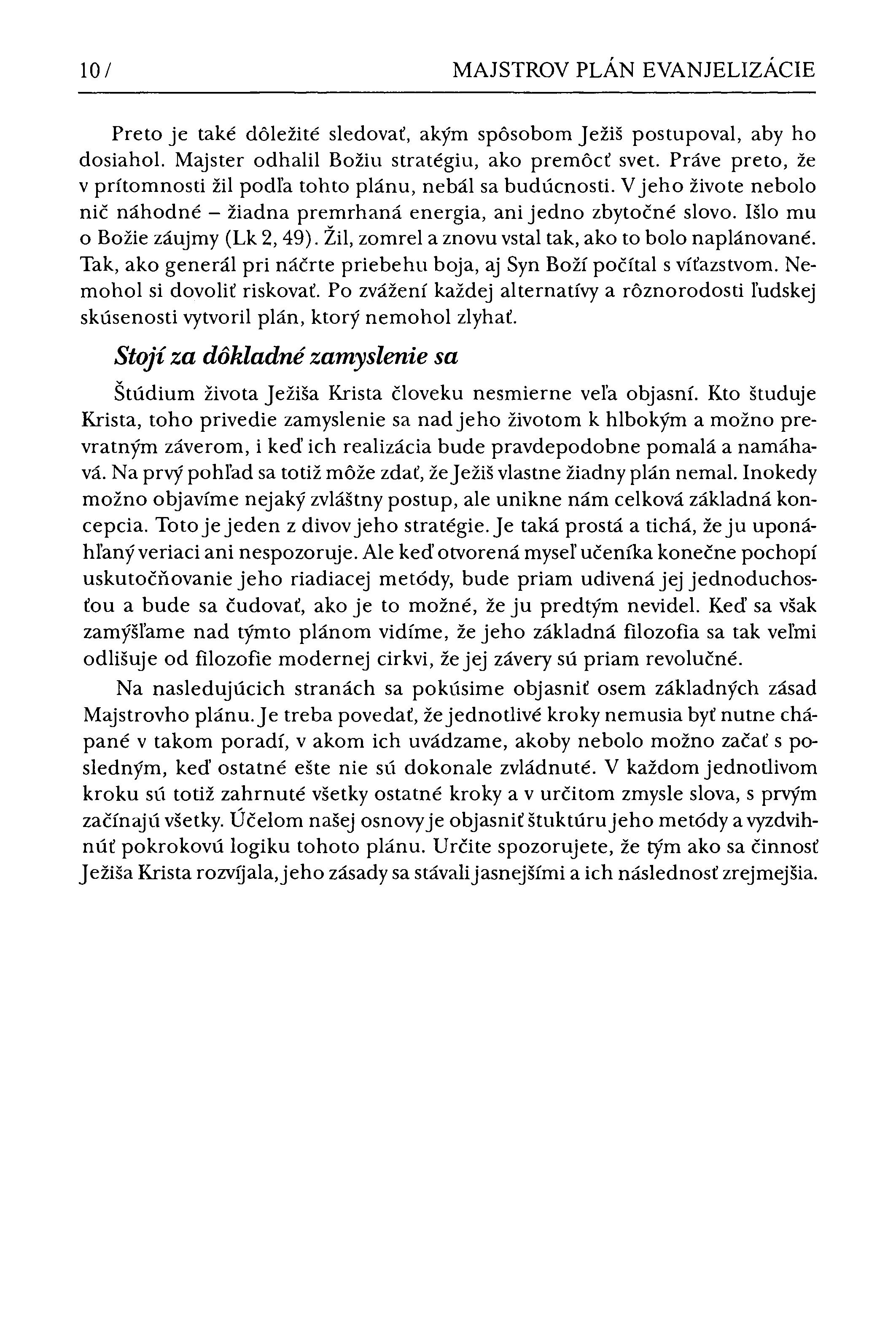 Preto sme sa pokusili o toto studium. Snazfme sa spoznaf hlavne zasady, ktore riadia konanie Majstra, pretoze dufame, ze aj nasa praca by sa mohla prisposobir podobnej koncepcii. Kniha sa nesnazf vysvetfovaf metody, ktore Jezis pouzfval pri evanjelizacii jednotlivcov alebo celych skupfn. Je to skor studium zasad, ktore tvorili zaklad jeho cinnosti - zasad, ktore urcovali jeho metody. Mozno ho nazvaf studioujeho evanjelizacnej strategie, ktora usmern.ovalajeho zivot, kym chodil po tejto zemi.