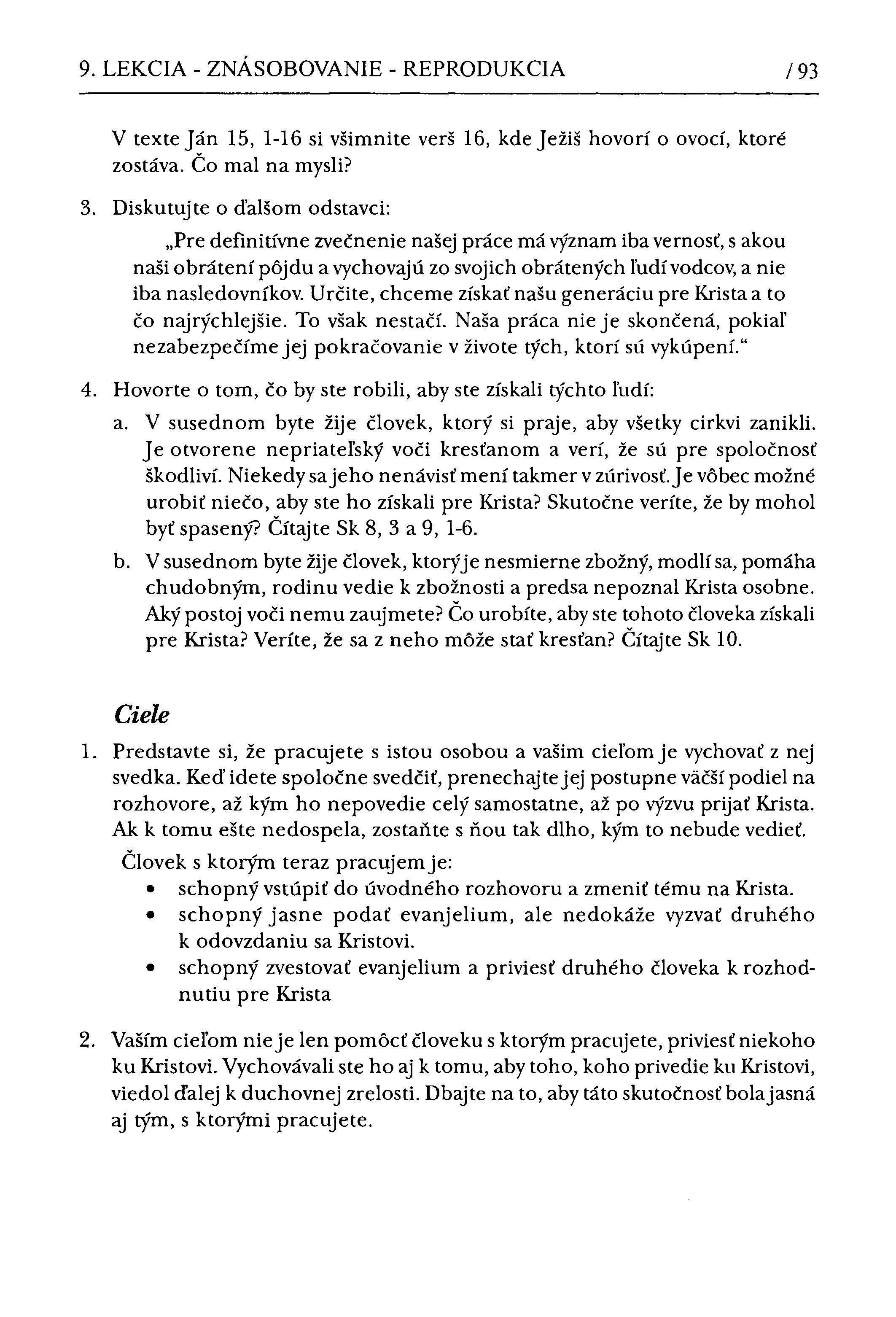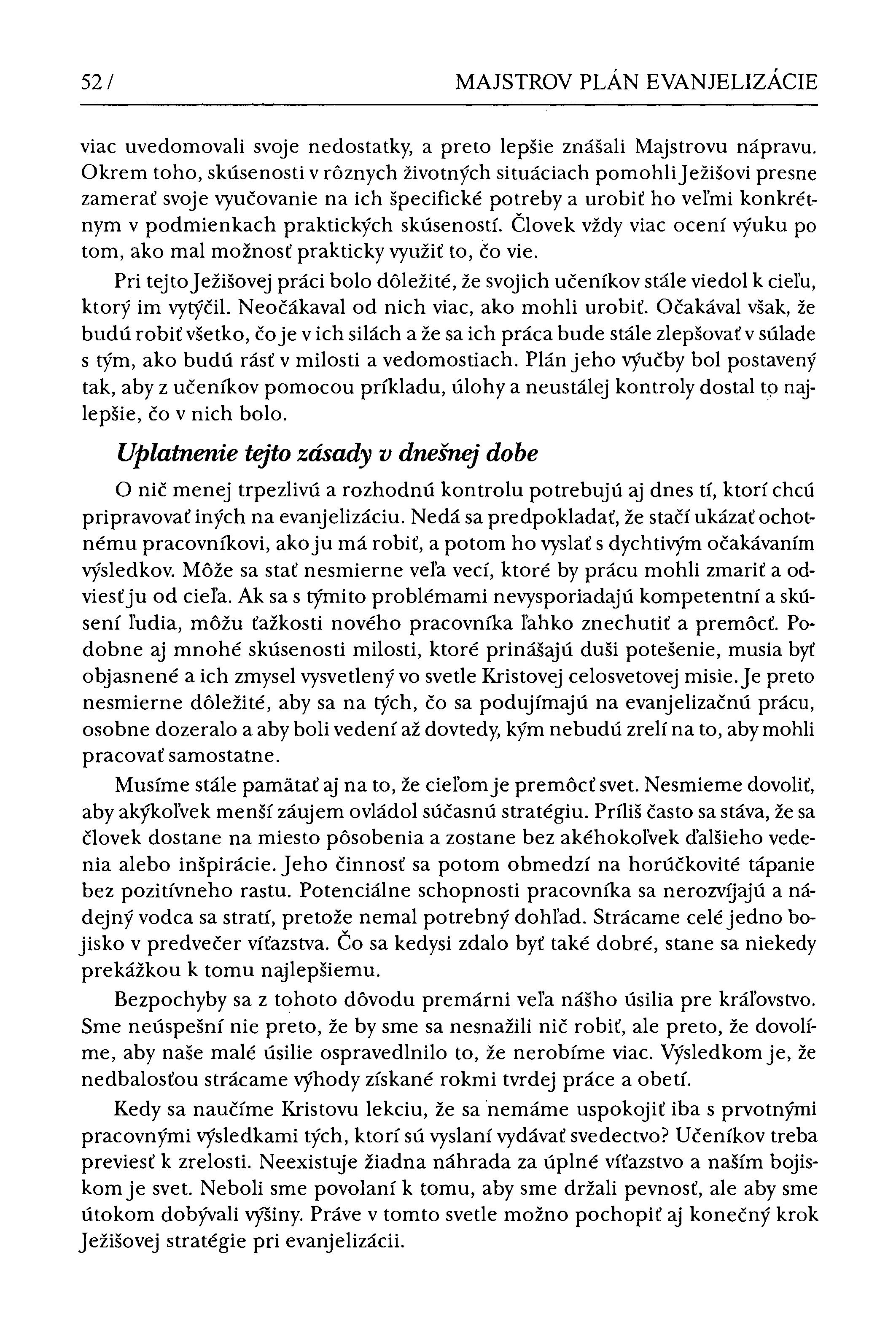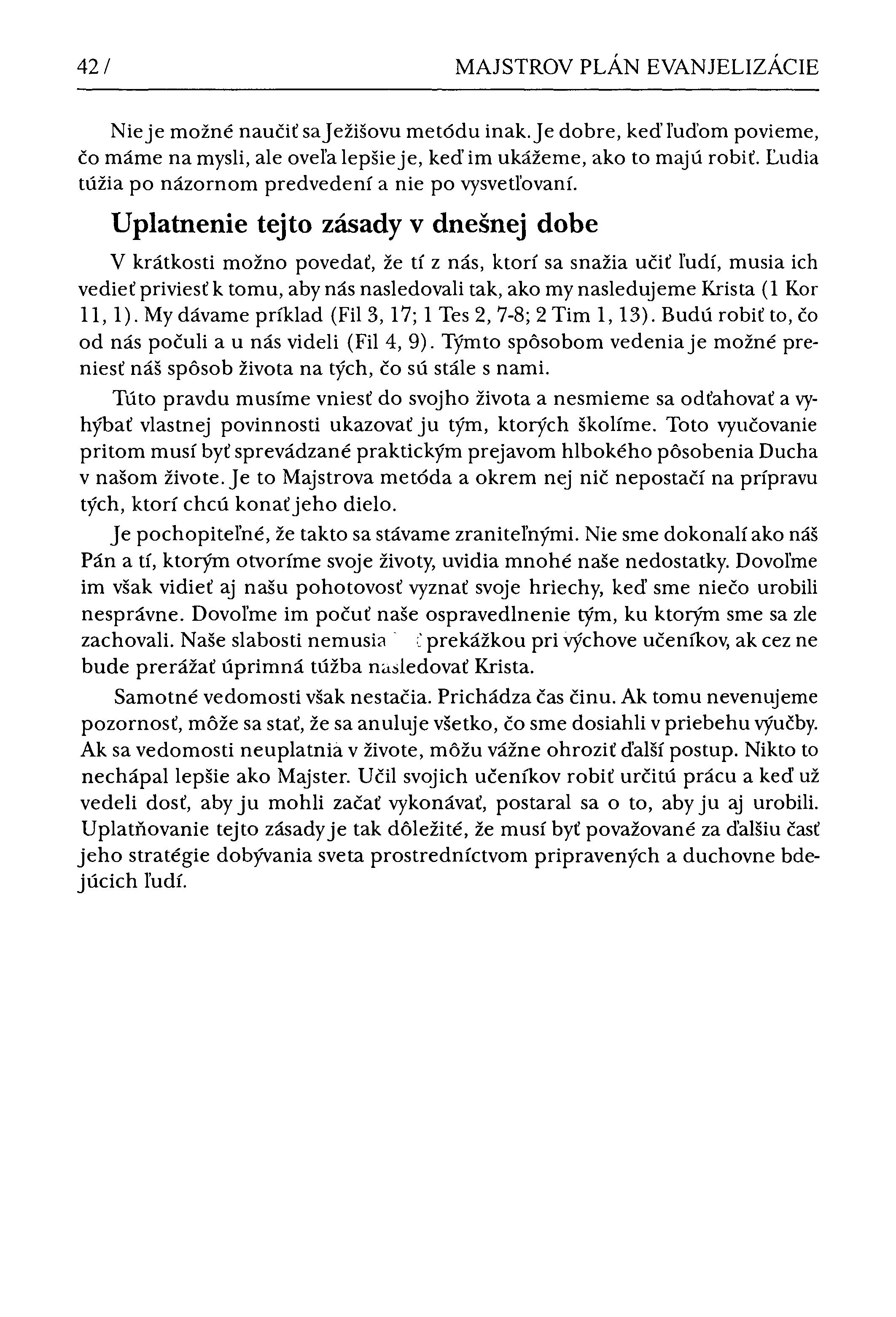 Preto sme sa pokusili o toto studium. Snazfme sa spoznaf hlavne zasady, ktore riadia konanie Majstra, pretoze dufame, ze aj nasa praca by sa mohla prisposobir podobnej koncepcii. Kniha sa nesnazf vysvetfovaf metody, ktore Jezis pouzfval pri evanjelizacii jednotlivcov alebo celych skupfn. Je to skor studium zasad, ktore tvorili zaklad jeho cinnosti - zasad, ktore urcovali jeho metody. Mozno ho nazvaf studioujeho evanjelizacnej strategie, ktora usmern.ovalajeho zivot, kym chodil po tejto zemi.