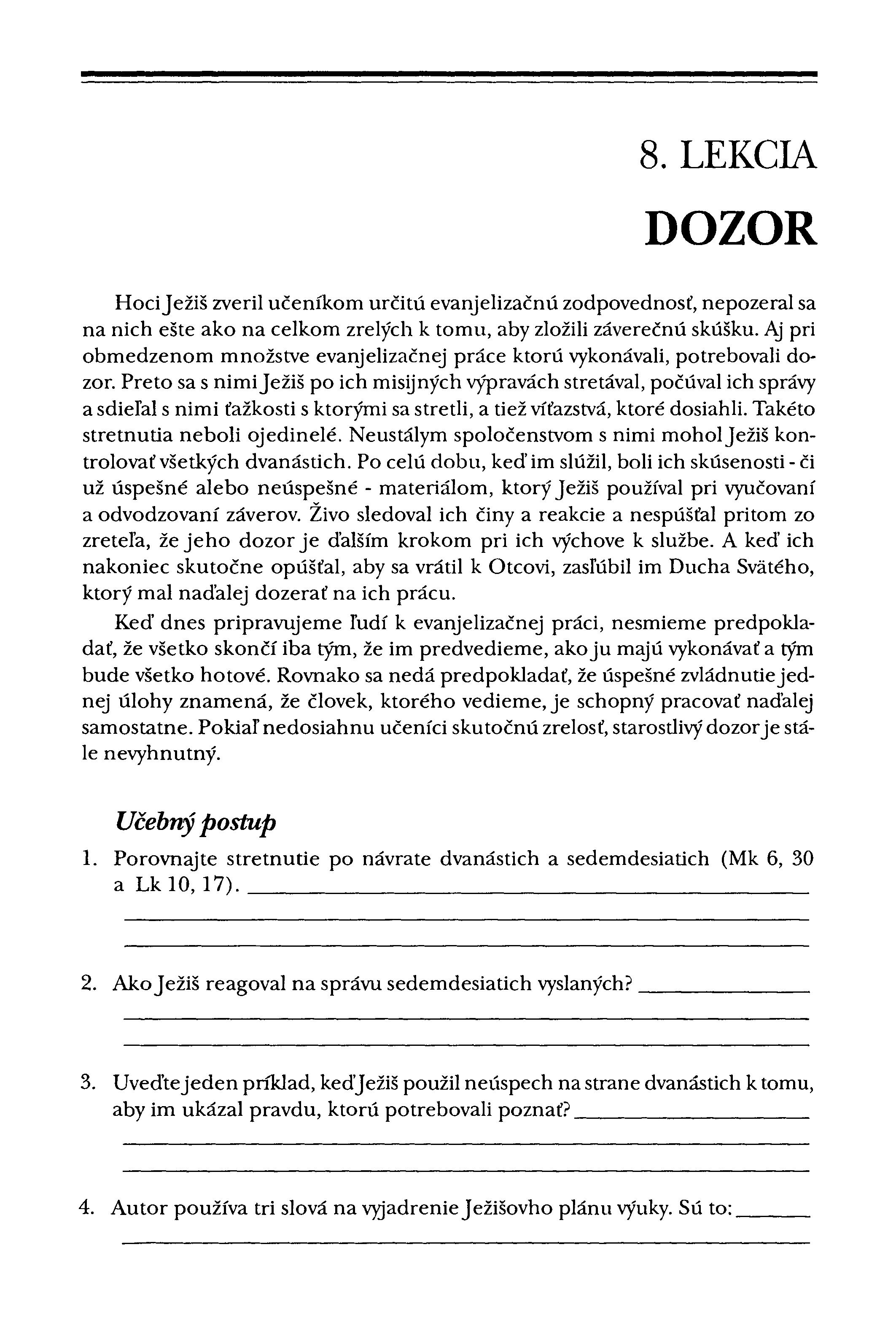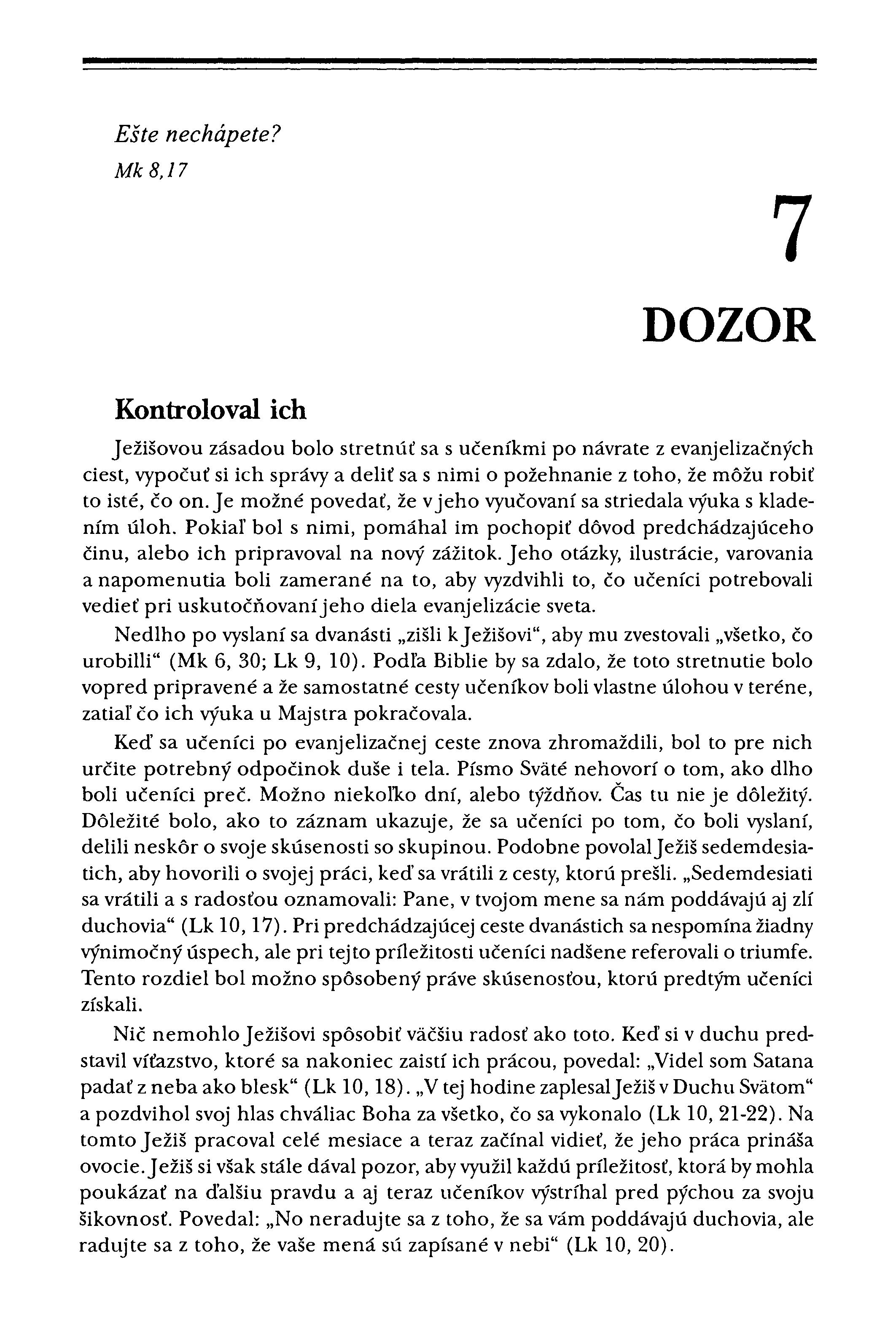 Preto sme si naplanovali, ze budeme pri studiu sledovat'Jezisove kroky tak, ako su opfsane v evanjeliach bez toho, ze by sme zbytocne cerpali zo sekundarnych pramenov. Kecfze sme chceli spoznat', co motivovalo sposob, akyrn Jezis vykonaval svoje poslanie, prebrali sme vel'a krat a z mnohych zornych uhlov Duchom Svatyrn inspirovany zaznamjeho zivota. Analyzovali smejeho taktiku z hl'adiska celkovej cinnosti, pretoze sme dufali, ze tak spozname sirsf vyznam jeho met6d prace s fucfmi. Treba pripustit', ze tato uloha nebola l'ahka a ja sam ako prvy priznavam, ze sa mozno naucit' este viac. Bezhranicne dimenzie Pana Slavy,jeho dokonalost', jednoducho nem6ze V)jadrit' ziadna fudska interpretacia a cfm dlhsie sa clovek na neho pozera, tyrnviac vidf, ze je to tak.