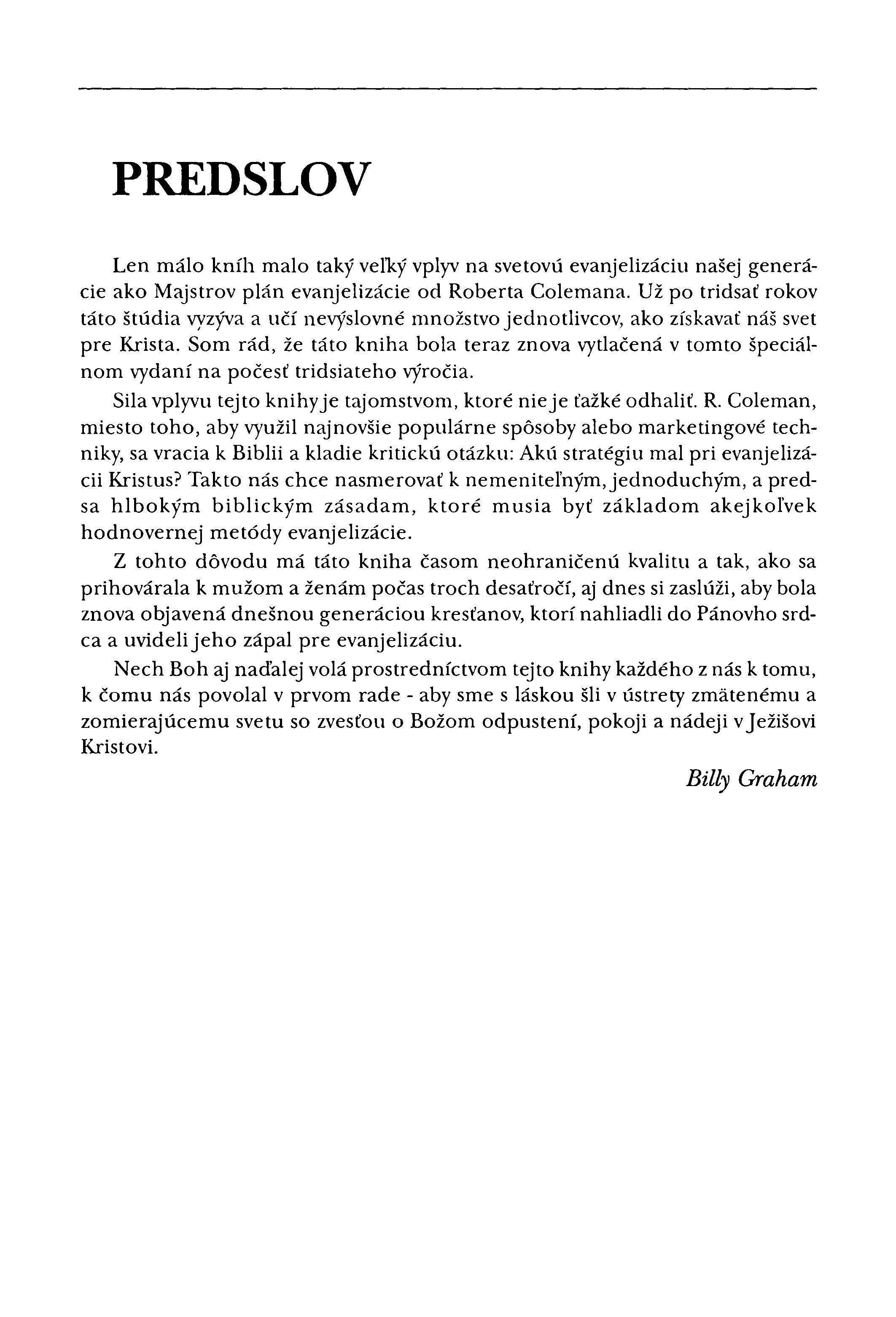 Len malo knfh malo taky velky vplyv na svetovu evanjelizaciu nasej generacie ako Majstrov plan evanjelizacie od Roberta Colemana. Uz po tridsar rokov tato studia vyzyva a ucf nevyslovne mnozstvo jednotlivcov, ako zfskavat nas svet pre Krista. Som rad, ze tato kniha bola teraz znova vytlacena v tomto specialnom vydanf na pocest tridsiateho vyrocia.