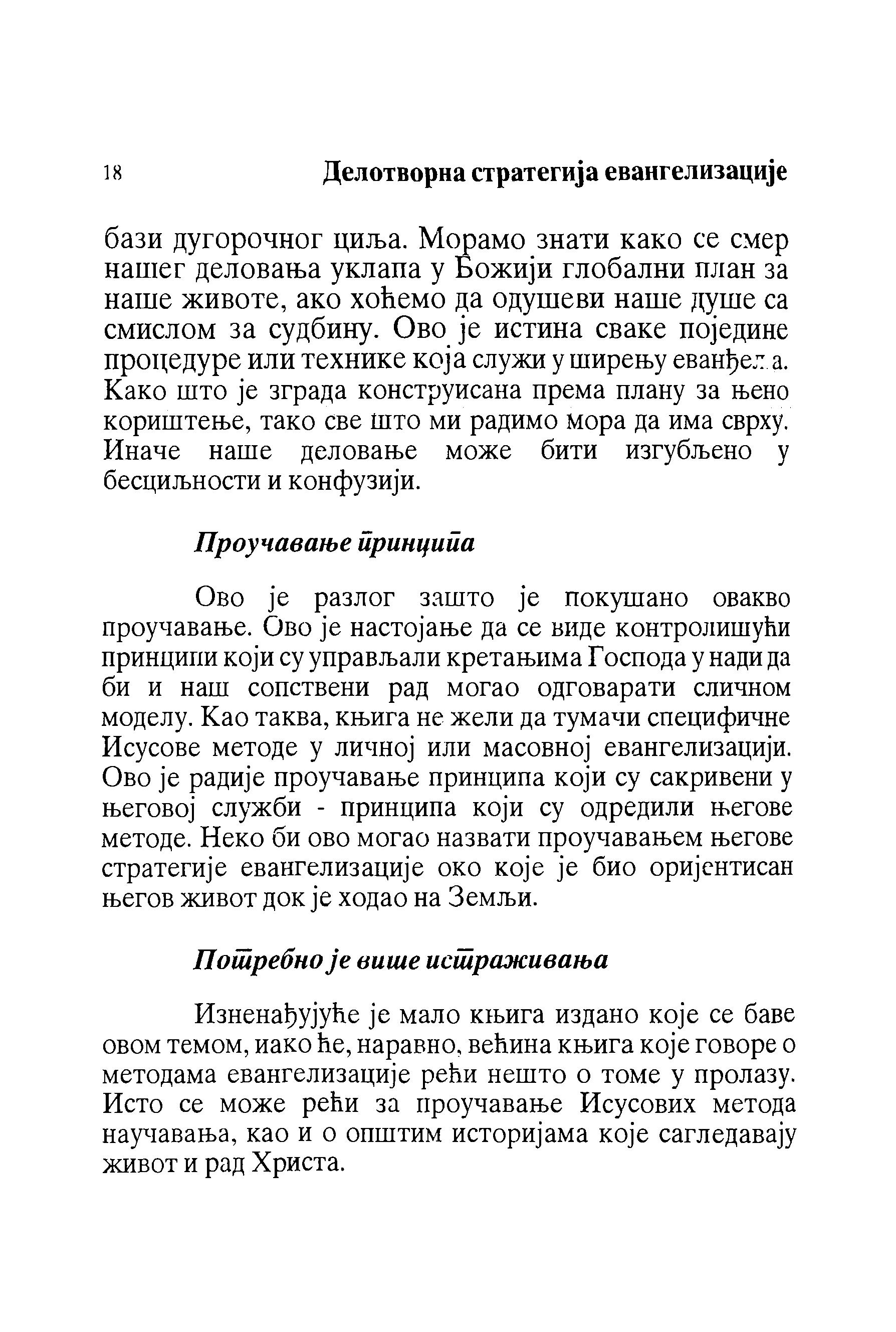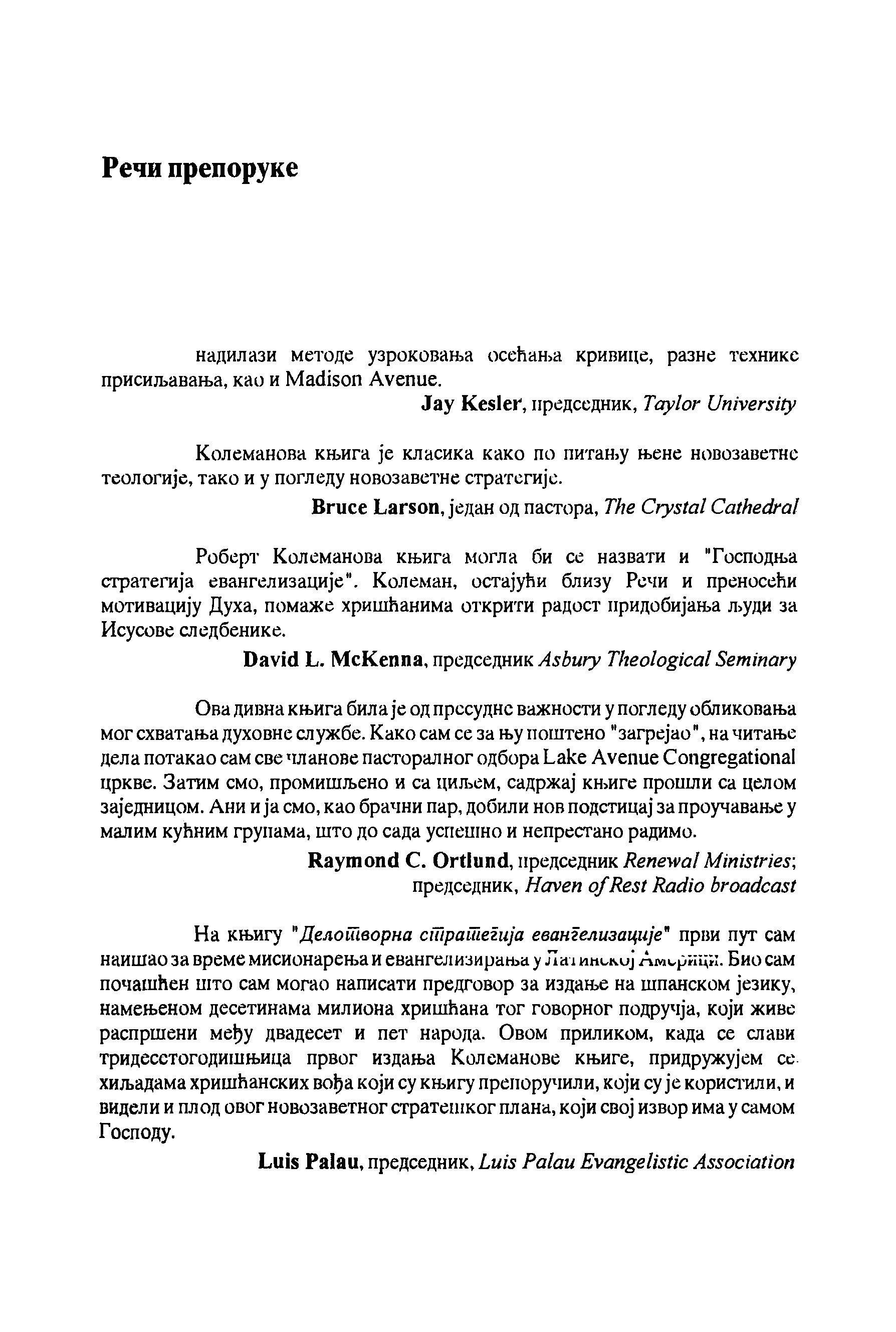 EBaHl)eJha,OTKplrnajyirn CBpxyXpHCTOBecJiy)K6eH JheroBy cTpaTernjy y lheHoM cnposol)elhy. Po6epT E. KoneMaH ce KOHIJ;eHTpmne Ha OCHOBHe rrpHHIJ;IUie KOjH cy yseK H3HOBa o;Qpel)HBaJIHKaKo he Mcyc ;QeJioBarny 6HJIOKojoj cinyau;HjH. Cne;QehH lheroB rrpHMep, 6Hhern crrpeMaH ;Qa cny)l{Hrn cneu;mpHtJHHMIlOTpe6aMa OHHXKoje Eor ;QOBe;Qe y TBOj )KHBOT. Y3 IIOMOh /1.EJIOTBOPHE CTPATEI'Jf]E EBAHI'EJIH3All,HJE, .AW)Kem 6HTHcHrypaH;Qahe ce TBoje eBaHreJIH3au;HjcKo ;QeJioBalhe yKJionHTH y Eo)l{Hjlf cBeo6yxBaTaHnJiaH BeJIRKor rrocnalha. CBaKHxp11rnhaHHH KOjHTe)KH;QaCJie;QHXpHCTaH CBe;QOtJH 3a lhera, 611Tpe6ao ;Qa rrpotJHTaosy 3HatJajHyH peneBaHTHYKlhHry.