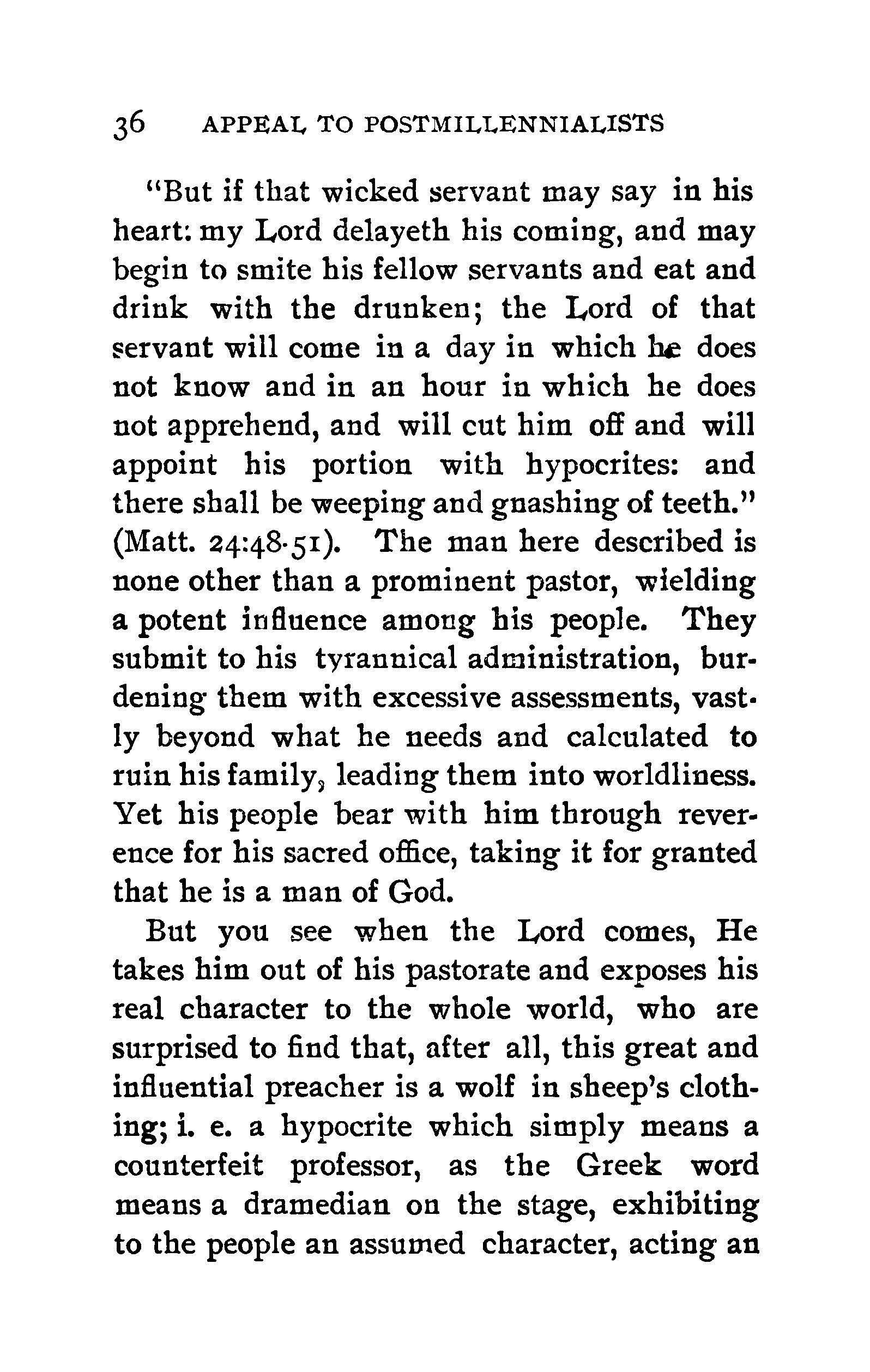 boy preacher positively specified that I was to "preach nothing but what I found in the Scriptures and could prove thereby." Under that solemn vow I never can preach the postmillennial view of the Lord's coming from the simple fact that it flatly and irreconcilably contradicts the very words of my blessed and glorious Lord.