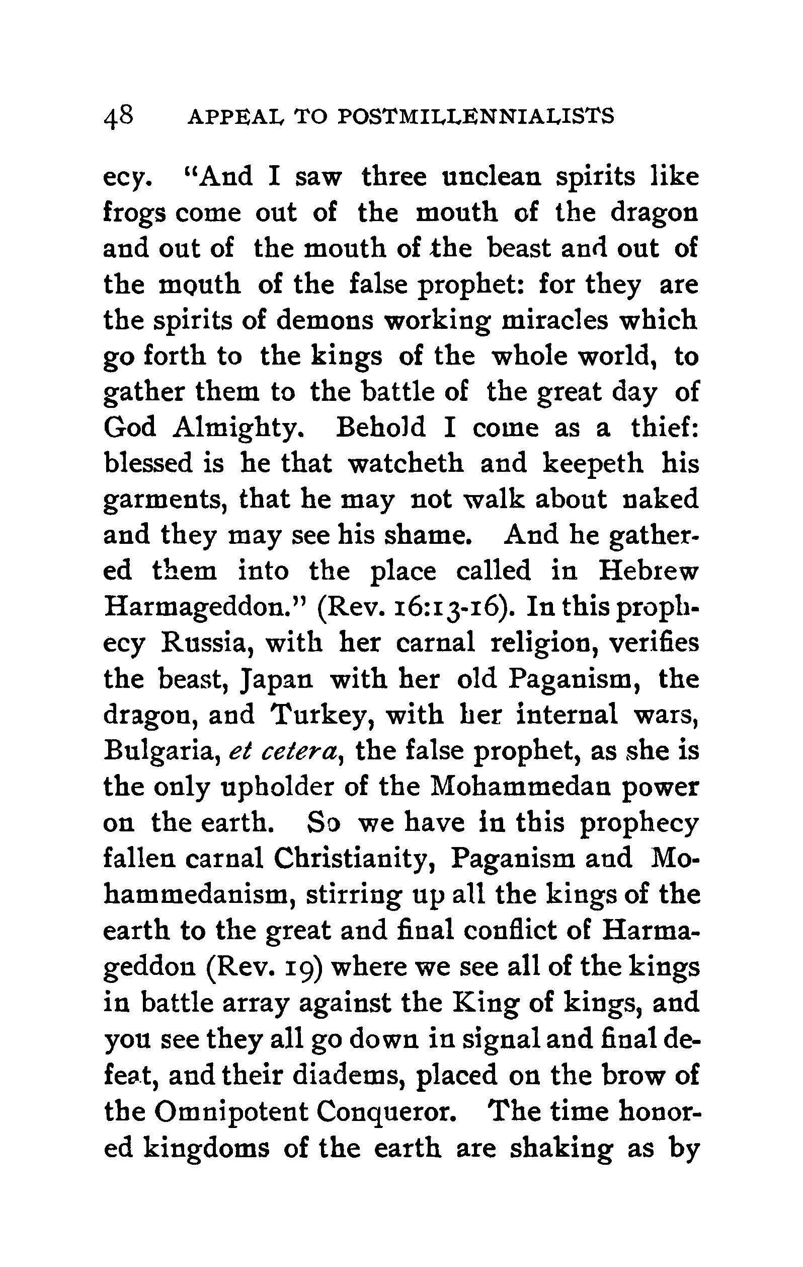 ecy. "And I saw three unclean spirits like frogs come out of the mouth of the dragon and out of the mouth of the beast and out of the mouth of the false prophet: for they are the spirits of demons working miracles which go forth to the kings of the whole world, to gather them to the battle of the great day of God Almighty. Behold I come as a thief: blessed is he that watcheth and keepeth his garments, that he may not walk about naked and they may see his shame. And he gathered them into the place called in Hebrew Harmageddon." (Rev. 16:13-16). In this prophecy Russia, with her carnal religion, verifies the beast, Japan with her old Paganism, the dragon, and Turkey, with her internal wars, Bulgaria, et cetera, the false prophet, as she is the only upholder of the Mohammedan power on the earth. So we have in this prophecy fallen carnal Christianity, Paganism and Mohammedanism, stirring up all the kings of the earth to the great and final conflict of Harmageddon (Rev. 19) where we see all of the kings in battle array against the King of kings, and you see they all go down in signal and final defe~.t, and their diadems, placed on the brow of the Omnipotent Conqueror. The time honored kingdoms of the earth are shaking as by