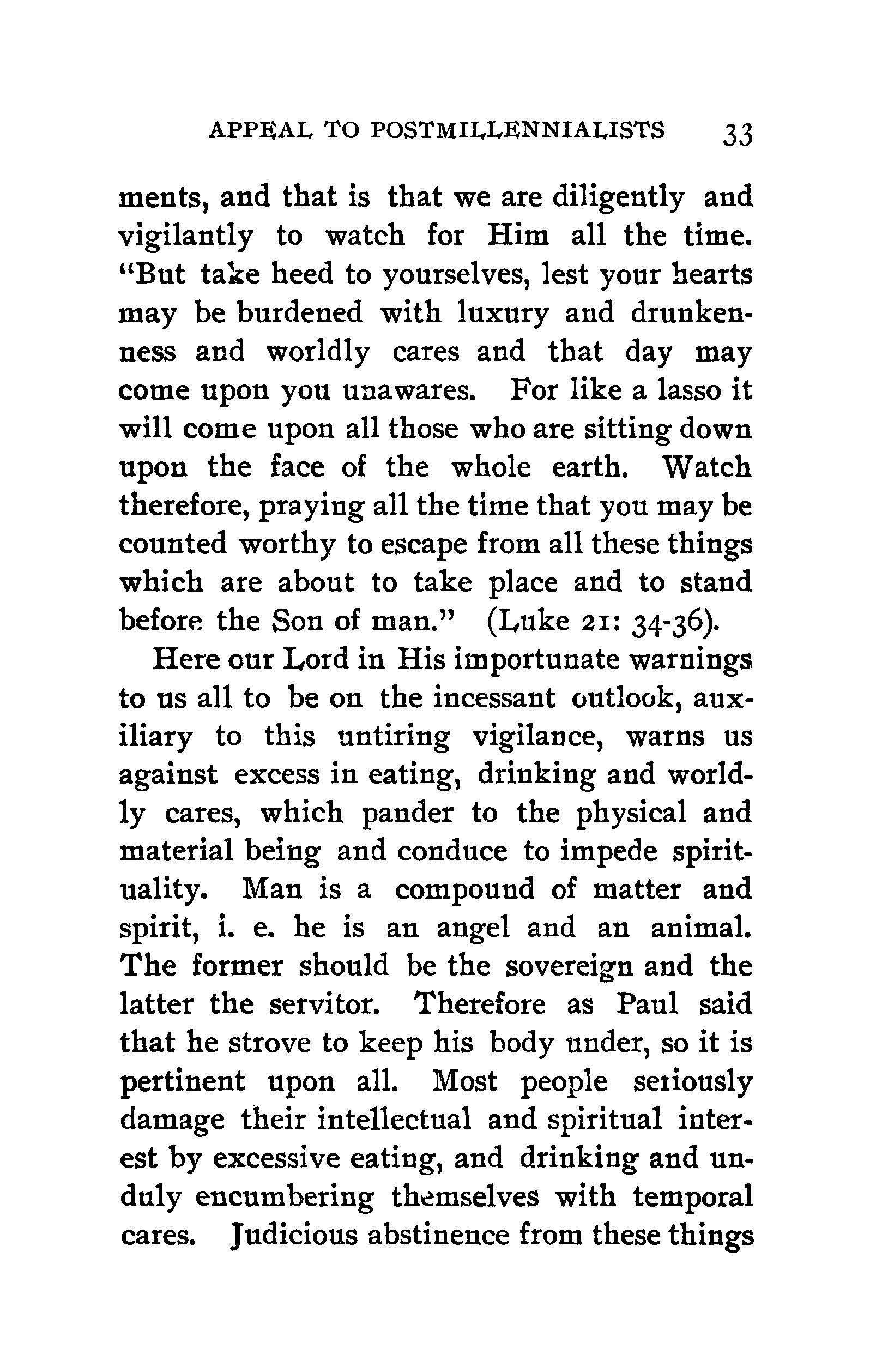 You are bound to admit that any doctrine whatever that disqualifies us to obey the Lord is false. There is not a sensible person in the world who cannot see the utter irreconcilability of the postmillennial view with a constant outlook for His appearing. The postmillen-