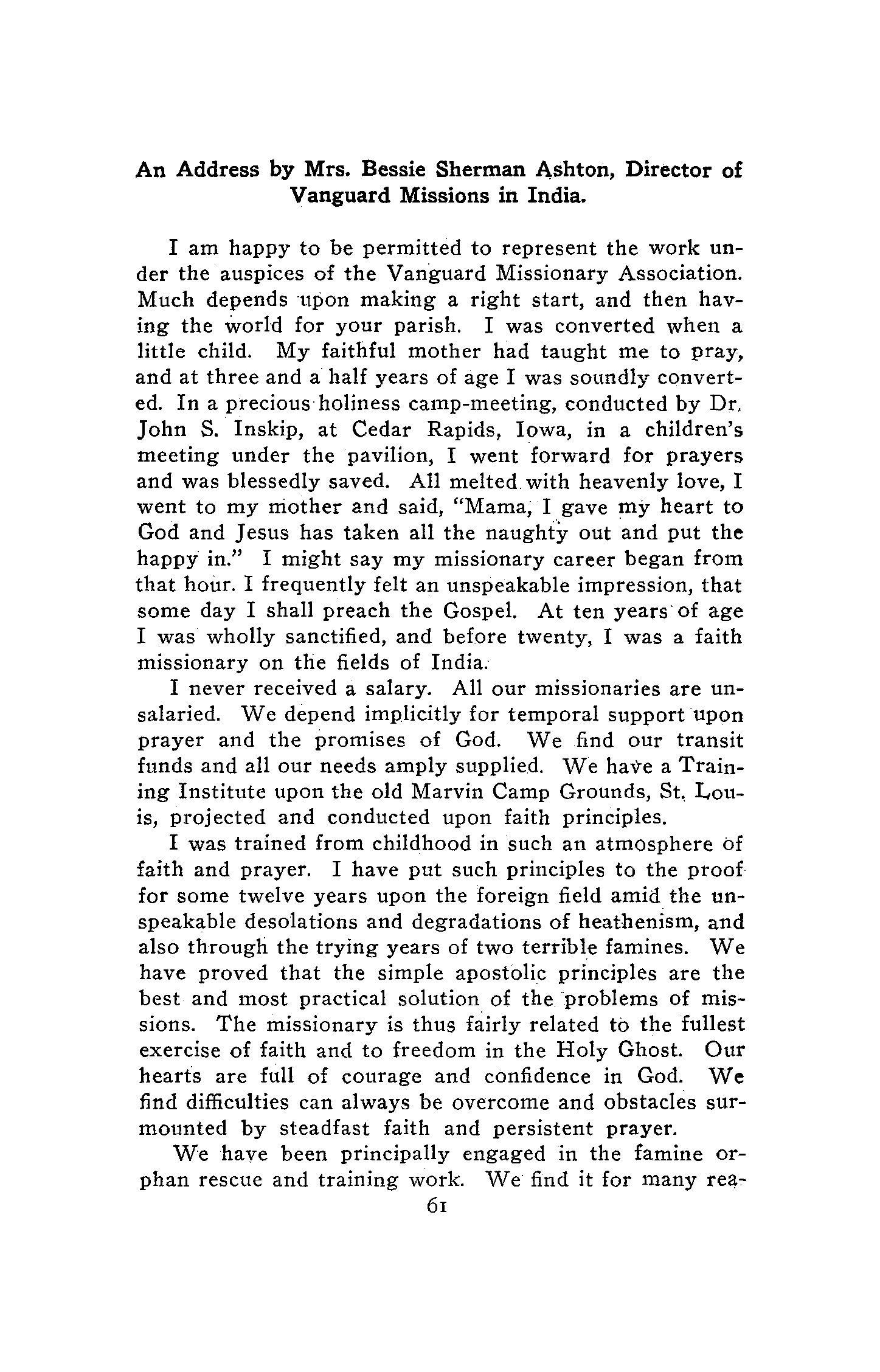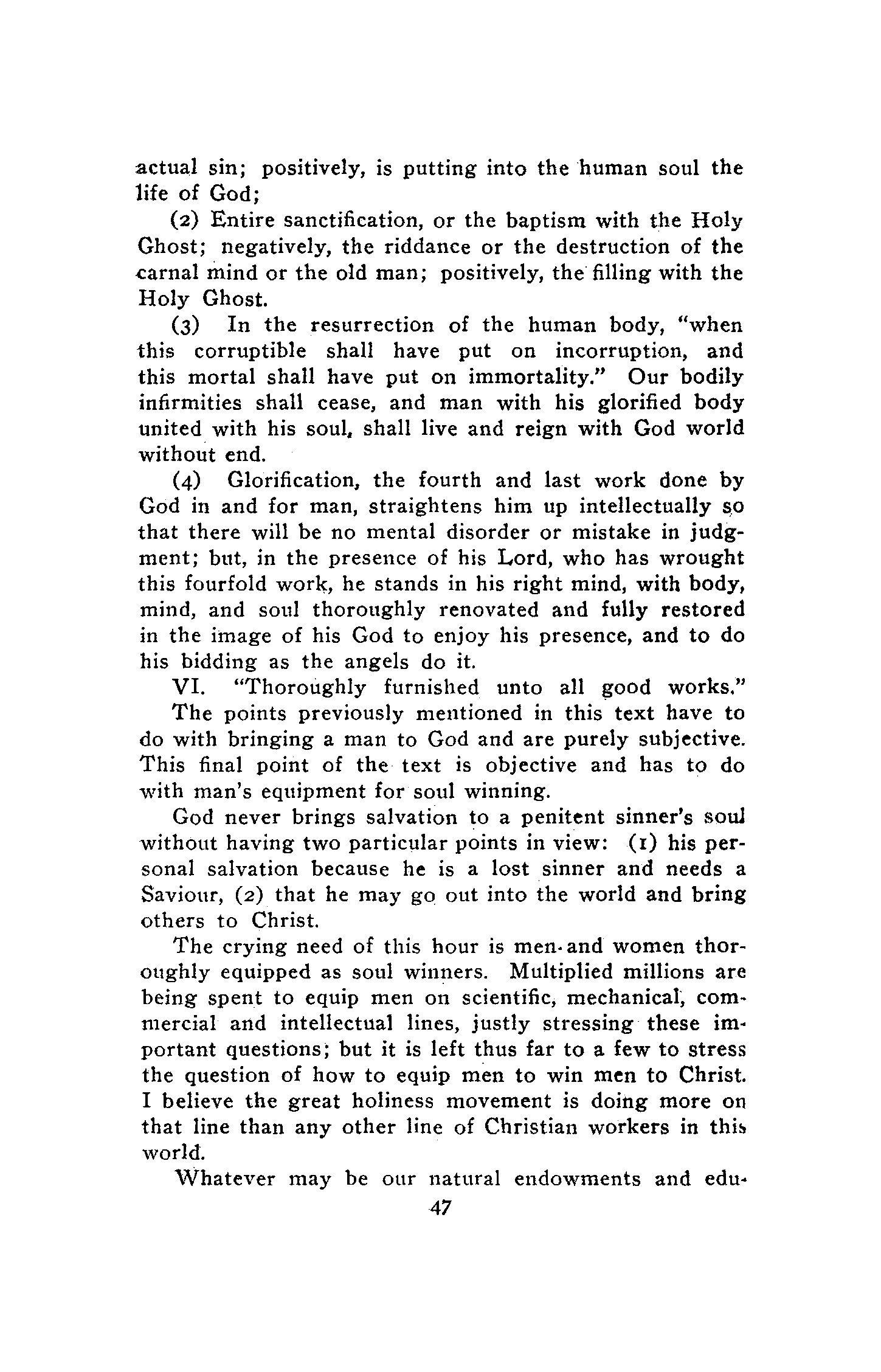 Another thing: the holiness crowd is doing more for the reclamation of the backslider and his restoration to the church and a useful life than any other class of the ministry. Nearly all that is being done on that line is by preachers baptized with the Holy Ghost. The churches are mainly working for conversions outside of the fold and for "joiners."