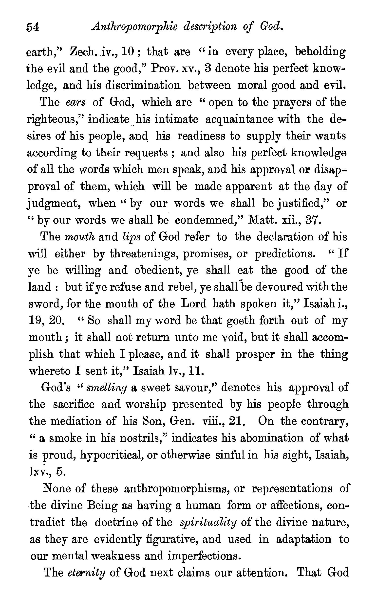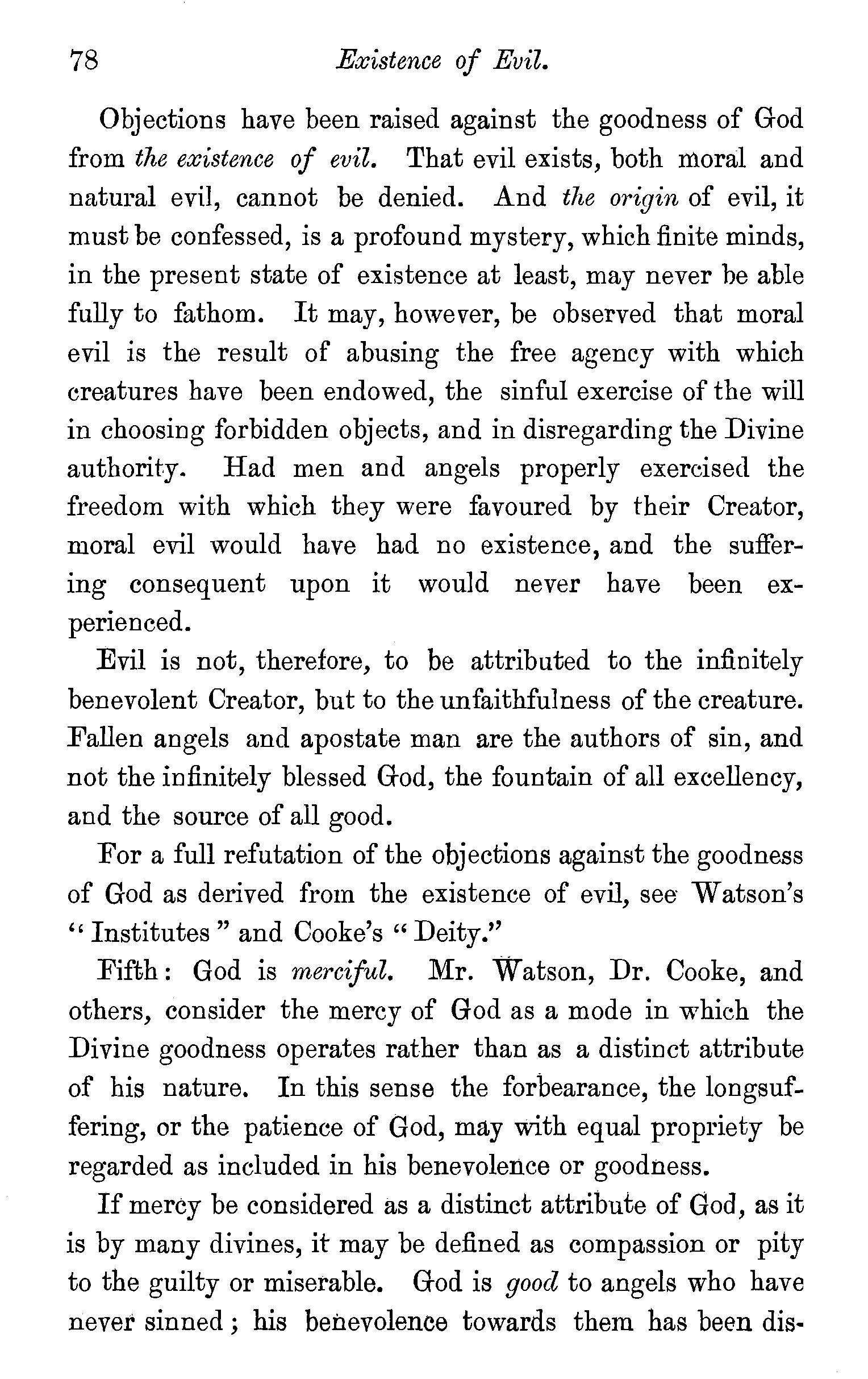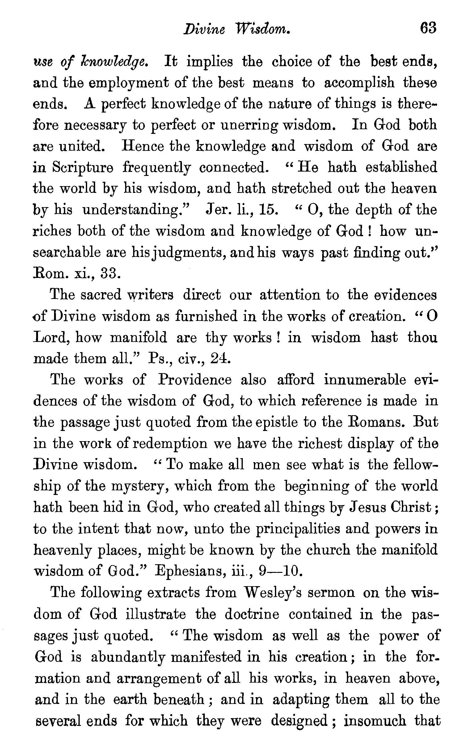 Classification of God's attributes-Unity-Spirituality-Anthropomorphic description of God-Eternity of God-Independence -Immutability-Omnipresence -Omniscience -Dr. A. Clarke's views on God's Omniscience controverted-Divine wisdomWesley and Howe's views of Divine wisdom -OmnipotenceOmnipotence regulated by wisdom-Questions . 52