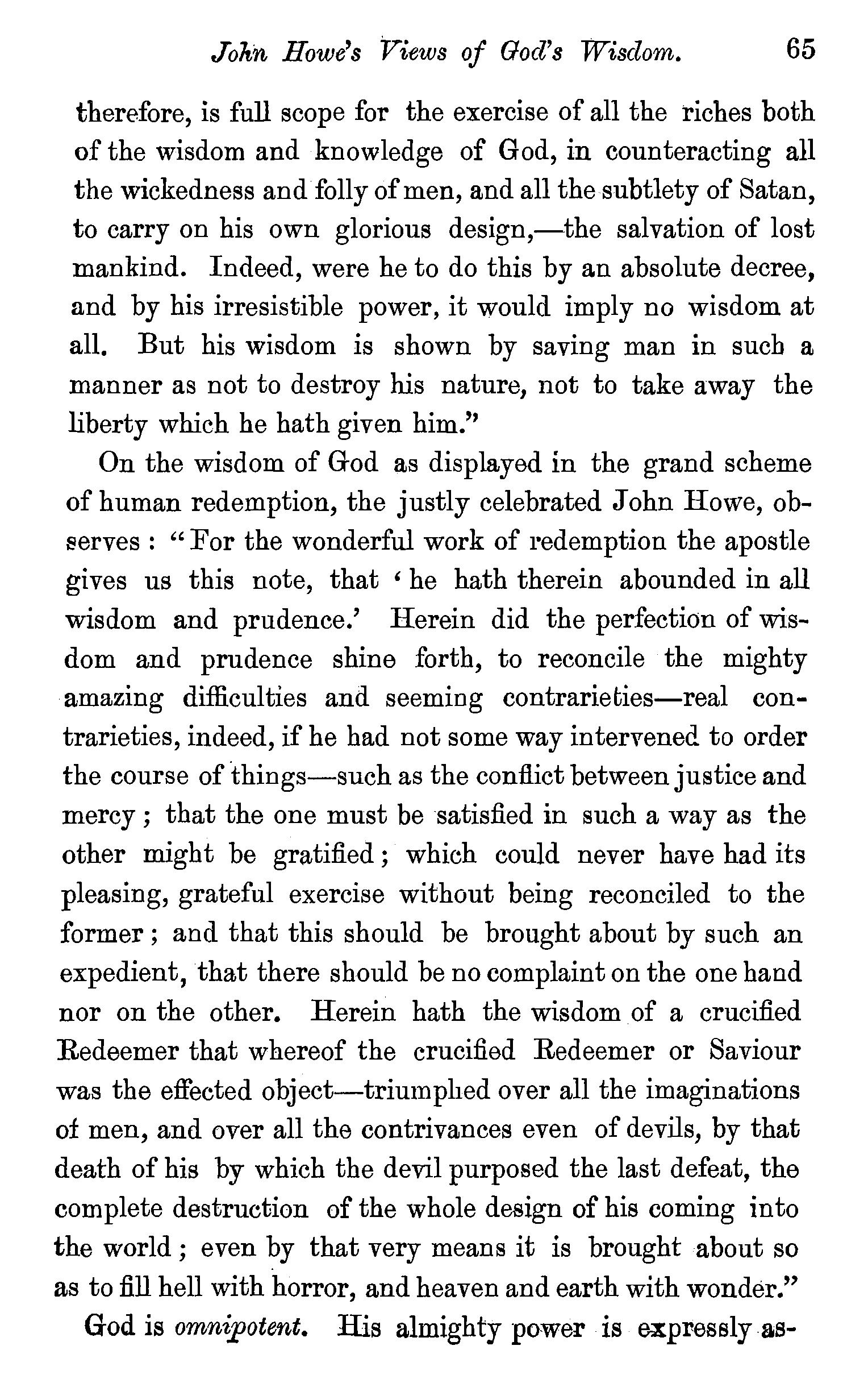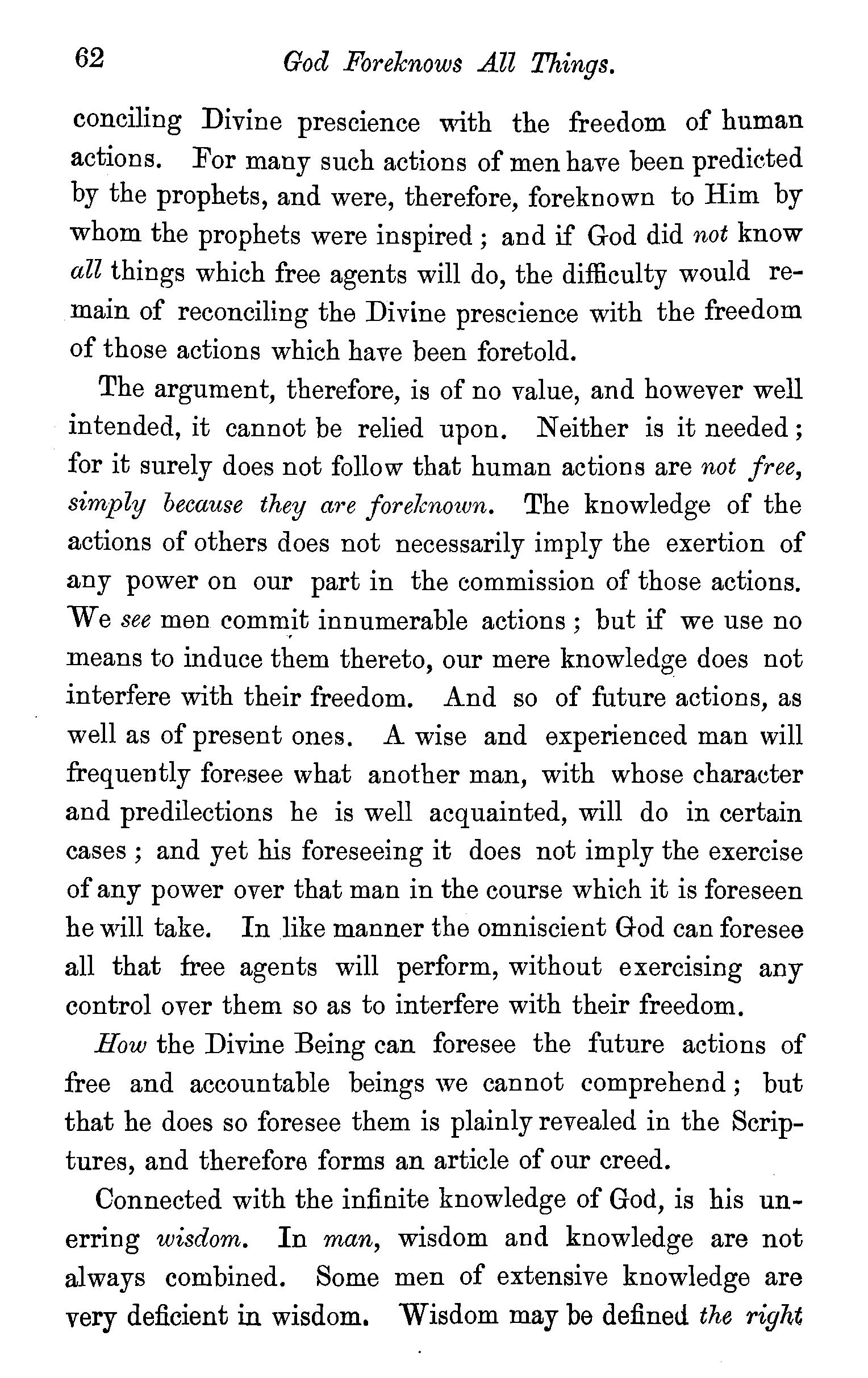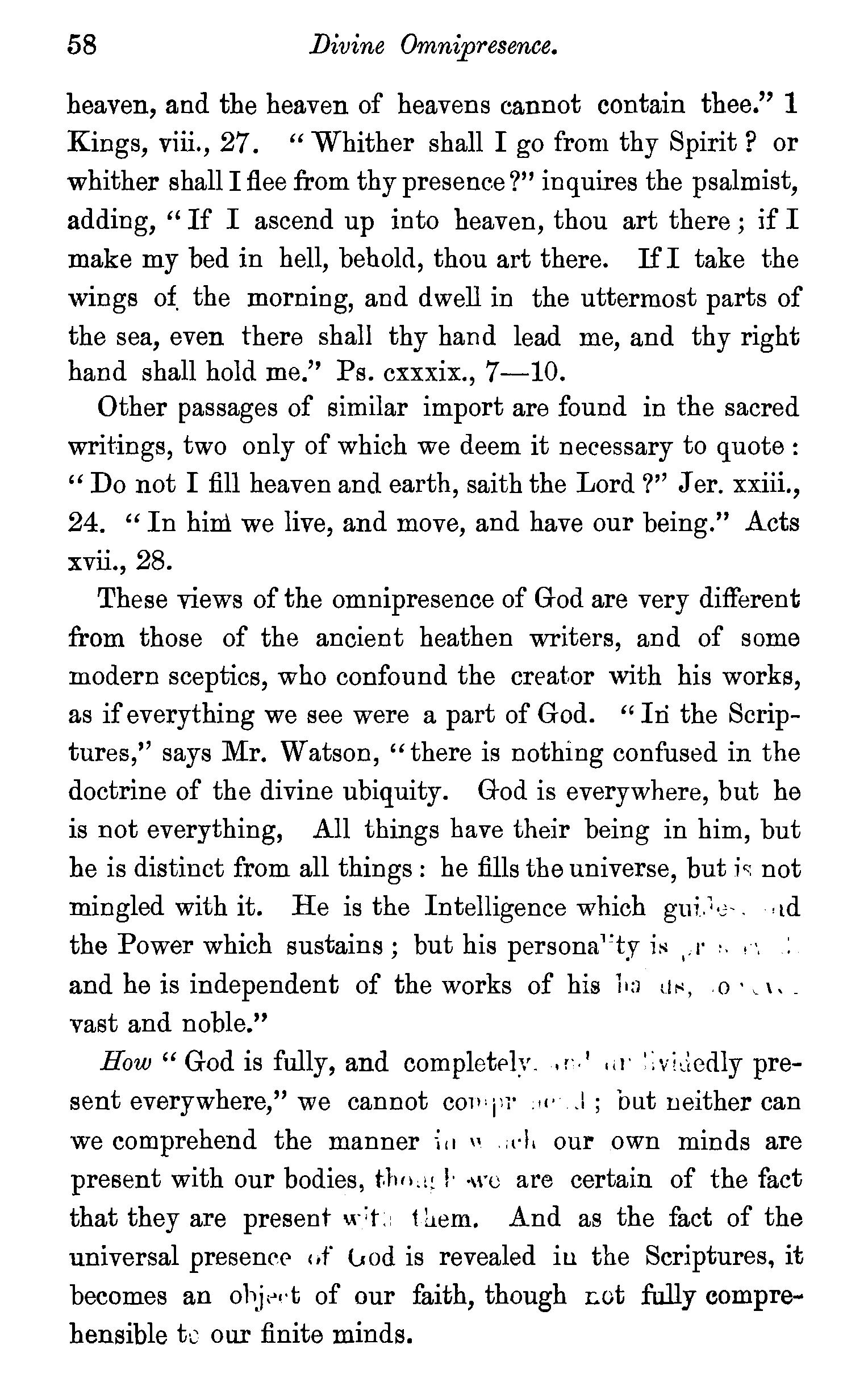 Classification of God's attributes-Unity-Spirituality-Anthropomorphic description of God-Eternity of God-Independence -Immutability-Omnipresence -Omniscience -Dr. A. Clarke's views on God's Omniscience controverted-Divine wisdomWesley and Howe's views of Divine wisdom -OmnipotenceOmnipotence regulated by wisdom-Questions . 52