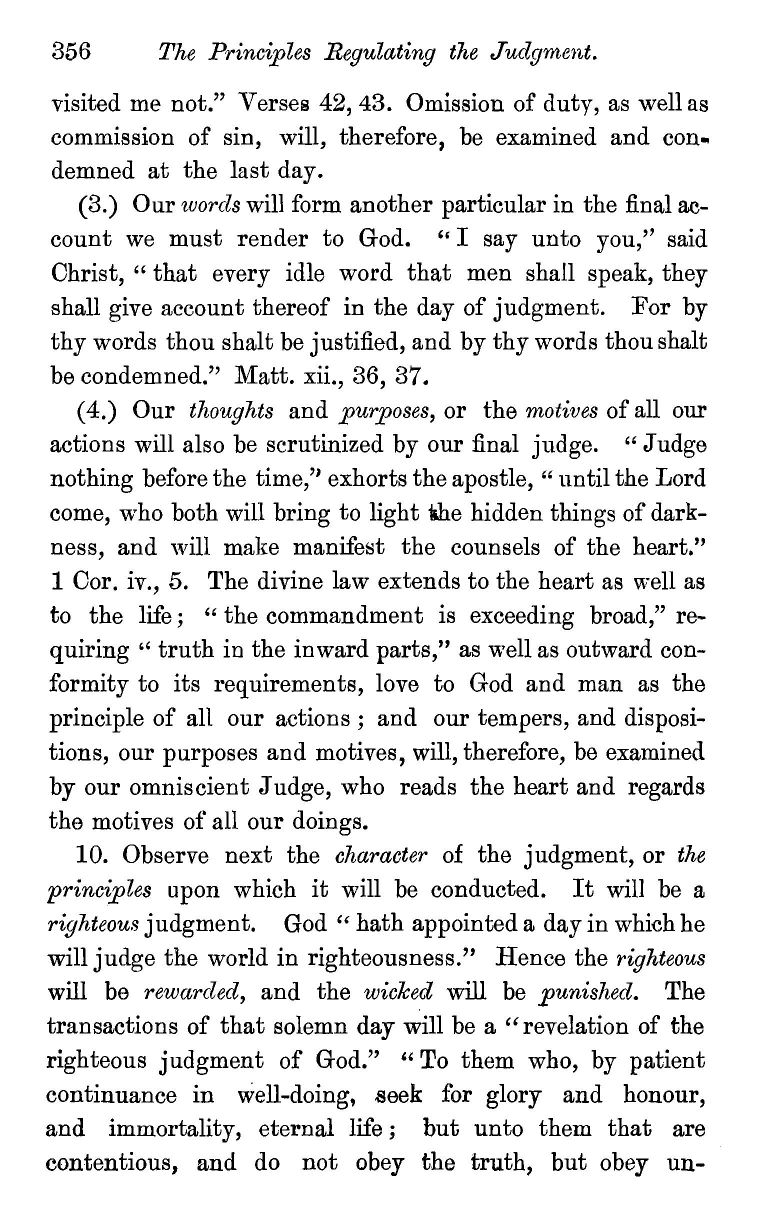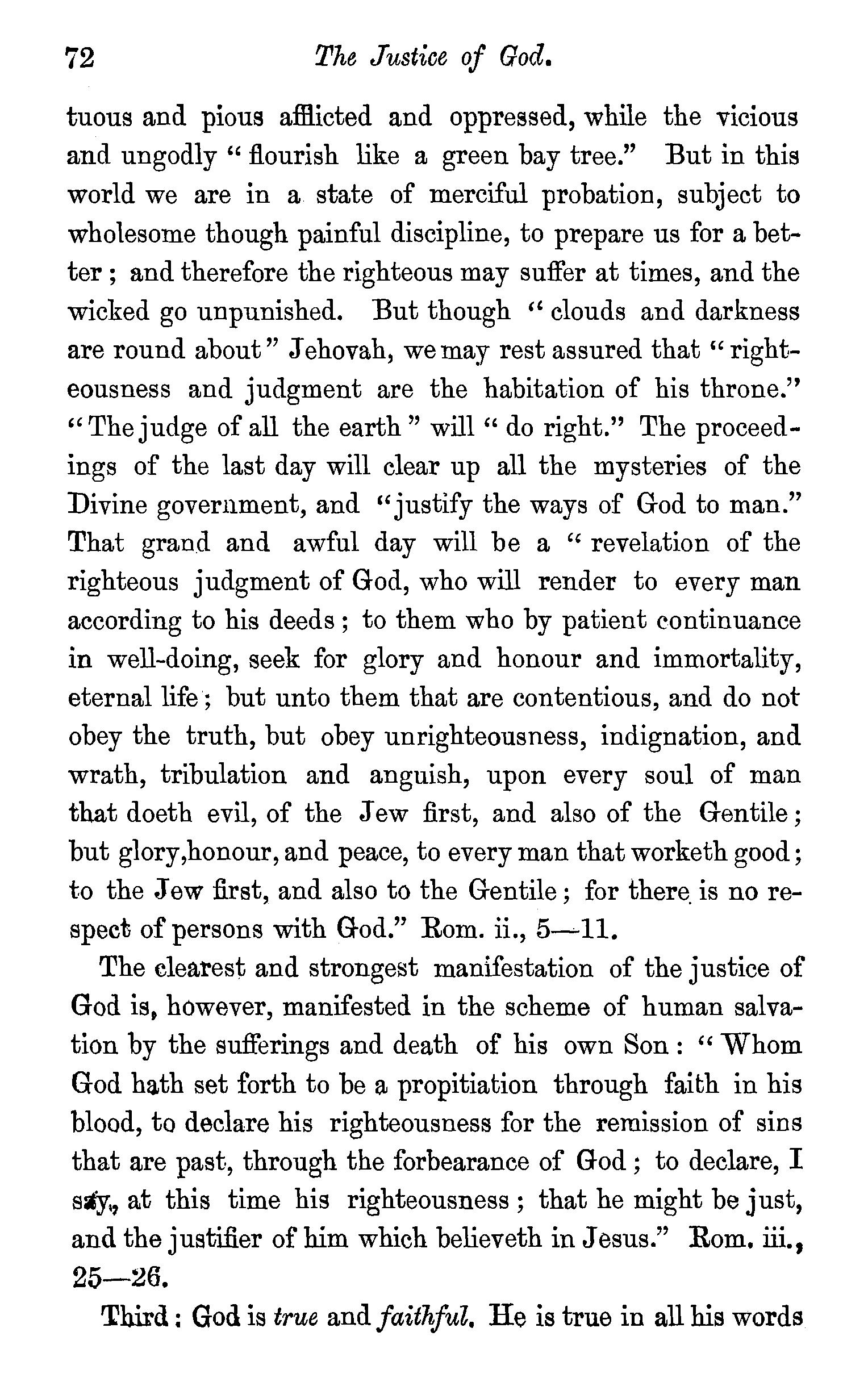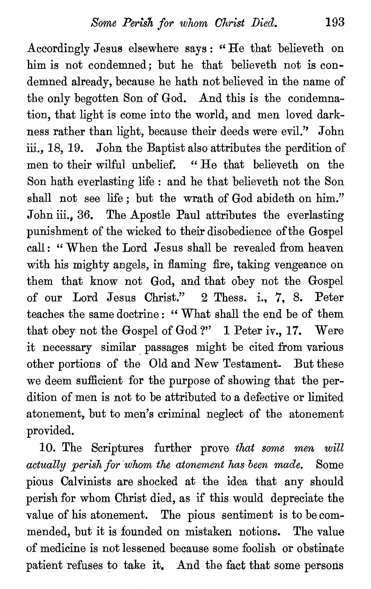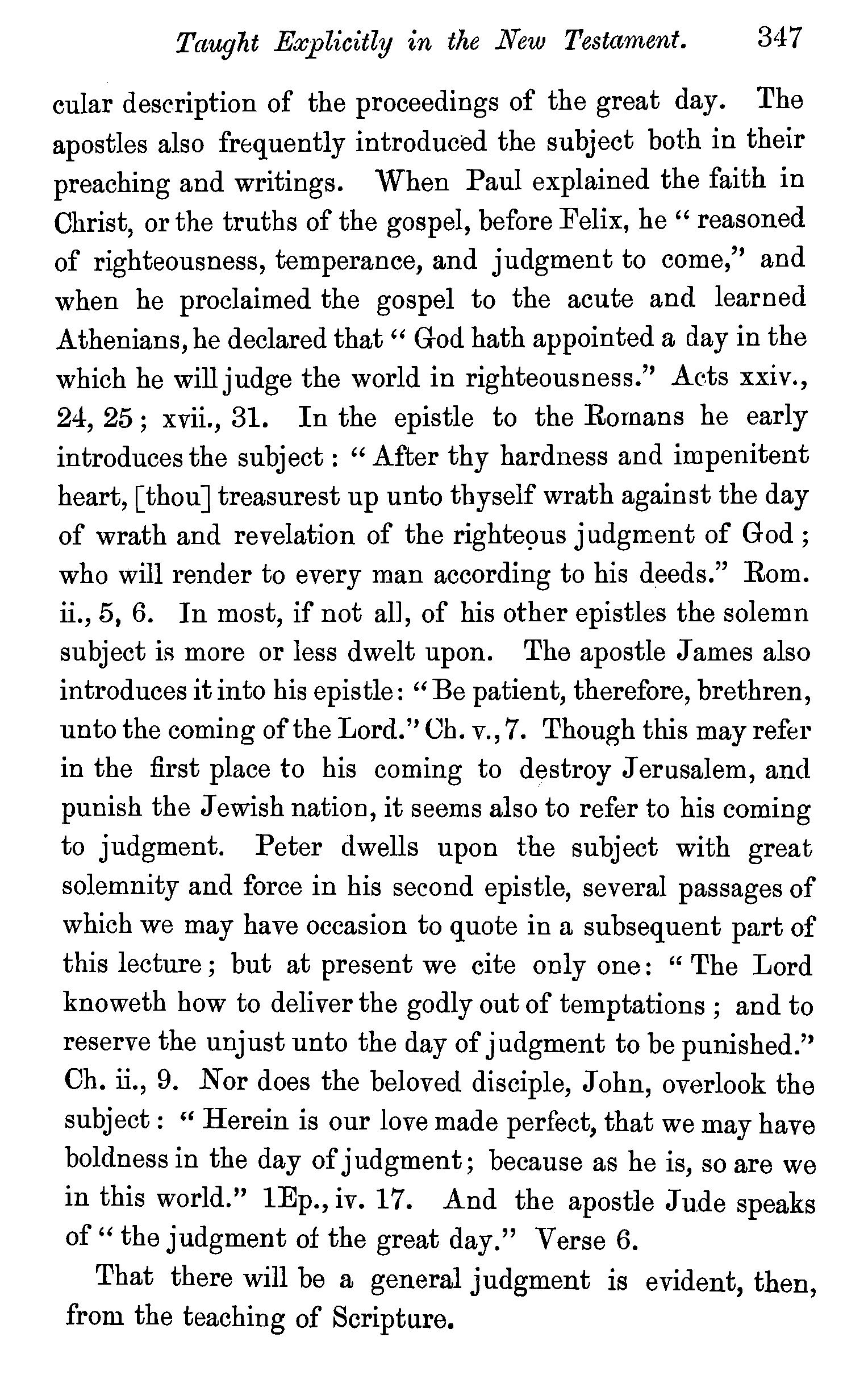 One other passage quoted by the Universalists in support of their doctrine, 1 Peter iii., 18, in which Christ is represented as "preaching to the spirits in prison," remains to be noticed. We stay not to give our reasons for accepting the generally received opinion among orthodox divines, that the apostle here means that Christ by his Spirit preached in the ministry of Noah to those disobedient spirits who were afterwards shut up in prison for thefr incorrigible wickedness, but content ourselves with remarking that the apostle does not give the least intimation that any of these" spirits in prison'' were liberated through the Saviour's preaching, and that, therefore, whatsoever may be the precise meaning of the passage, it cannot fairly be made to bend in favour of the Universalist's theory of the final salvation of all men. We have now carefully examined the most important passages in the Word of God, which have been supposed to teach the opposite doctrine of eternal punishment, and have