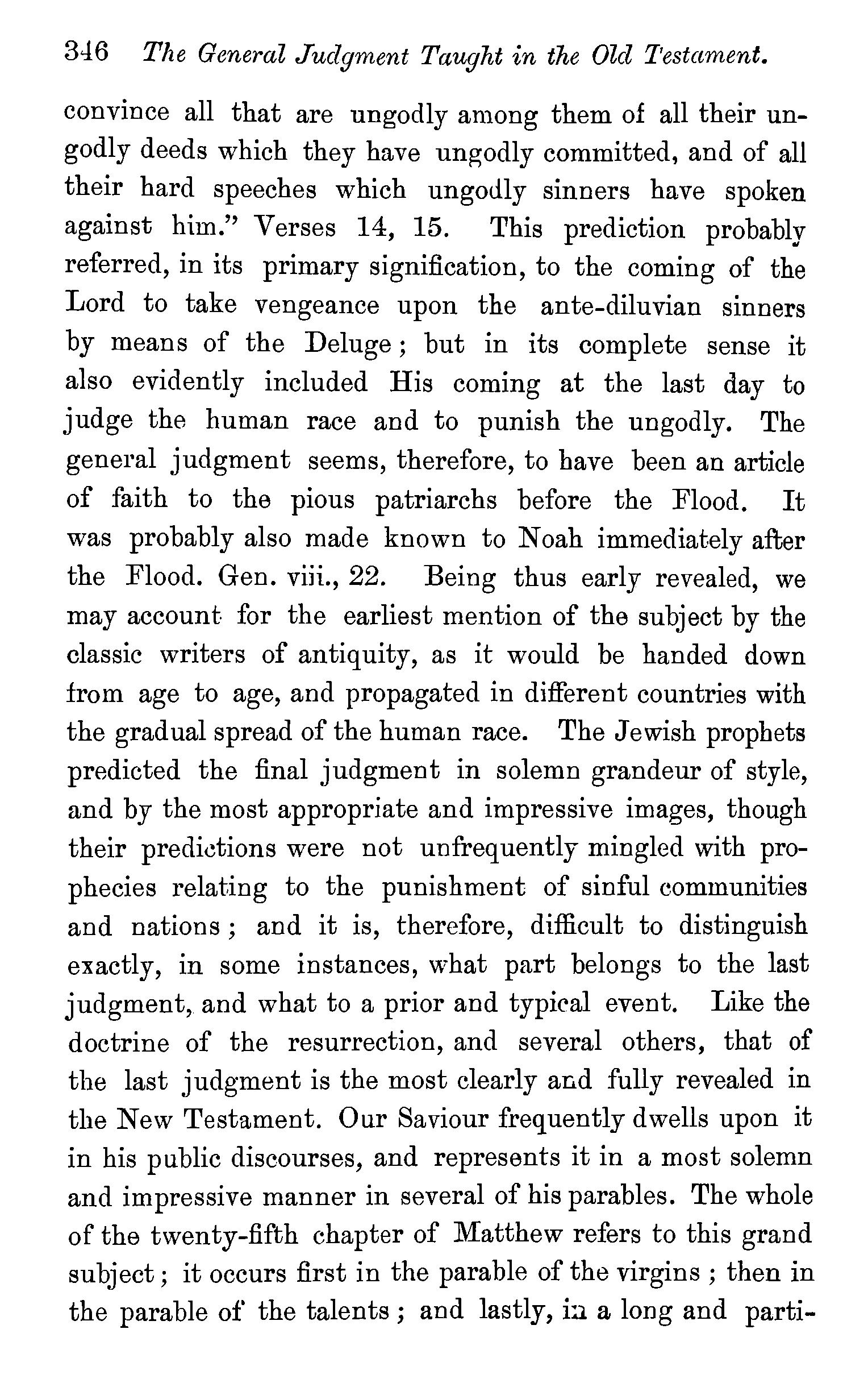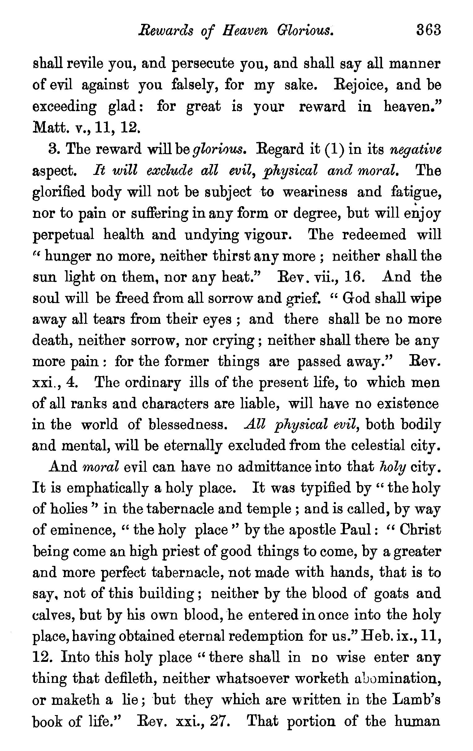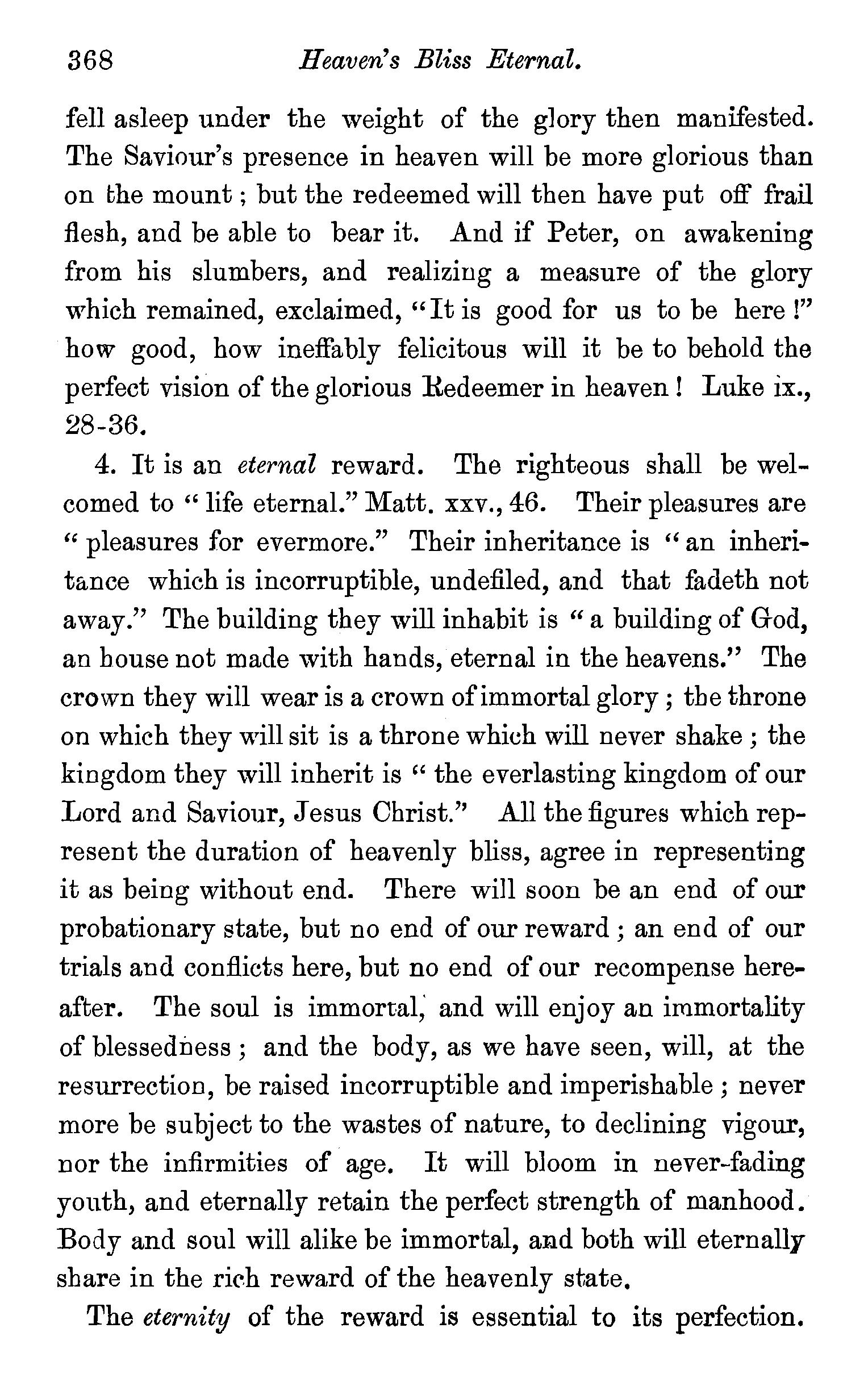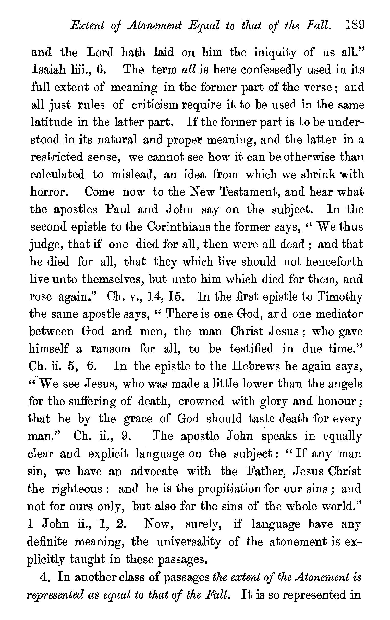 One other passage quoted by the Universalists in support of their doctrine, 1 Peter iii., 18, in which Christ is represented as "preaching to the spirits in prison," remains to be noticed. We stay not to give our reasons for accepting the generally received opinion among orthodox divines, that the apostle here means that Christ by his Spirit preached in the ministry of Noah to those disobedient spirits who were afterwards shut up in prison for thefr incorrigible wickedness, but content ourselves with remarking that the apostle does not give the least intimation that any of these" spirits in prison'' were liberated through the Saviour's preaching, and that, therefore, whatsoever may be the precise meaning of the passage, it cannot fairly be made to bend in favour of the Universalist's theory of the final salvation of all men. We have now carefully examined the most important passages in the Word of God, which have been supposed to teach the opposite doctrine of eternal punishment, and have