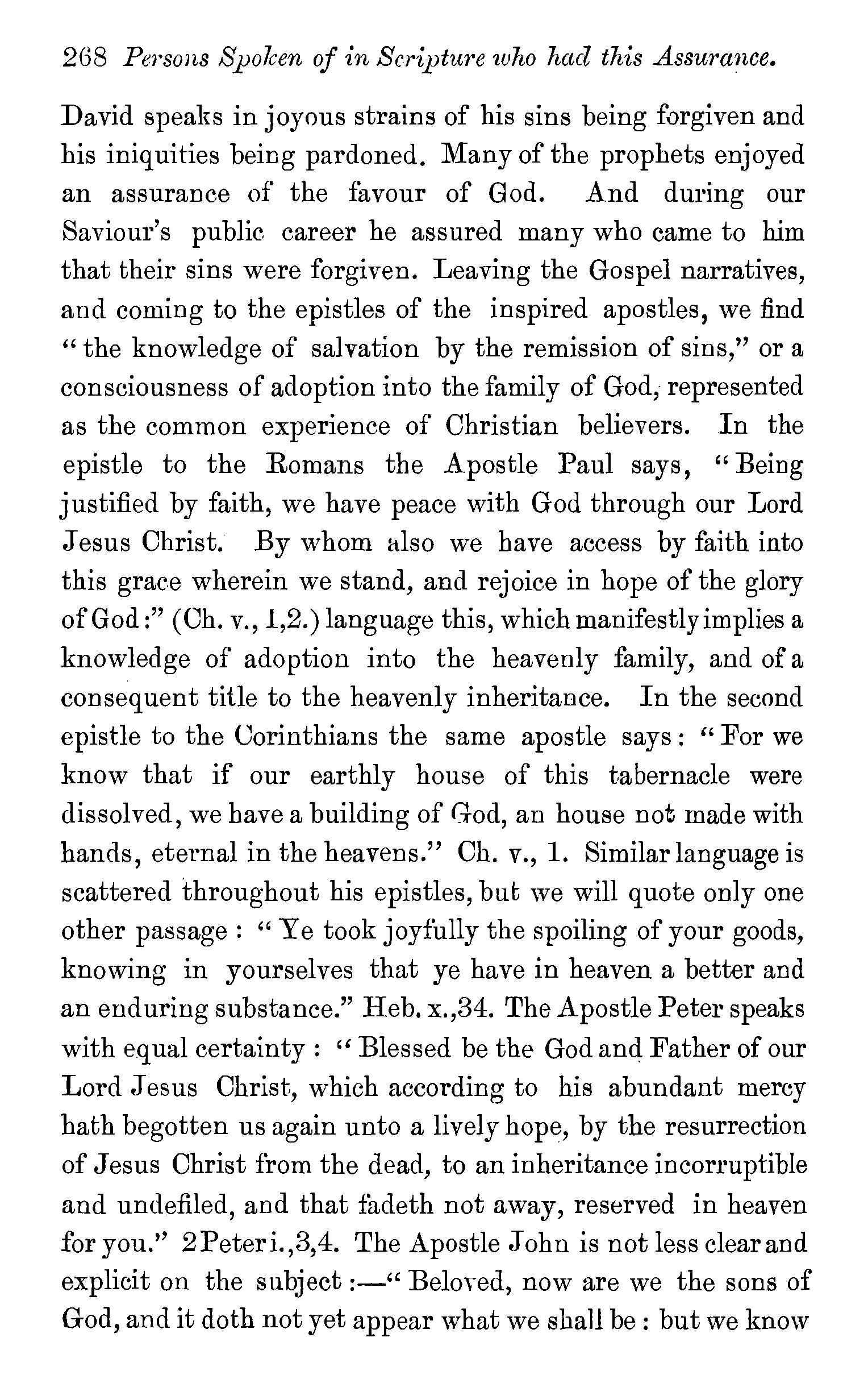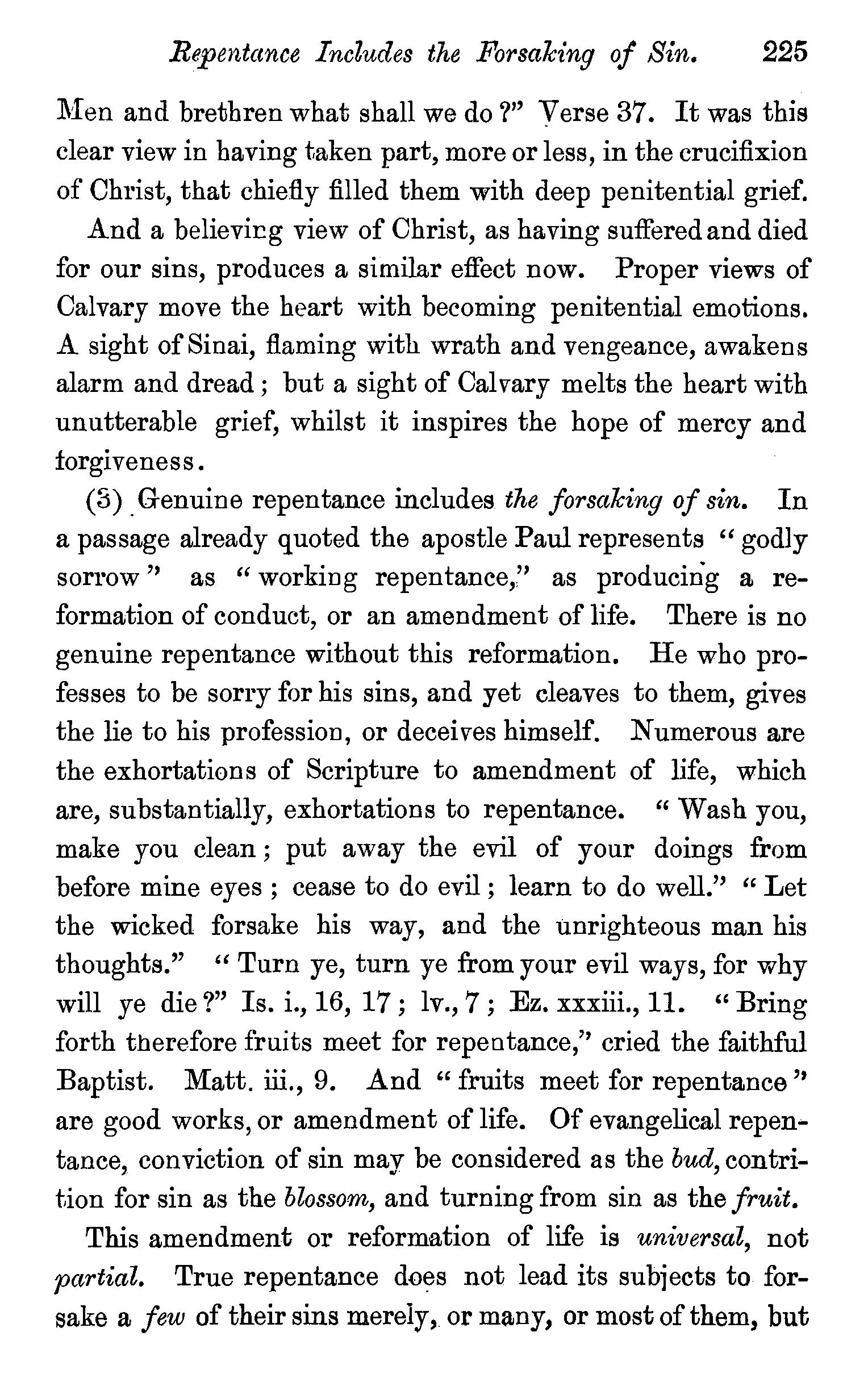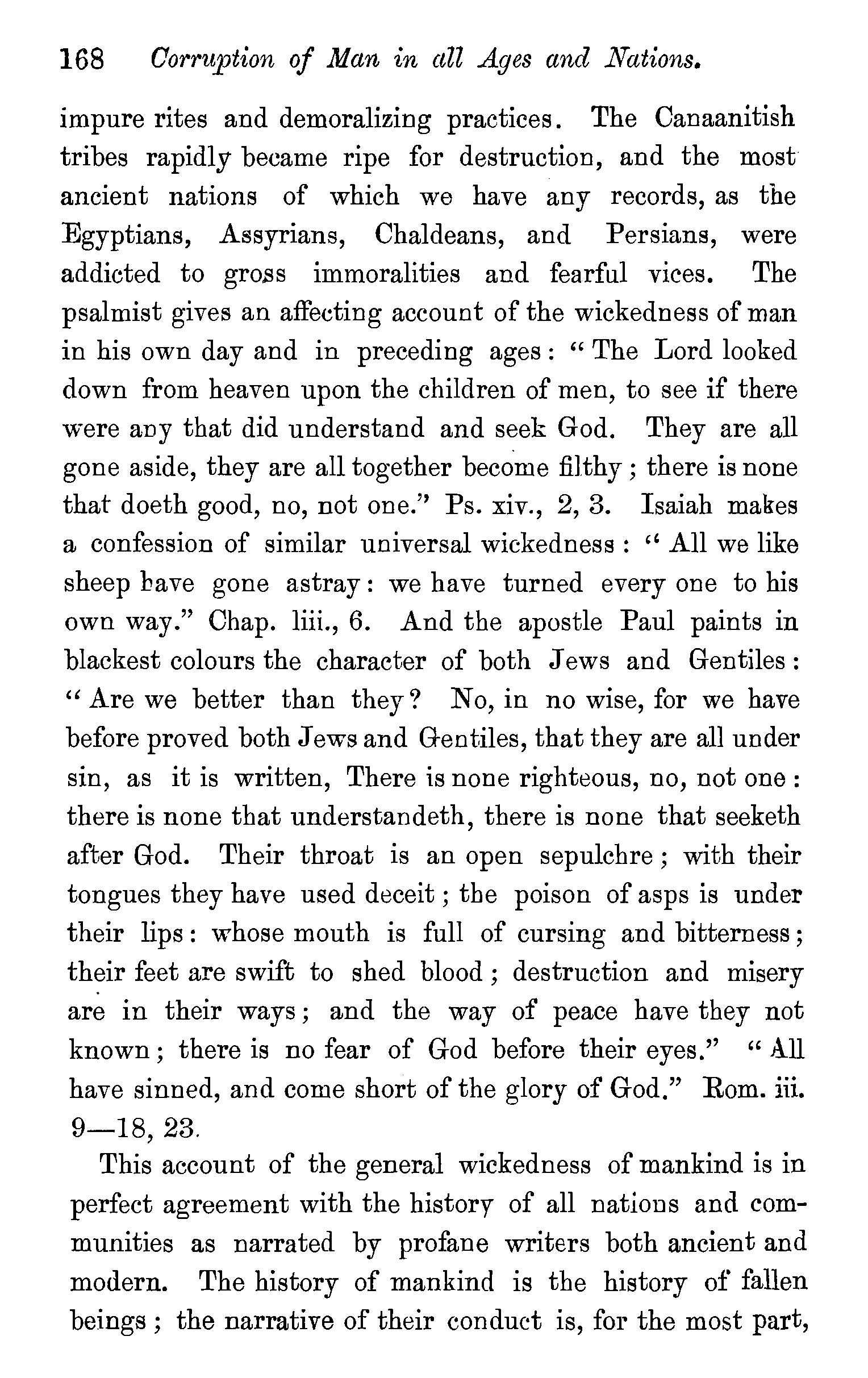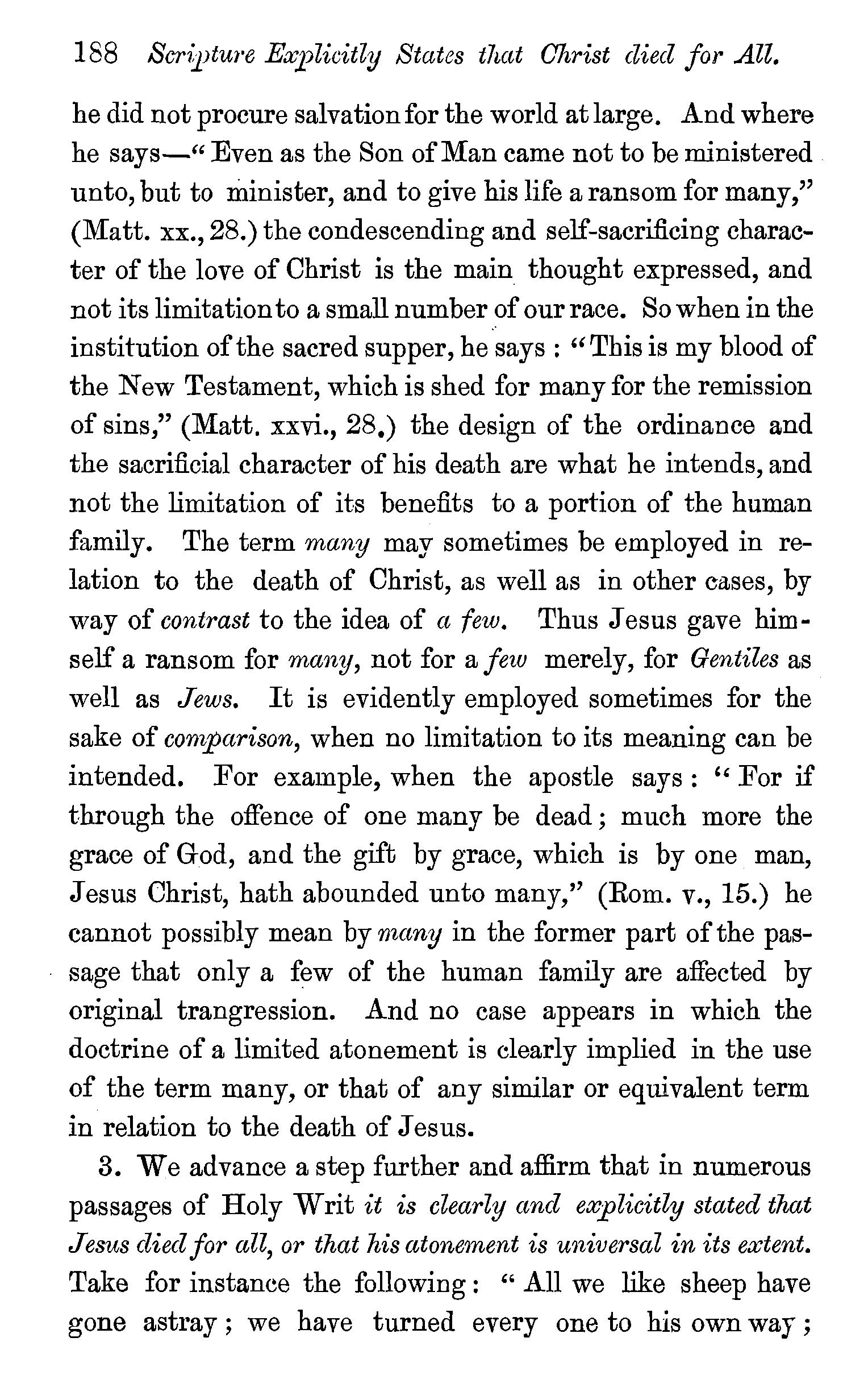 One other passage quoted by the Universalists in support of their doctrine, 1 Peter iii., 18, in which Christ is represented as "preaching to the spirits in prison," remains to be noticed. We stay not to give our reasons for accepting the generally received opinion among orthodox divines, that the apostle here means that Christ by his Spirit preached in the ministry of Noah to those disobedient spirits who were afterwards shut up in prison for thefr incorrigible wickedness, but content ourselves with remarking that the apostle does not give the least intimation that any of these" spirits in prison'' were liberated through the Saviour's preaching, and that, therefore, whatsoever may be the precise meaning of the passage, it cannot fairly be made to bend in favour of the Universalist's theory of the final salvation of all men. We have now carefully examined the most important passages in the Word of God, which have been supposed to teach the opposite doctrine of eternal punishment, and have