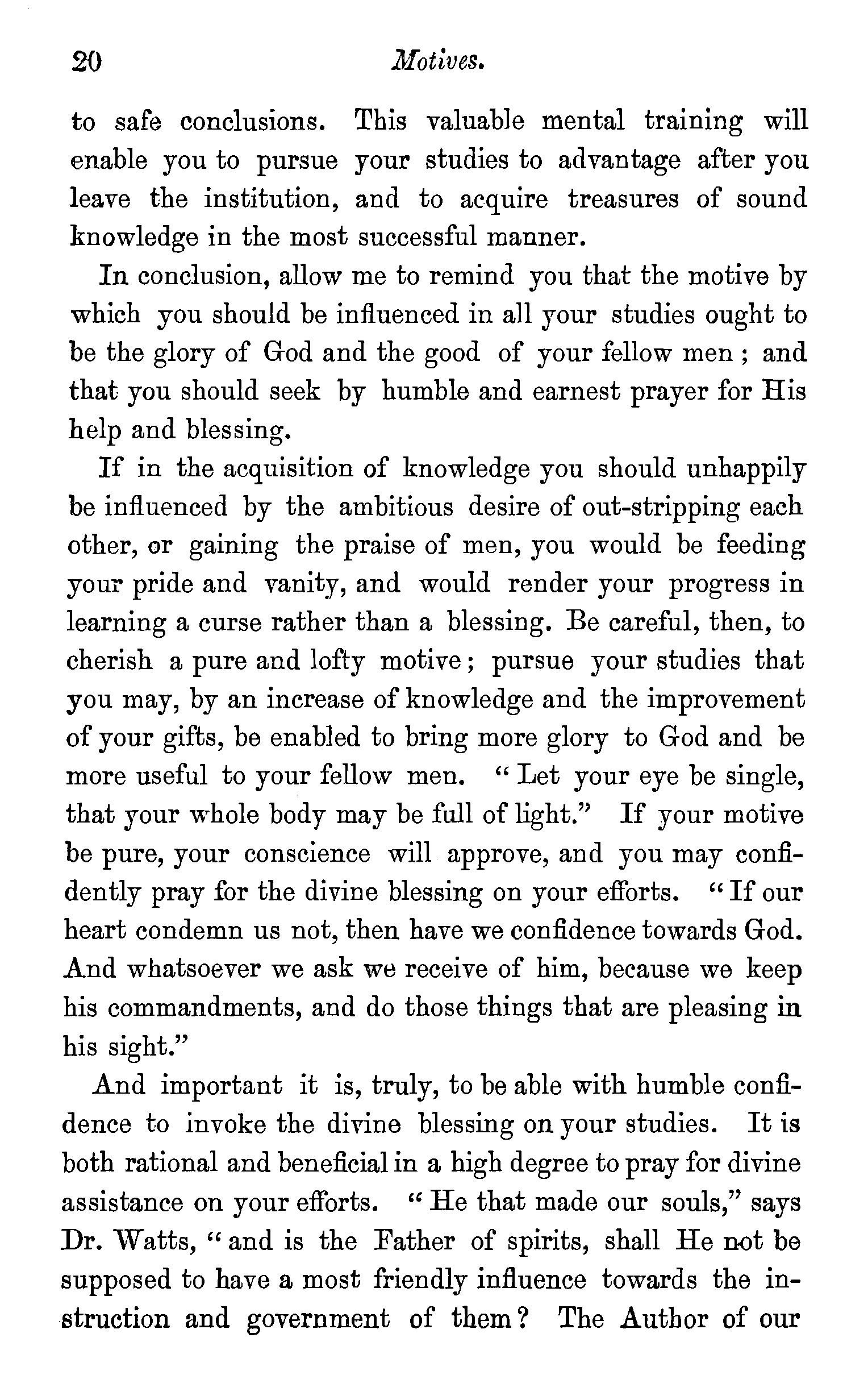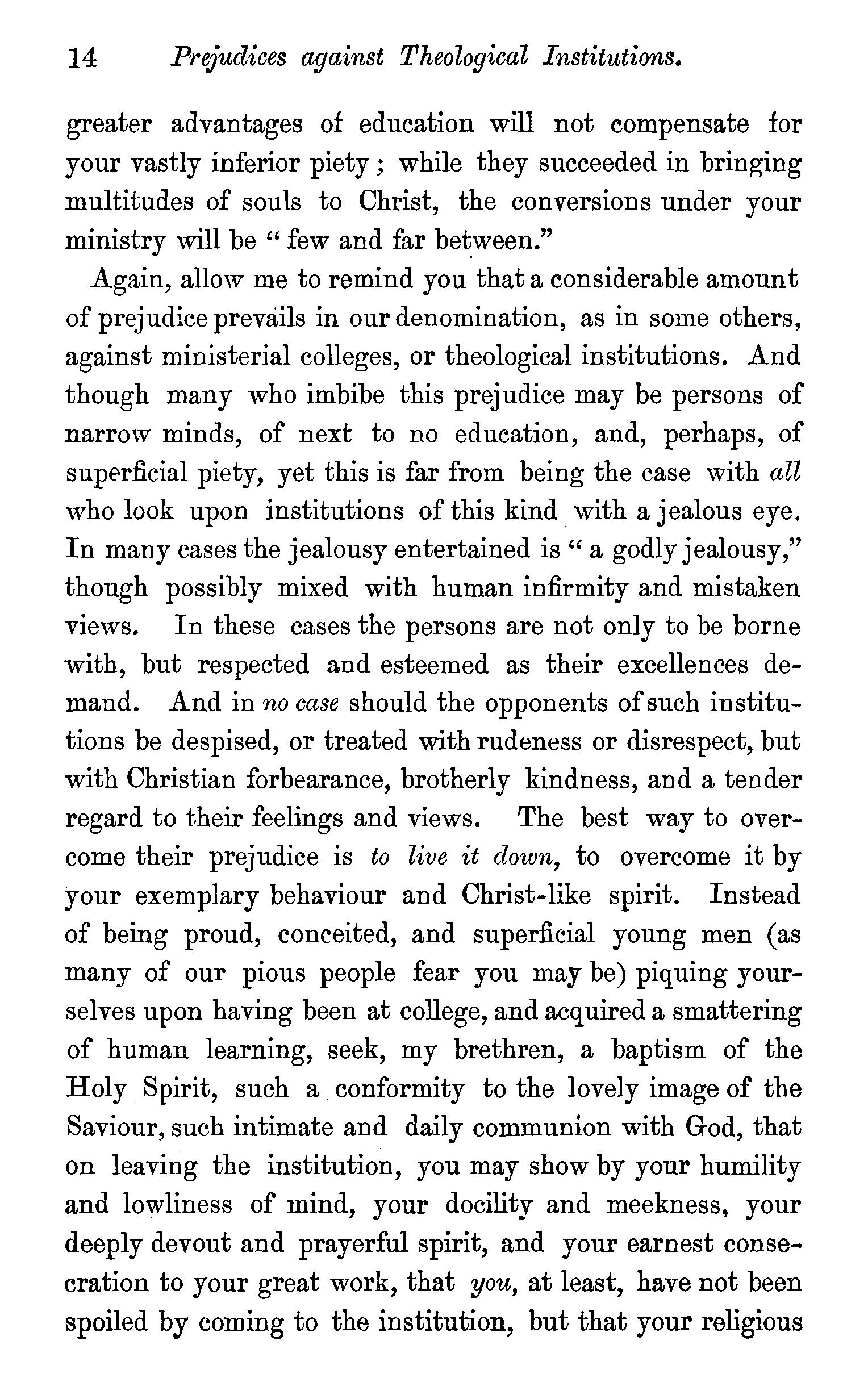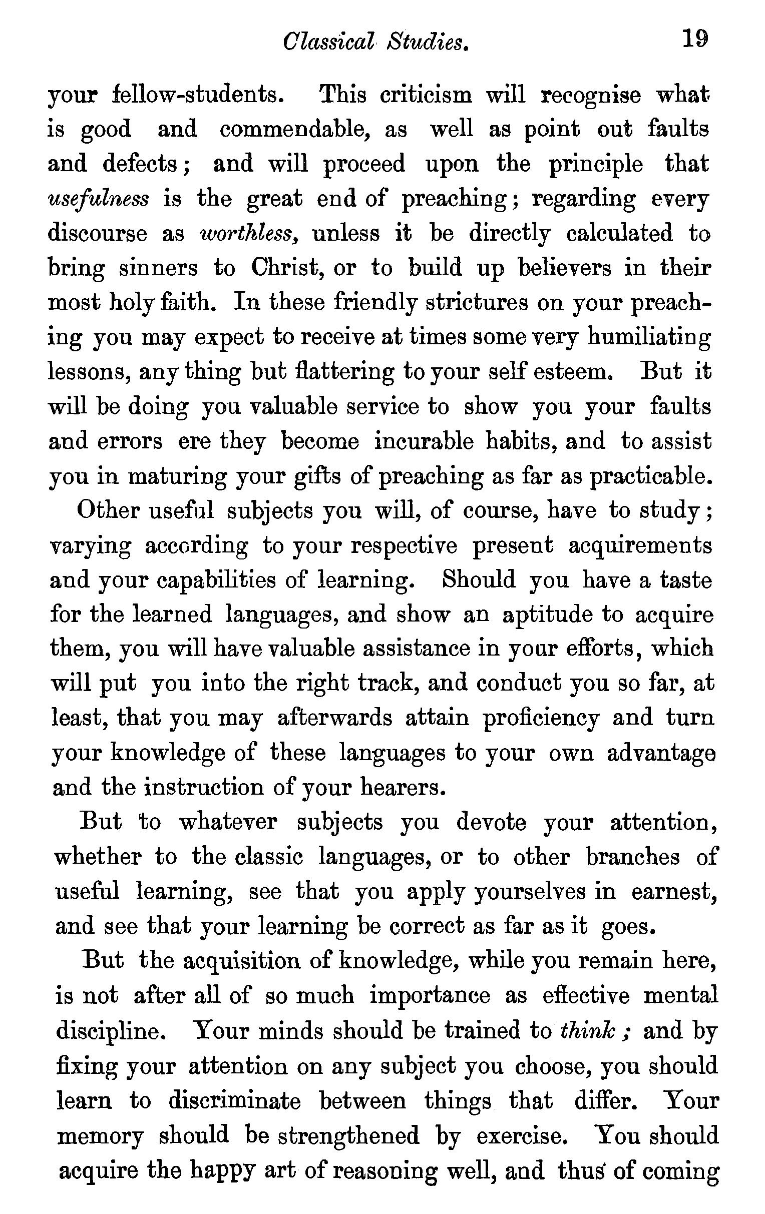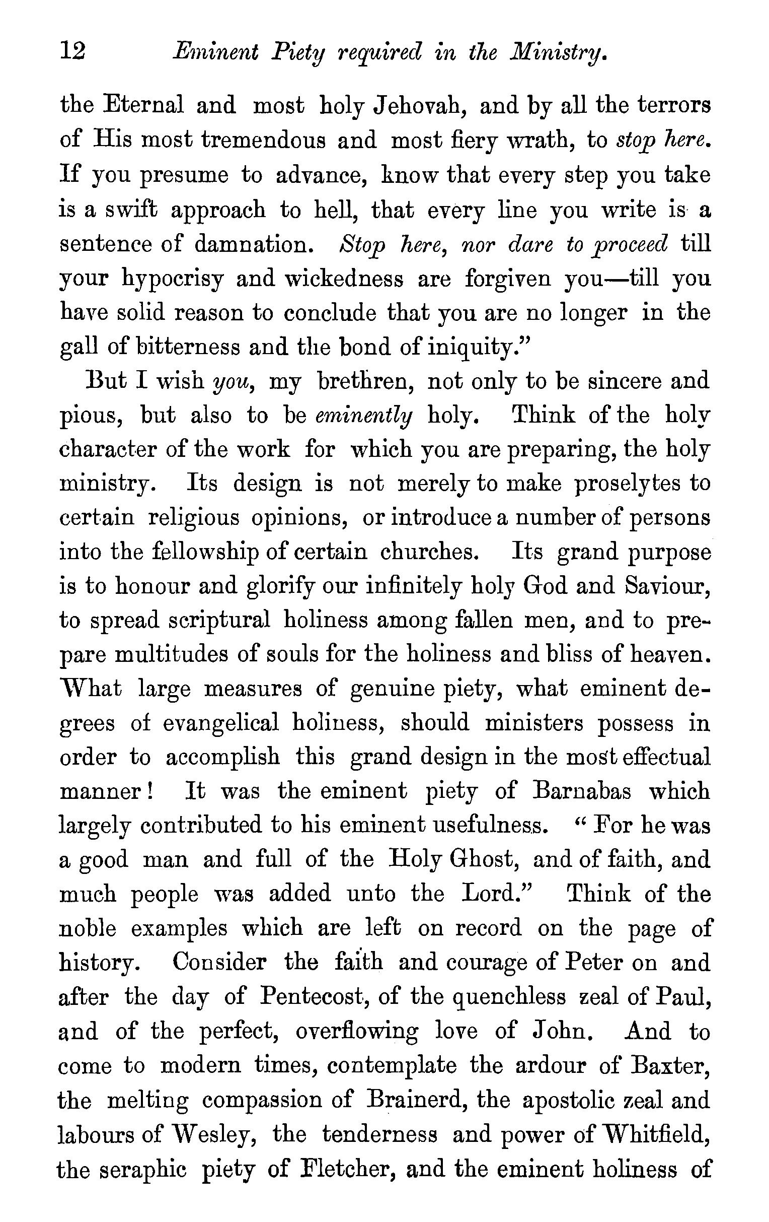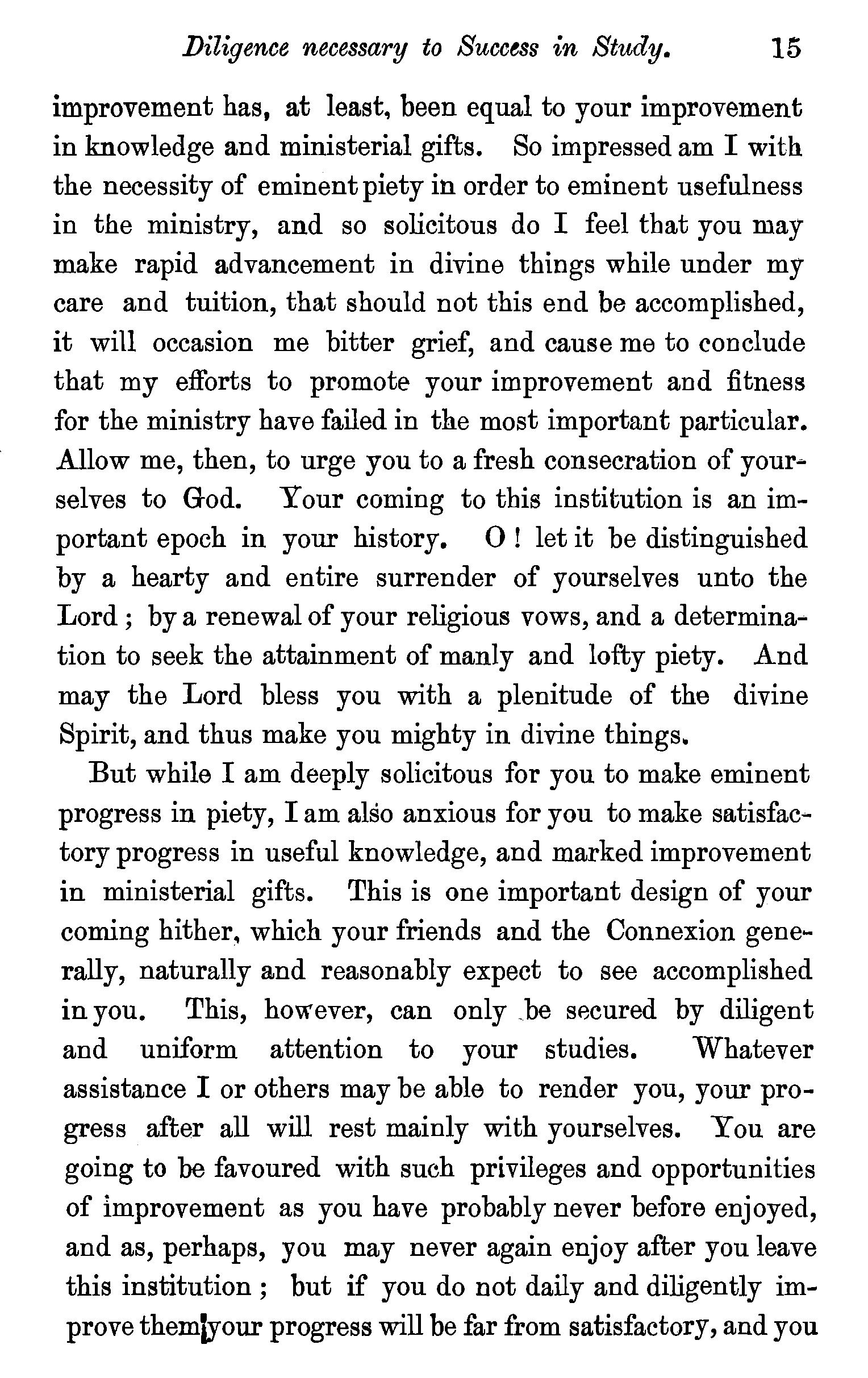 The ministry a momentous work-The Christian minister should be truly pious-Irreligious ministers not recognized by God-Evils resultingfrom ministers being irreligious-Eminent piety required in the ministry-Examples of eminently pious ministers-Prejudices against Theological institutions-How to overcome such prejudices-Diligence necessary to success in study-Students should be careful of their health-Primary importance of Theological study-The composition of sermons-Classical studies-A disciplined mind ofmore value than knowledge-Motives-Prayer a help to study. . 8