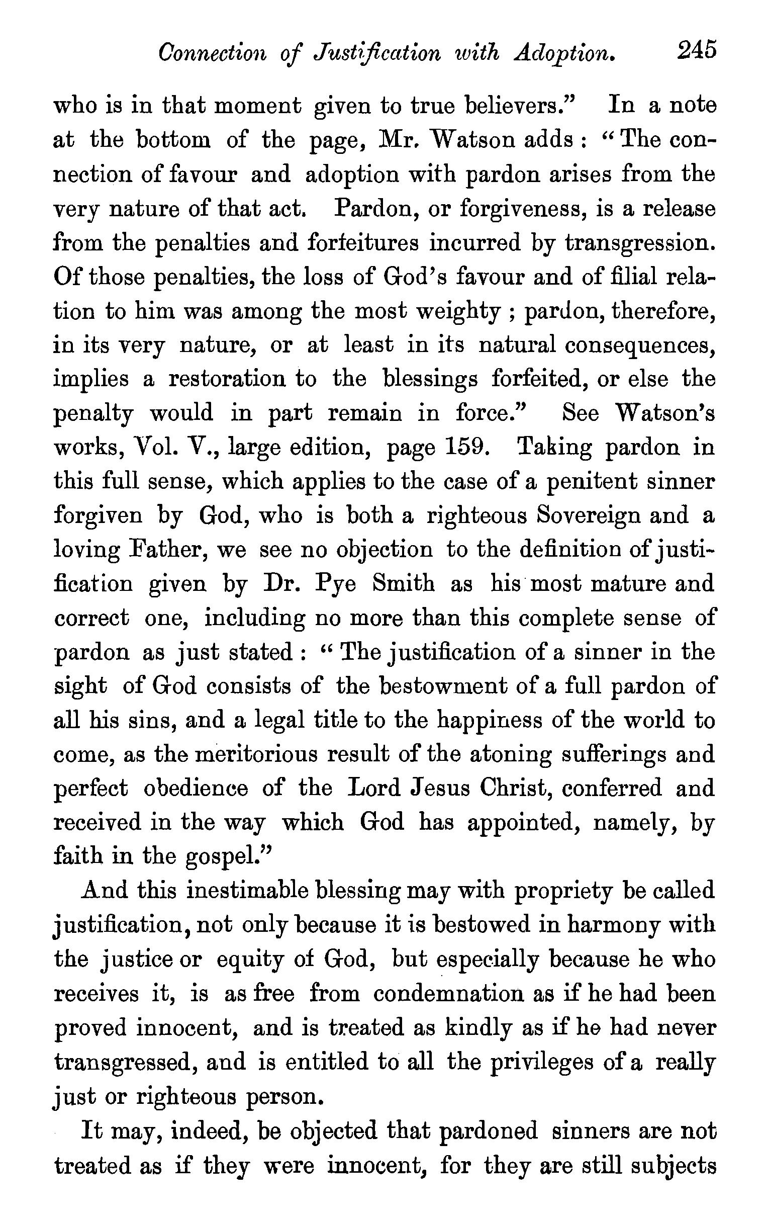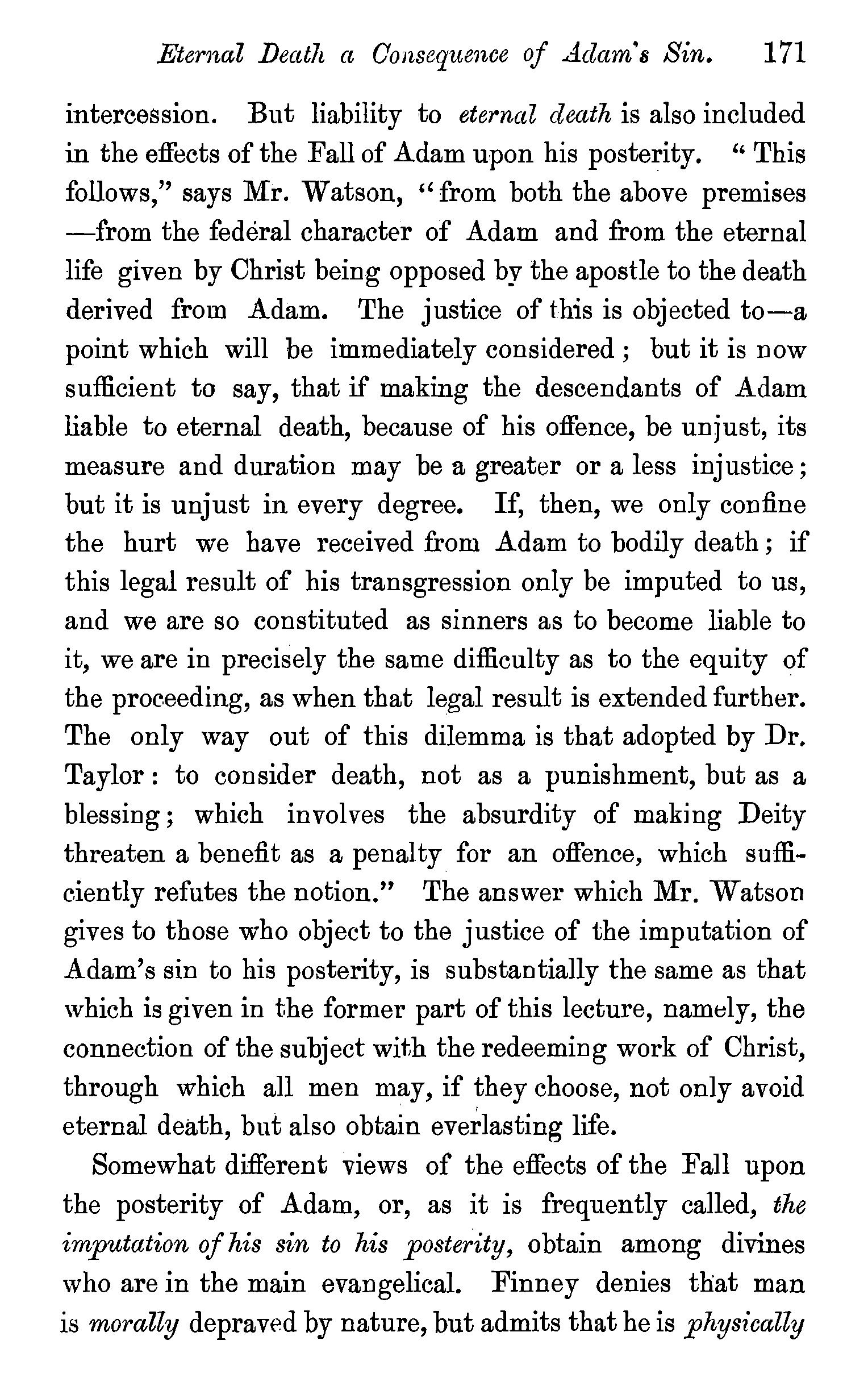 Now, if we take justification here in a low sense, for freedom from the guilt of Adam's transgression, the apostle may be understood as teaching that through the intervention of Christ all men are thus saved from the condemnation of original sin. But the term justification is probably to be understood in its usual acceptation; and the words may be rendered, " the free gift came upon all men unto [ or in order to] justification of life." The preposition, eis, properly enough rendered unto in several parts of the chapter, may certainly be rendered in order to, as it is by Watson ; one of its leading significations being, according to Robinson, "marking the object or point to or towards which auything tends." It is substantially so rendered by A. Barnes, who has, we think, given the meaning of the apostle in his notes on the place : "unto justification of life, or with reference to that justification which is connected with eternal life. That is, his work is adapted to produce acceptance with God, to the same extent as the crime o1 Adam has affected the race by involving them in sin and misery. The apostle does not affirm that in fact as many will be affected by the one as by the other, but that it is :fitted to meet all the consequences of the Fall; to be as widespread in its effects ; and to be as salutary as that had beeD ruinous. This is all that the argument requires."