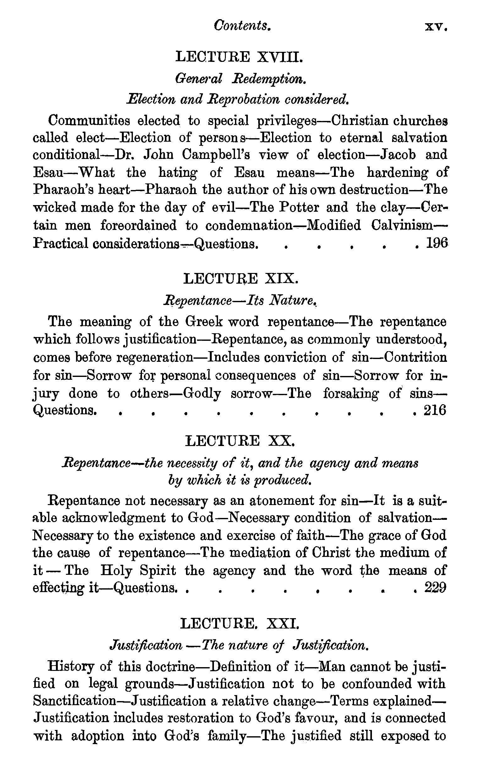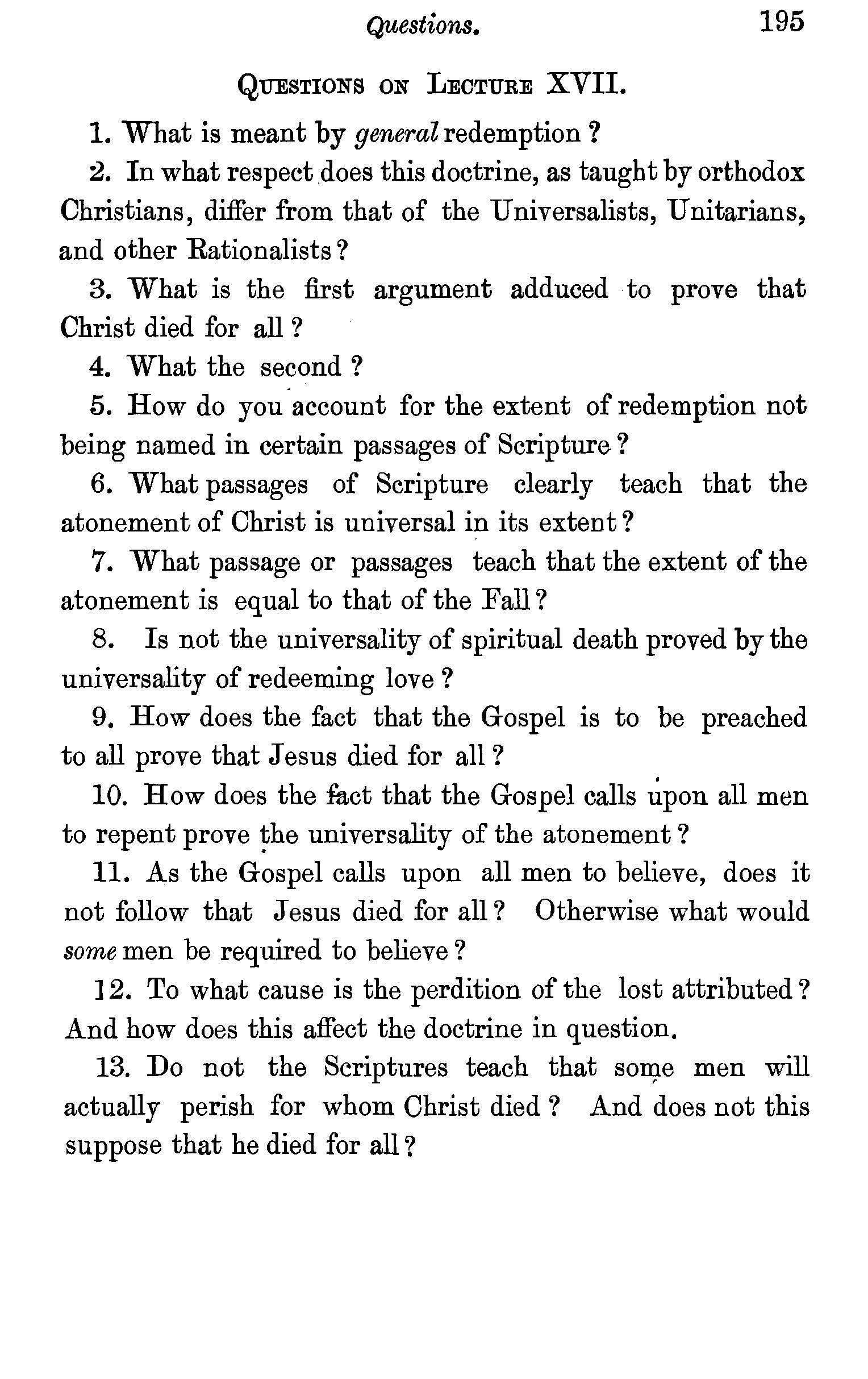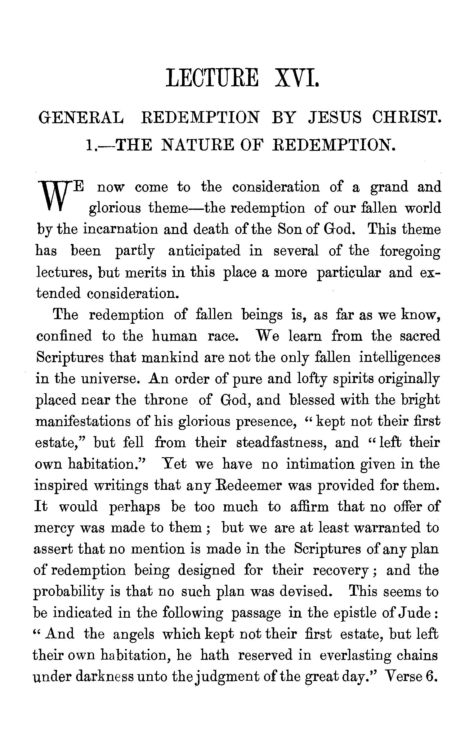 The redemption of fallen beings confined to the human race-Th.e person of the Redeemer-His dignity-His incarnation-Typical sacrifices-His propitiatory death-The teaching of Paul,Peter, and John on the doctrine of atonement-Socinian objections stated and confuted-Questions. . . 176