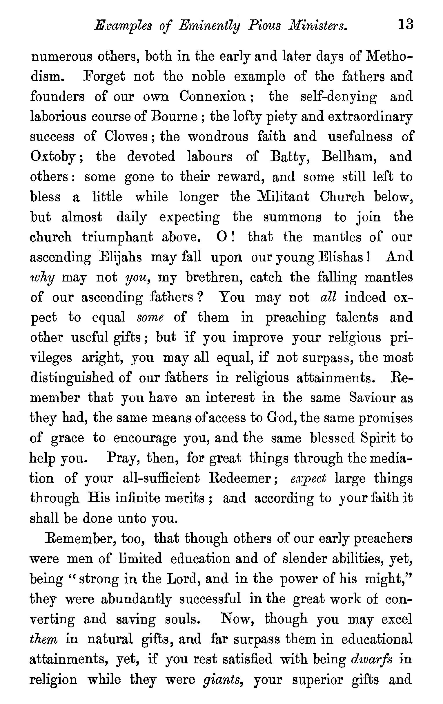its character. And after the community extended its labours to more populous districts and larger towns, they were mainly directed to the poorest, the most neglected, and the least educated classes. A large amount of human learning was not, therefore, required in its ministers and other agents. Refinement of style and highlypolished diction would have been wholly unsuited to the tastes and requirements of their hearers. Plain, vigorous, homely language, delivered with fluency and fervour, though the rules of syntax might not unfrequently be broken, was the style of address most likely to gain their attention and impress their minds.
