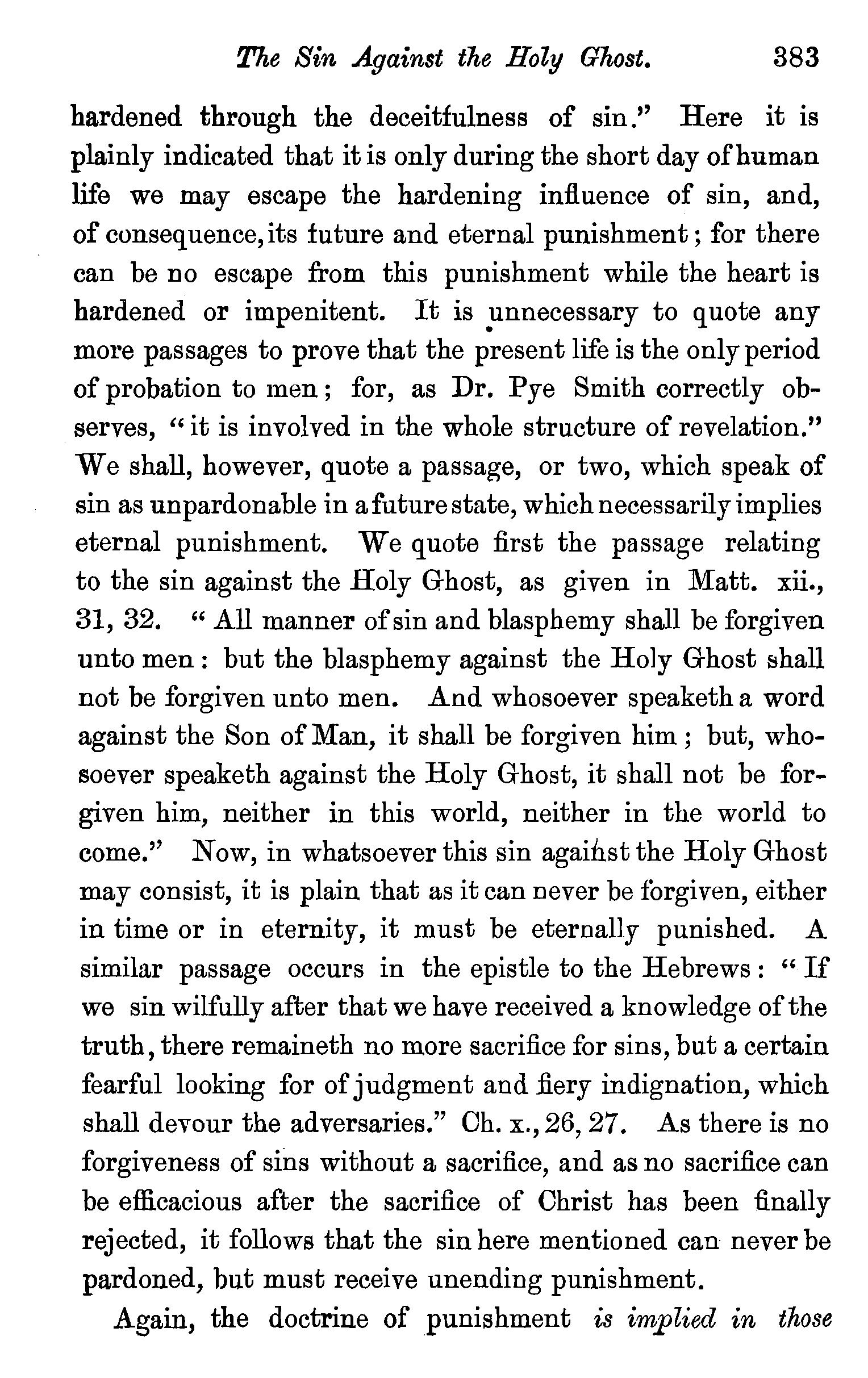 hardened through the deceitfulness of sin.'' Here it is plainly indicated that it is only during the short day of human life we may escape the hardening influence of sin, and, of consequence,its future and eternal punishment; for there can be no escape from this punishment while the heart is hardened or impenitent. It is unnecessary to quote any . more passages to prove that the present life is the only period of probation to men; for, as Dr. Pye Smith correctly observes, "it is involved in the whole structure of revelation." We shall, however, quote a passage, or two, which speak of sin as unpardonable in afuturestate, which necessarily implies eternal punishment. We quote first the passage relating to the sin against the Holy Ghost, as given in Matt. xii., 31, 32. " All manner of sin and blasphemy shall be forgiven unto men : but the blasphemy against the Holy Ghost shall not be forgiven unto men. And whosoever speaketh a word against the Son of Man, it shall be forgiven him; but, whosoever speaketh against the Holy Ghost, it shall not be forgiven him, neither in this world, neither in the world to come.'' Now, in whatsoever this sin against the Holy Ghost may consist, it is plain that as it can never be forgiven, either in time or in eternity, it must be eternally punished. A similar passage occurs in the epistle to the Hebrews: "If we sin wilfully after that we have received a knowledge of the truth, there remaineth no more sacrifice for sins, but a certain fearful looking for of judgment and fiery indignation, which shall devour the adversaries." Oh. x., 26, 27. As there is no forgiveness of sins without a sacrifice, and as no sacrifice can be efficacious after the sacrifice of Christ has been finally rejected, it follows that the sin here mentioned can never be pardoned, but must receive unending punishment.