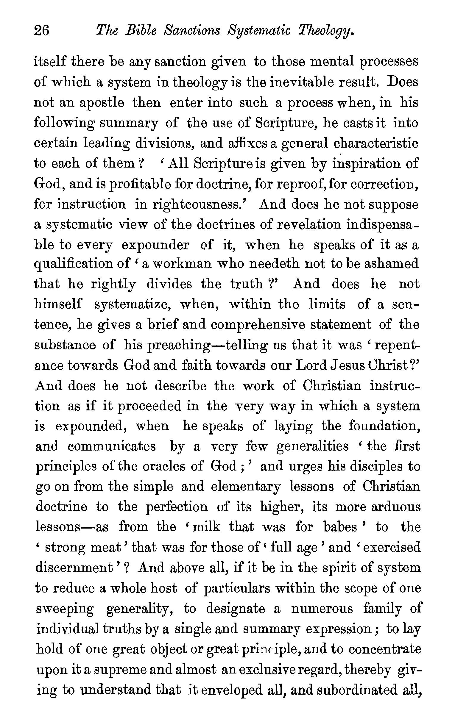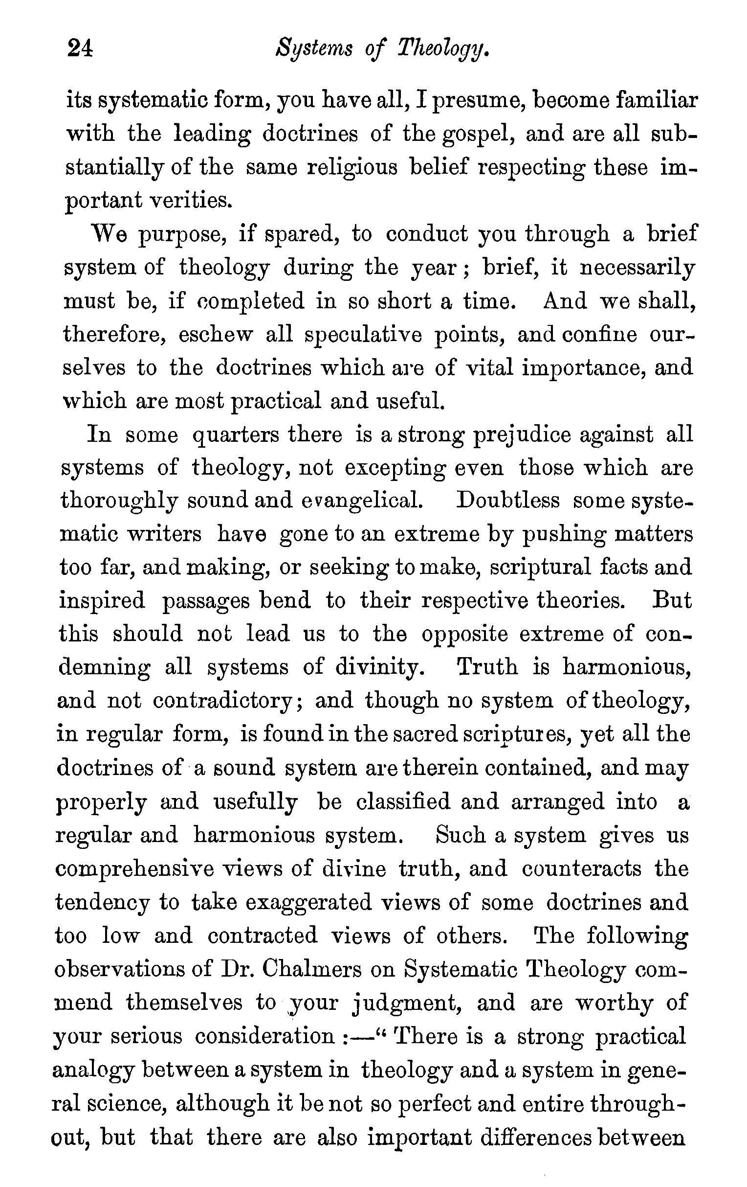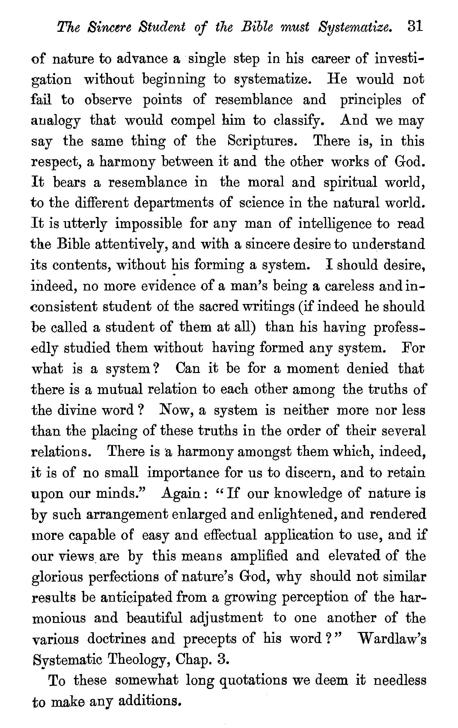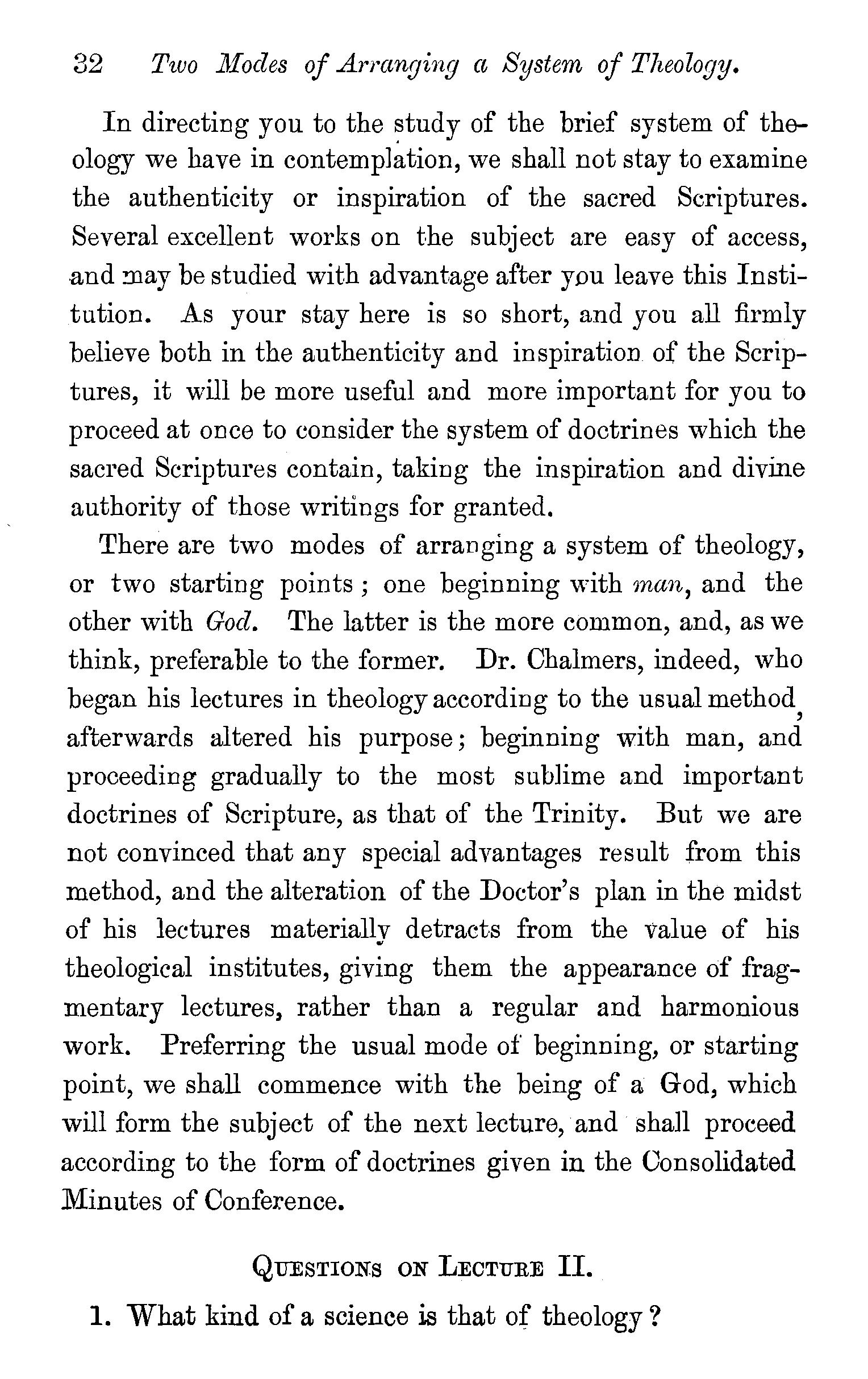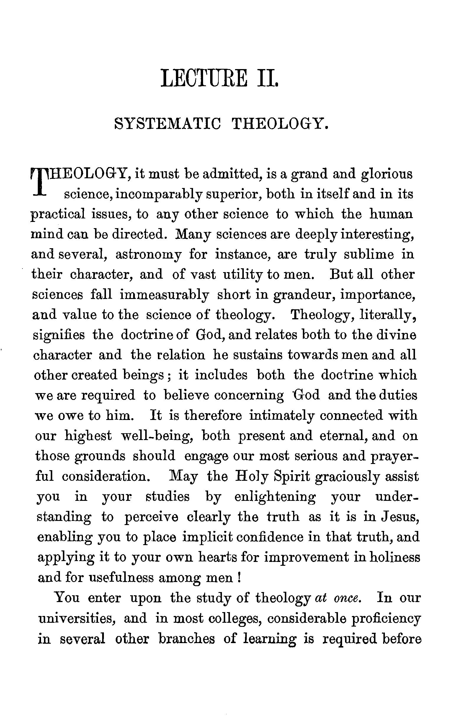 Theology the grandest of the sciences-Preparations for Theological study-Systems of Theology-Induction of Scripture passages-The Bible sanctions systematic Theology-Systematic Theology is Bible teaching systematized-General includes particular truth-· Systematic Theology objected to as illiberalDrs. Chalmersand Wardlaws' views of systematic Theology-The sincere student of Scripture must systematize-· Two modes of constructing a system of Theology-Questions. . . 22