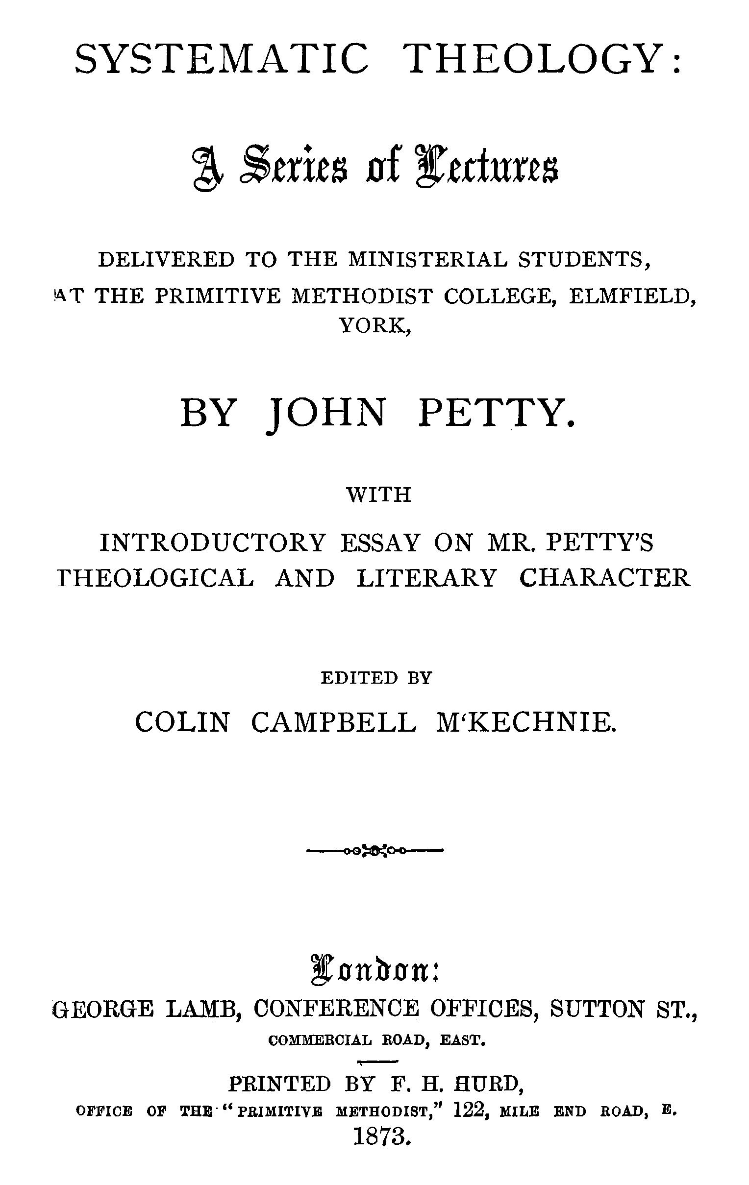Systematic theology : a series of lectures delivered to the ministerial students at the Primitive Methodist College, Elmfield, York by John Petty ; edited by Colin Campbell M'Kechnie First Fruits Press, ©2025