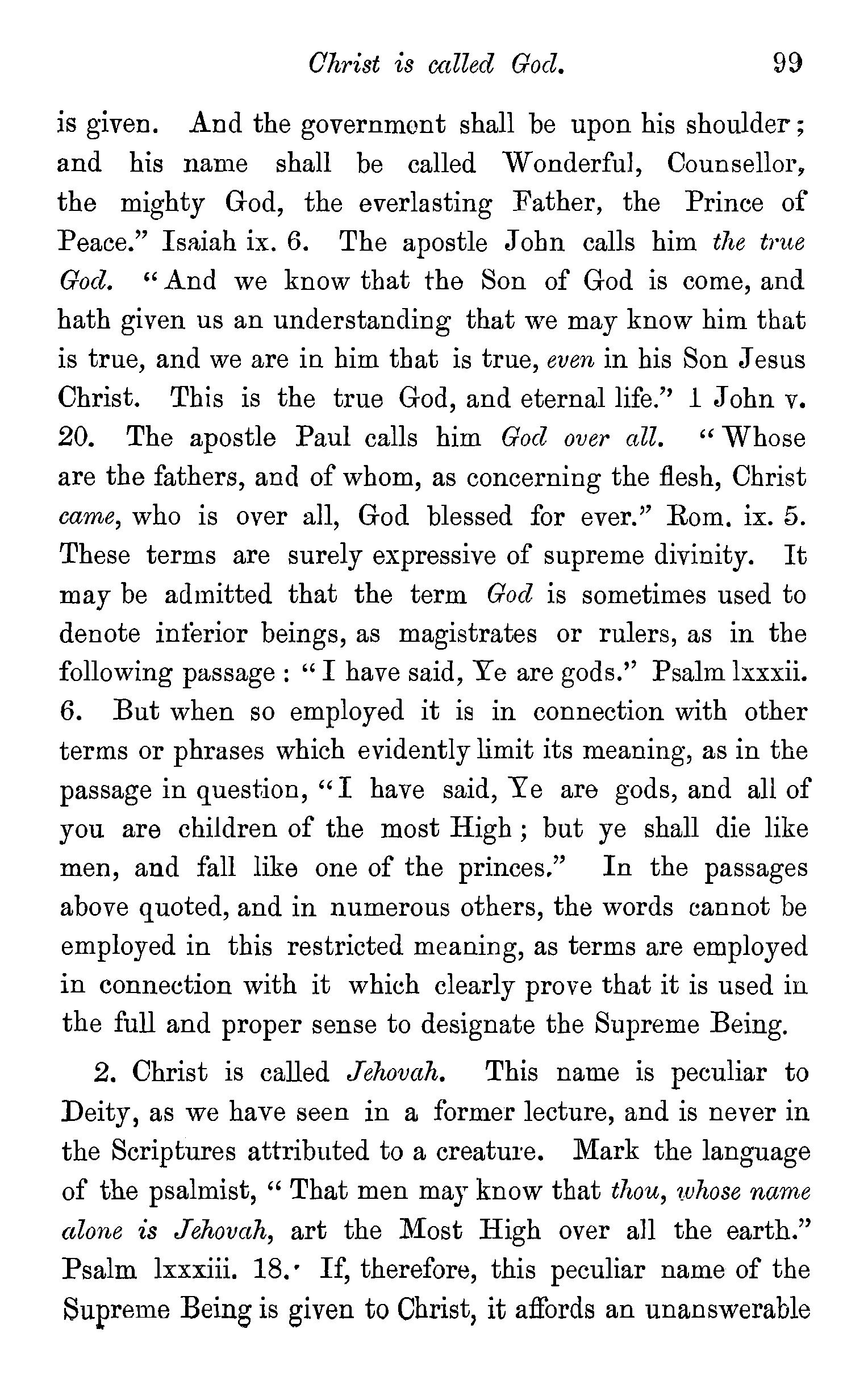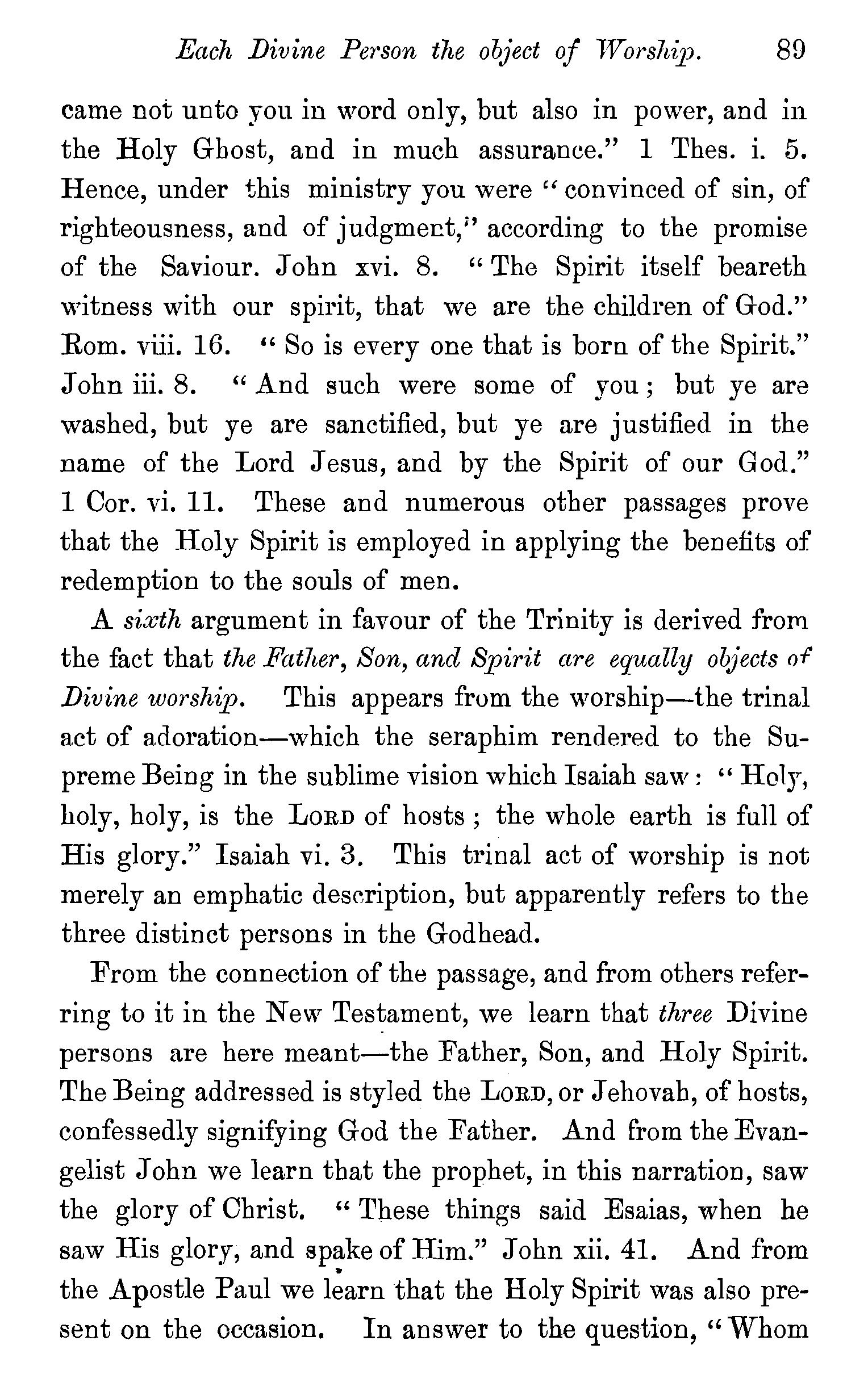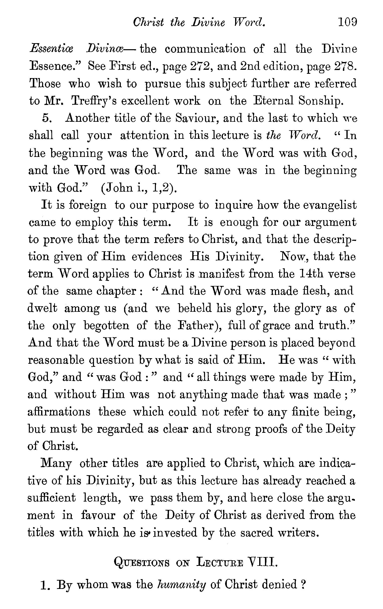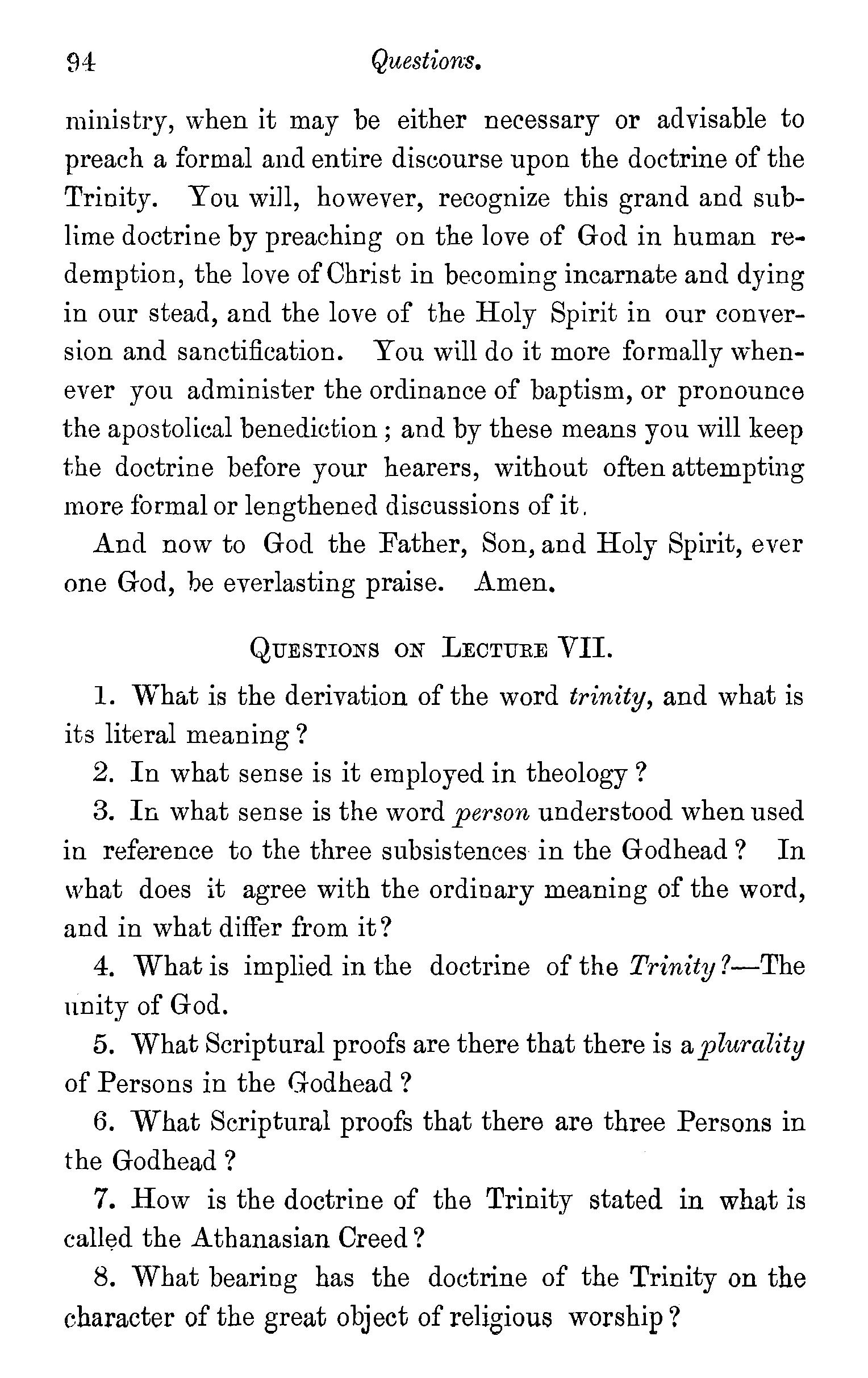 The meaning of the word trinity explained-Trinity implies unity-Plural names applied to God-Plural pronouns used when God is the speaker-Father, Son, and Holy Spirit are each called in Scripture by the proper names of God-Each represented as possessing·the peculiar attributes of God-Each participate in the work of Creation, Providence, and Redemption-Each the object of Divine worship-Mystery of the doctrine-Its practical valueQuestions-Note on a Rule in Hebrew syntax. . 83