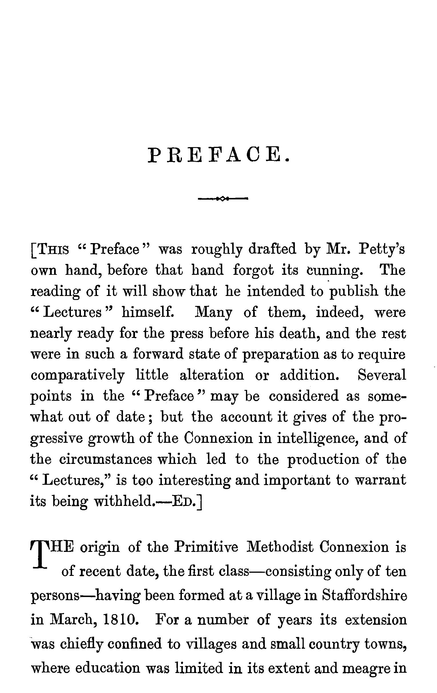 [THIS "Preface" was roughly drafted by Mr. Petty's own hand, before that hand forgot its cunning. The reading of it will show that he intended to publish the " Lectures " himself. Many of them, indeed, were nearly ready for the press before his death, and the rest were in such a forward state of preparation as to require comparatively little alteration or addition. Several points in the "Preface" may be considered as somewhat out of date; but the account it gives of the progressive growth of the Connexion in intelligence, and of the circumstances which led to the production of the "Lectures," is to.o interesting and important to warrant its being witbheld.-ED.]