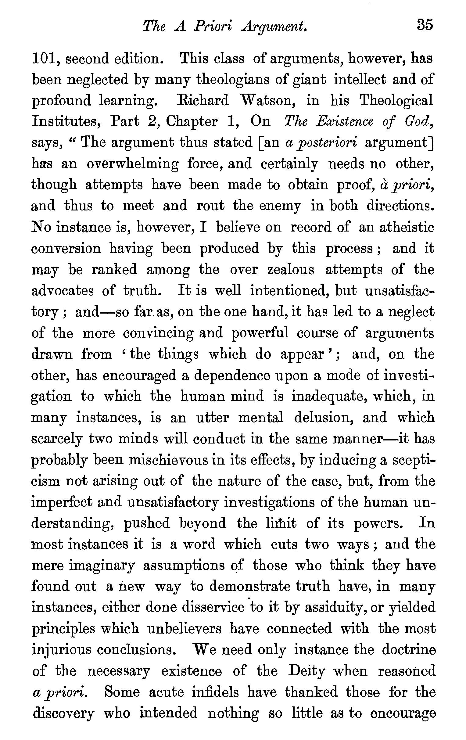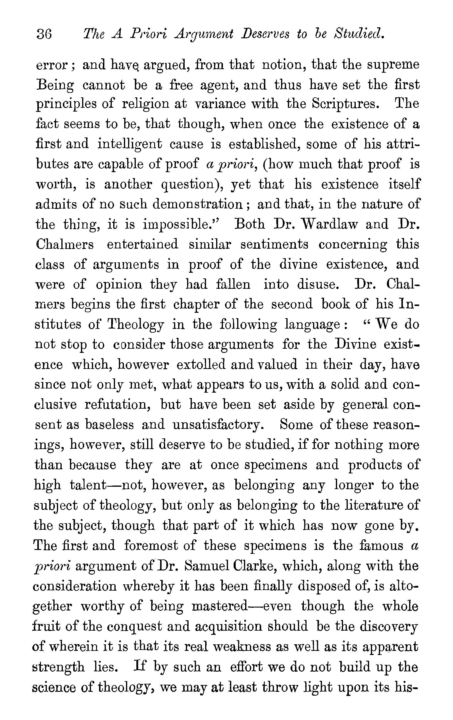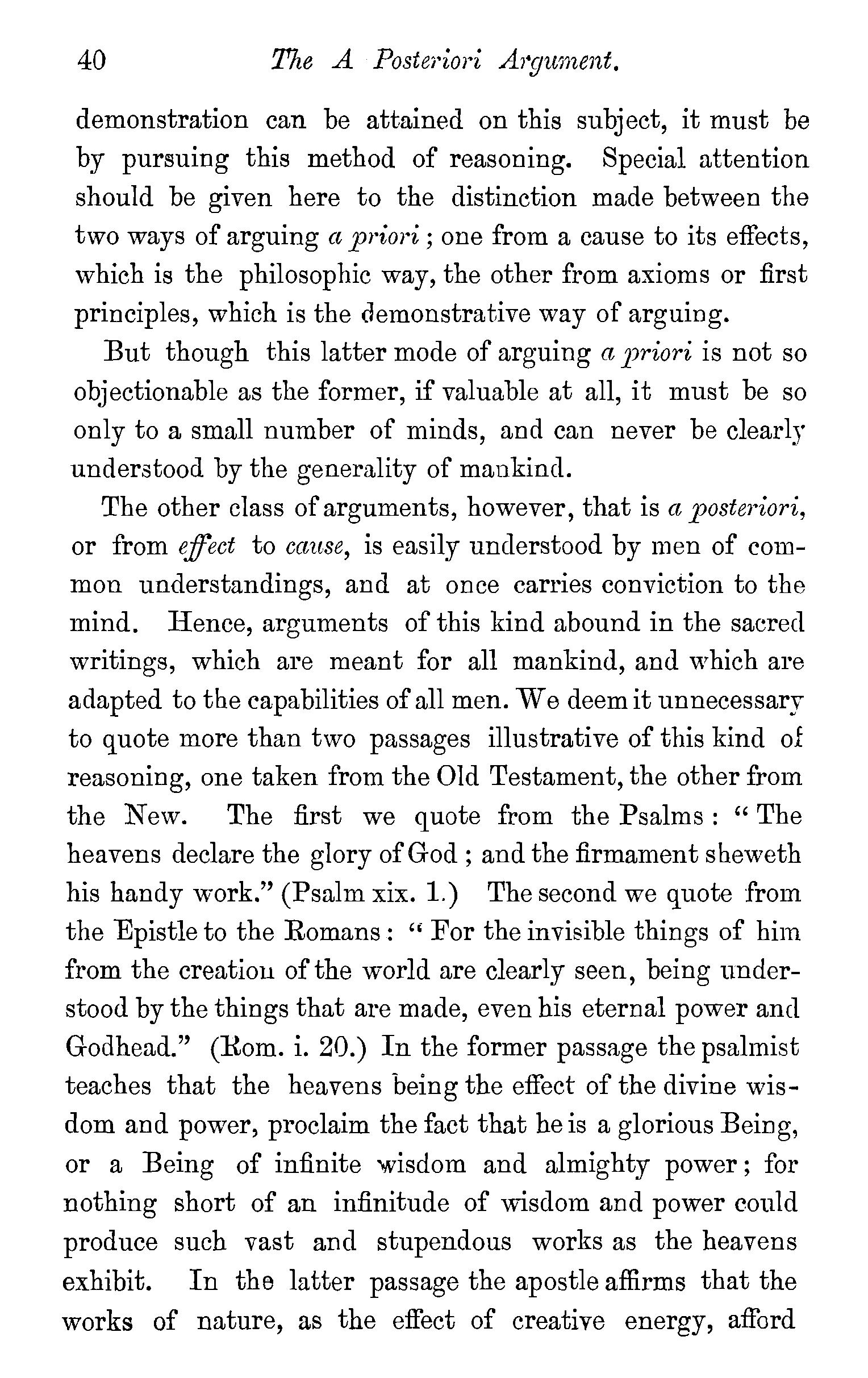 The Scriptures take the being of God for granted-· -The argument a Priori-this argument deserves to be studied-Dr. A. Clarke and Mr. Gillespie its two great exponents-Mr. Gillespie's book-Its probable fate-Origin of the a Priori argument-The a Posteriori argument-Agreement of Gillespie with HumeAuthorities for both arguments-Questions . . 34