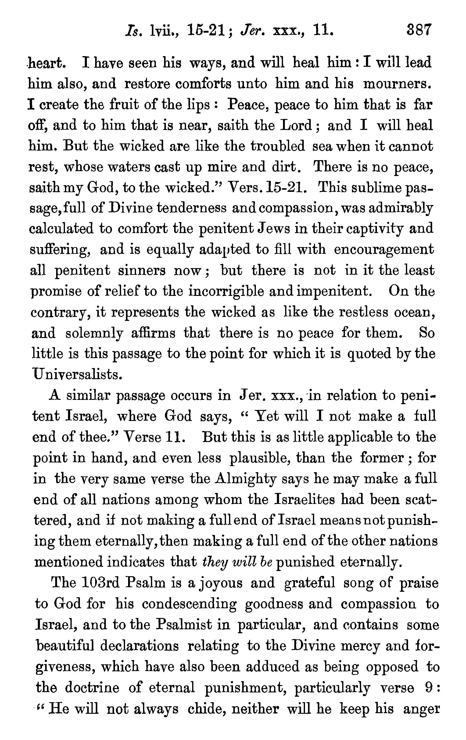 A similar passage occurs in J er. xxx., -in relation to penitent Israel, where God says, " Yet will I not make a full end of thee." Verse 11. But this is as little applicable to the point in hand, and even less plausible, than the former ; for in the very same verse the Almighty says he may make a full end of all nations among whom the Israelites had been scattered, and if not making a full end of Israel means not punishing them eternally, then making a full end of the other nations mentioned indicates that they will be punished eternally.