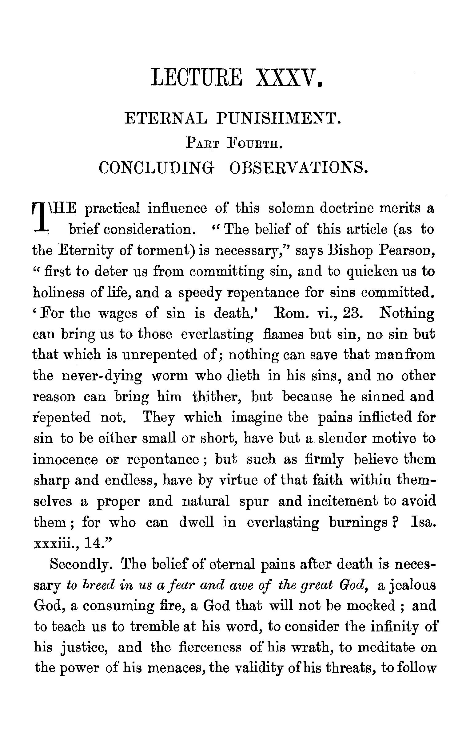 rJ1HE practical influence of this solemn doctrine merits a .l brief consideration. " The belief of this article (as to the Eternity of torment) is necessary,'' says Bishop Pearson, "first to deter us from committing sin, and to quicken us to holiness of life, and a speedy repentance for sins committed. 'For the wages of sin is death.' Rom. vi., 23. Nothing can bring us to those everlasting flames but sin, no sin but that which is unrepented of; nothing can save that man from the never-dying worm who dieth in his sins, and no other reason can bring him thither, but because he sinned and repented not. They which imagine the pains inflicted for sin to be either small or short, have but a slender motive to innocence or repentance; but such as firmly believe them sharp and endless, have by virtue of that faith within themselves a proper and natural spur and incitement to avoid them; for who can dwell in everlasting burnings? Isa. xxxiii., 14."