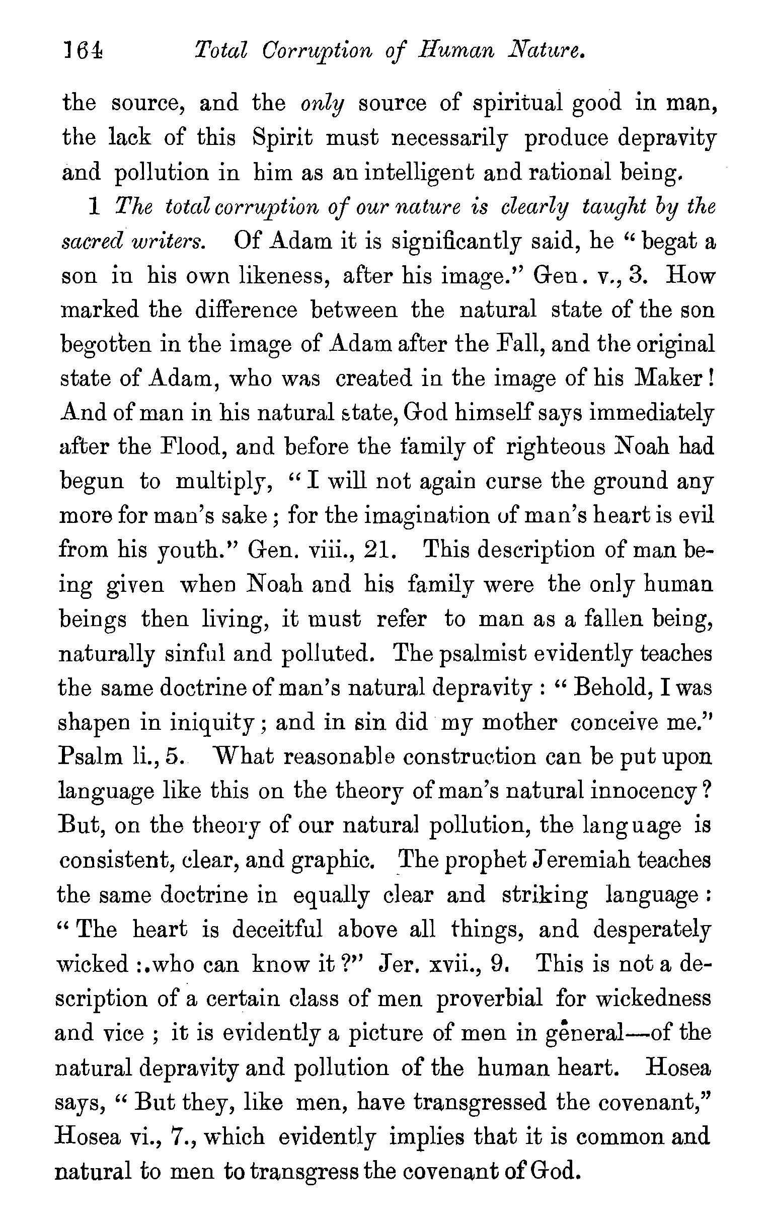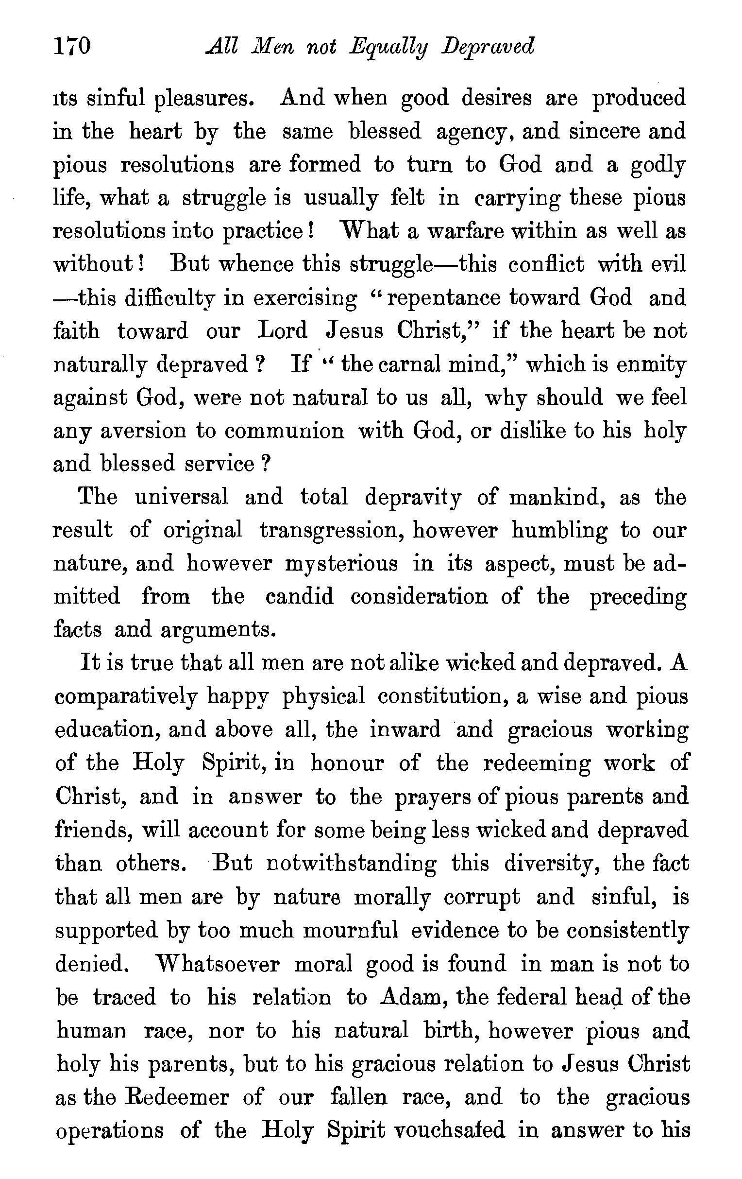 Adam the federal head of his posterity-We have derived from him a morally diseased nature-This awful fact reconciled with the justice of God-Bodily and spiritual death results from the Fall ...... Total corruption of our nature clearly taught by sacred writersMankind corrupt in all nations and ages-Every man conscious of depravity-All men not equally depraved-The doctrine of imputed sin canvassed-The salvation of infants certain-Questions . 160