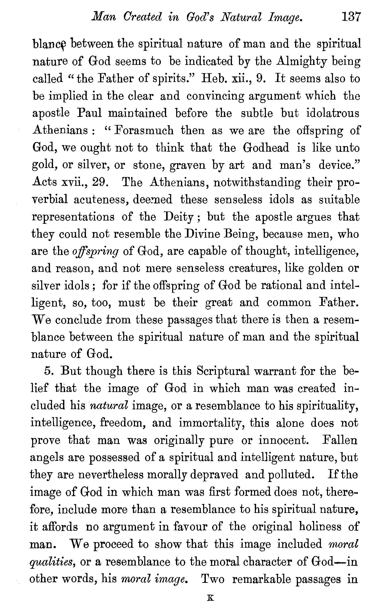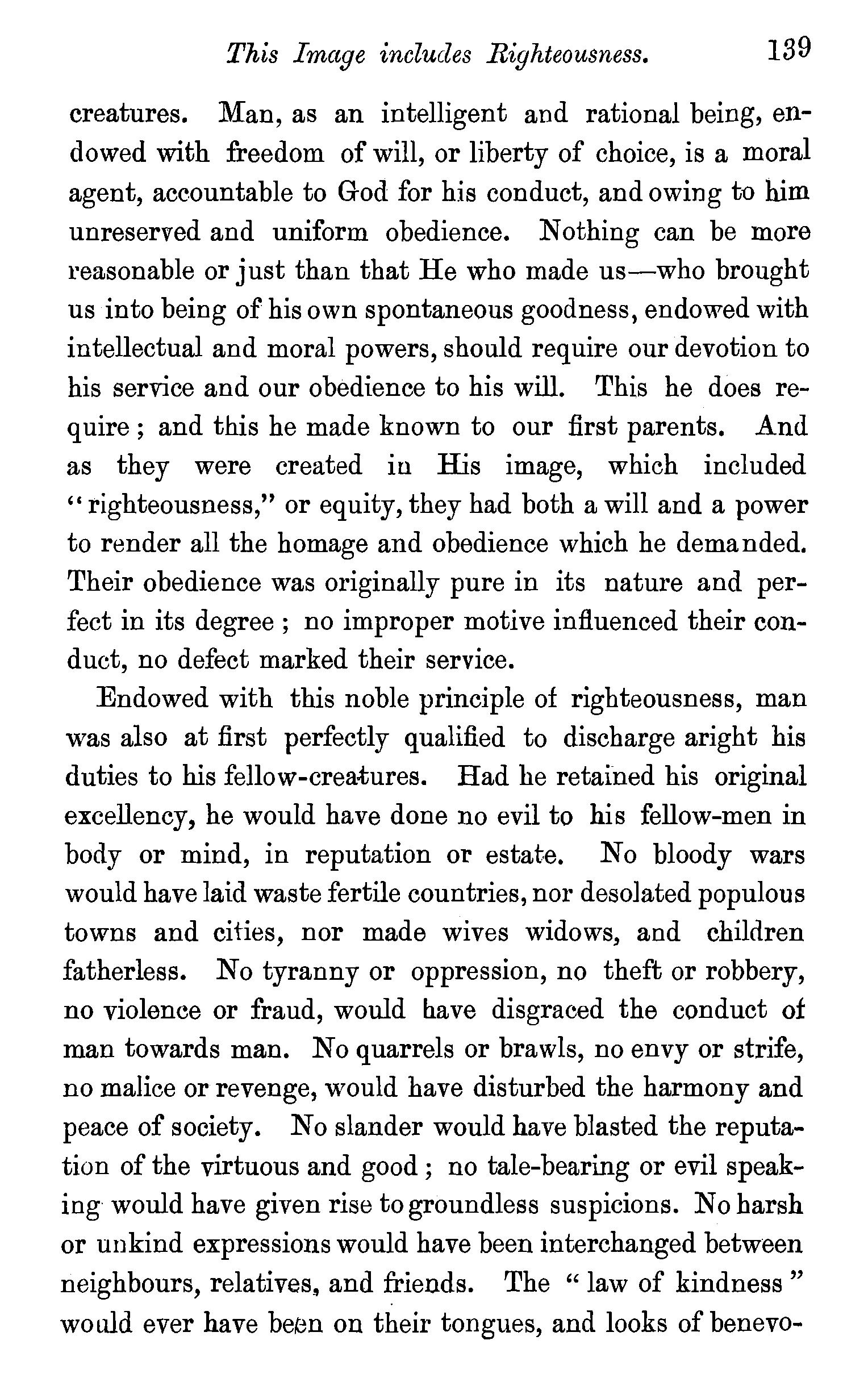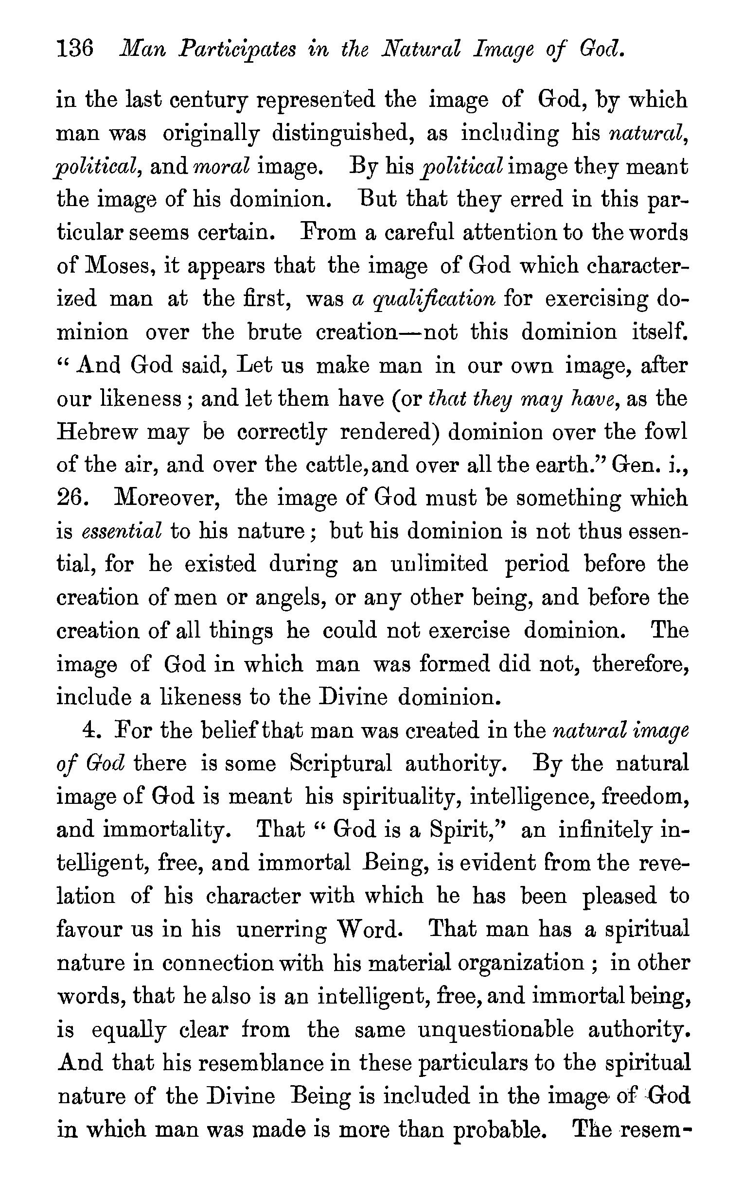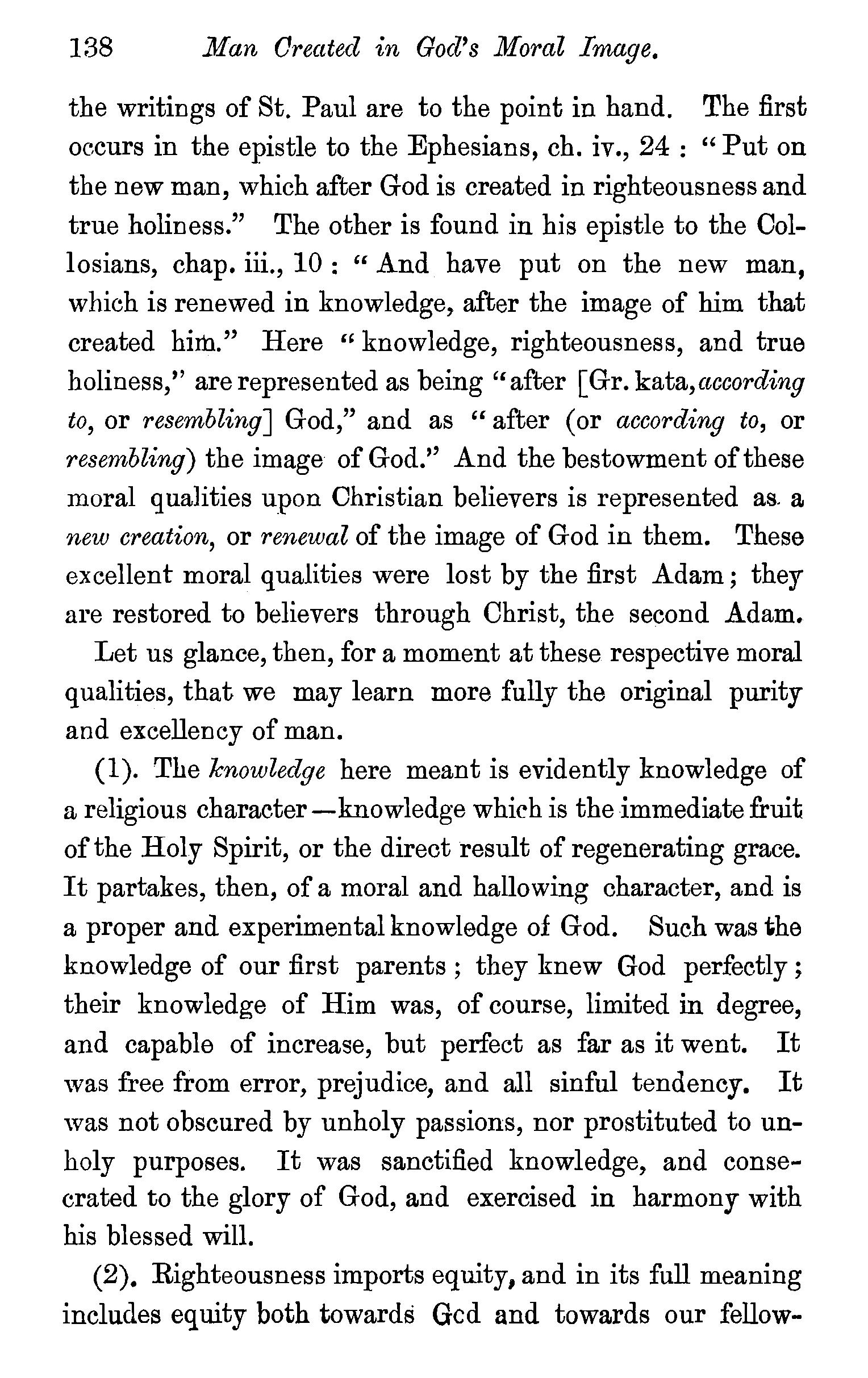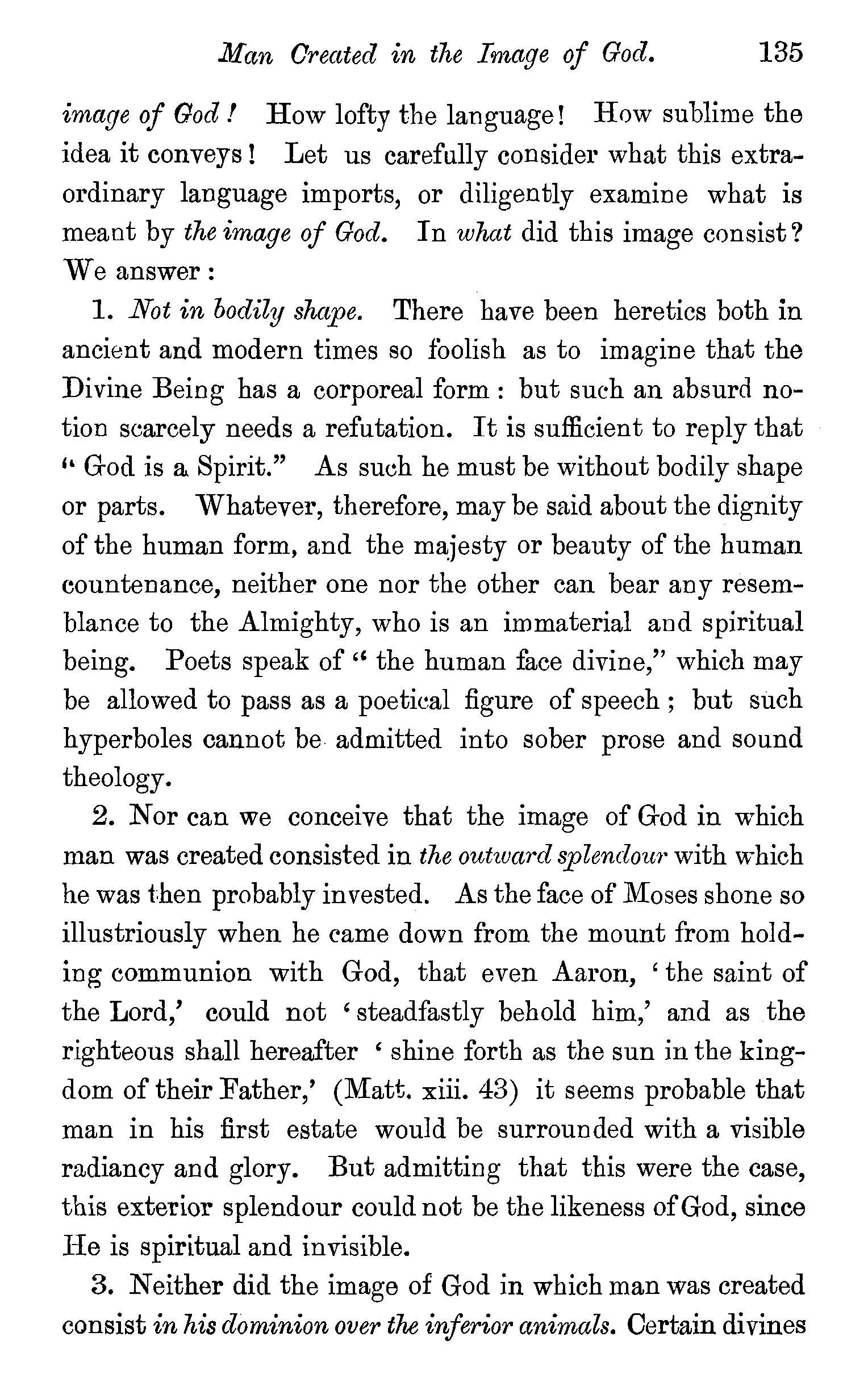 Created in the image of God-That image consisted not in bodily shape-Not in outward splendour-Not in dominion over inferior animals-Man created in the natural image of God, and endowed with .spirituality, intelligence, freedom, immortality-The moral image of God-Knowledge, righteousness, and true holiness-Man created ineffably happy-Questions. . 134