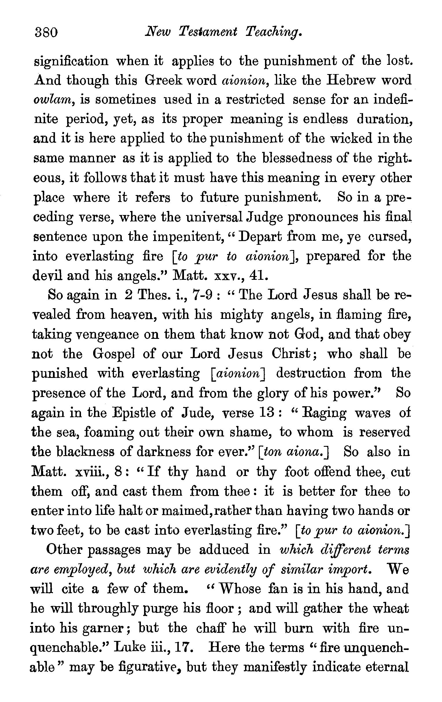 So again in 2 Thes. i., 7-9 : " The Lord Jesus shall be revealed from heaven, with his mighty angels, in flaming fire, taking vengeance on them that know not God, and that obey not the Gospel of our Lord Jesus Christ; who shall be punished with everlasting [ aionion] destruction from the presence of the Lord, and from the glory of his power.'' So again in the Epistle of Jude, verse 13: "Raging waves of the sea, foaming out their own shame, to whom is reserved the blackness of darkness for ever." [ton aiona.] So also in Matt. xviii., 8 : "If thy hand or thy foot offend thee, cut them off, and cast them from thee : it is better for thee to enter into life halt or maimed,rather than having two hands or two feet, to be cast into everlasting fire." [to pur to aionion.]