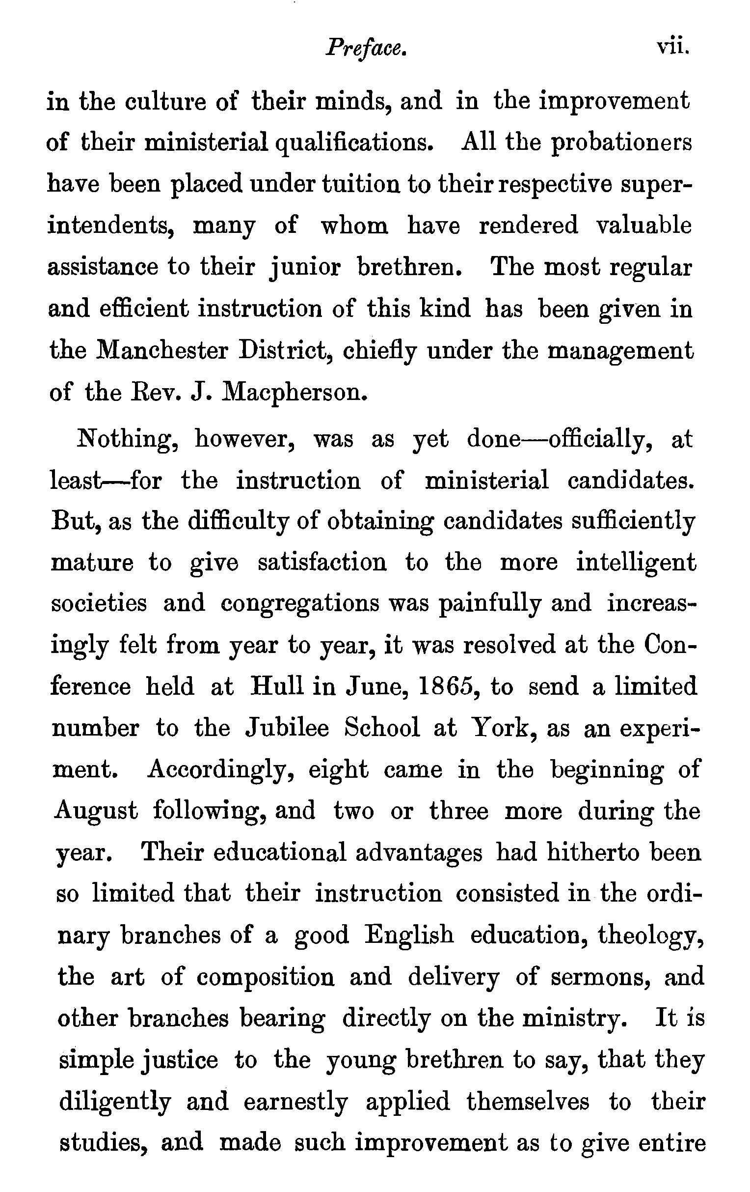 Nothing, however, was as yet done-officially, at least-for the instruction of ministerial candidates. But, as the difficulty of obtaining candidates sufficiently mature to give satisfaction to the more intelligent societies and congregations was painfully and increasingly felt from year to year, it was resolved at the Conference held at Hull in June, 1865, to send a limited number to the Jubilee School at York, as an experiment. Accordingly, eight came in the beginning of August following, and two or three more during the year. Their educational advantages had hitherto been so limited that their instruction consisted in the ordinary branches of a good English education, theology, the art of composition and delivery of sermons, and other branches bearing directly on the ministry. It is simple justice to the young brethren to say, that they diligently and earnestly applied themselves to their studies, and made such improvement as to give entire