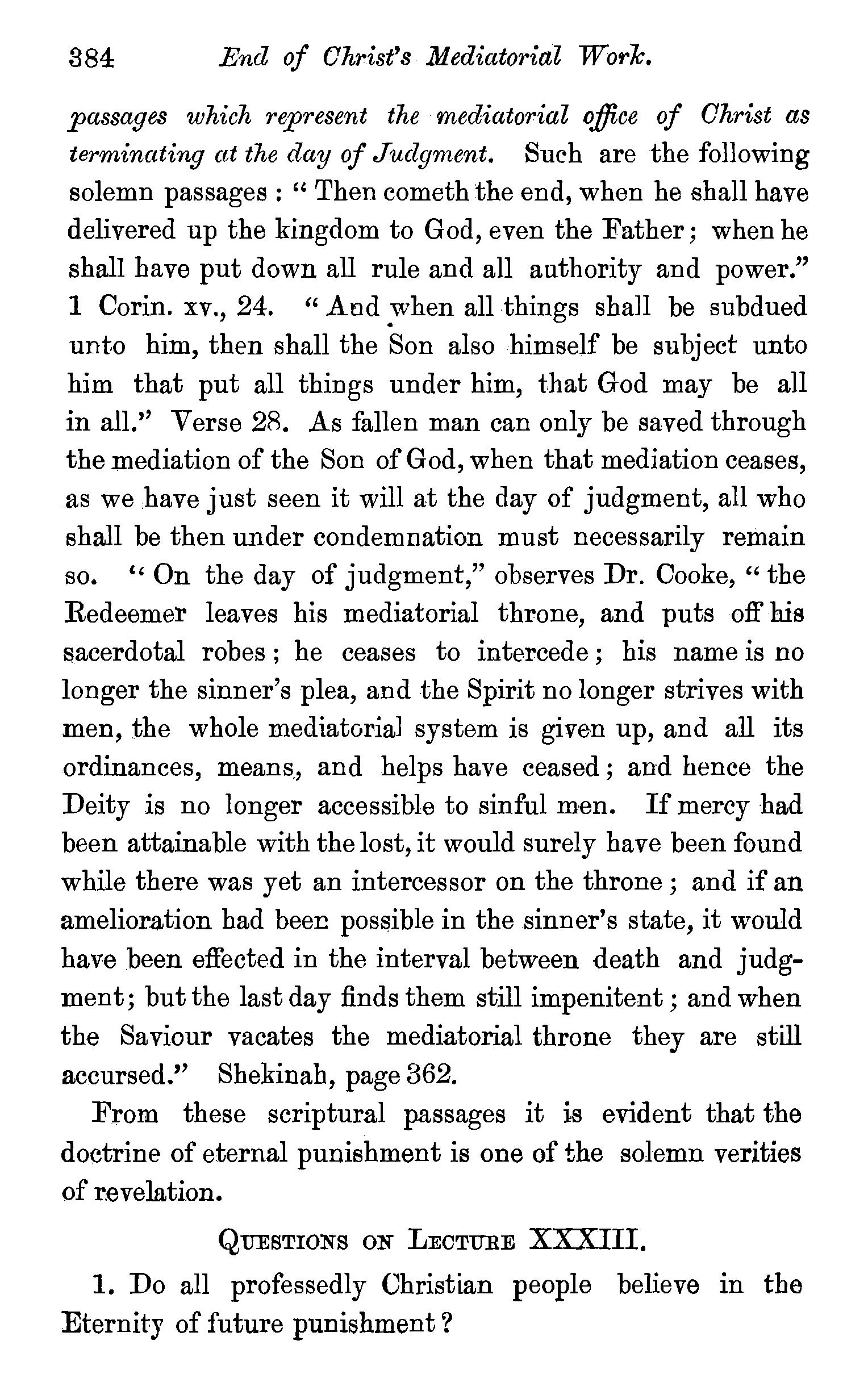 passages which 1·epresent the mediatorial office of Christ as terminating at the day of Judgment. Such are the following solemn passages : " Then cometh the end, when he shall have delivered up the kingdom to God, even the Father; when he shall have put down all rule and all authority and power." 1 Corin. xv., 24. "And _whenall things shaJl be subdued unto him, then shall the Son also himself be subject unto him that put all things under him, that God may be all in all.'' Verse 28. As fallen man can only be saved through the mediation of the Son of God, when that mediation ceases, as we .have just seen it will at the day of judgment, all who shall be then under condemnation must necessarily remain so. '' On the day of judgment," observes Dr. Cooke, "the Redeemer leaves his mediatorial throne, and puts off his sacerdotal robes; he ceases to intercede; his name is no longer the sinner's plea, and the Spirit no longer strives with men, the whole mediatorial system is given up, and all its ordinances, means_, and helps have ceased; and hence the Deity is no longer accessible to sinful men. If mercy had been attainable with the lost, it would surely have been found while there was yet an intercessor on the throne ; and if an amelioration had bee!! possible in the sinner's state, it would have been effected in the interval between death and judgment; but the last day finds them still impenitent; and when the Saviour vacates the mediatorial throne they are still accursed.'' Shekinah, page 362.