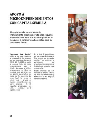 “Apoyando tus Sueños” Iniciativa que nace a partir de la necesidad de las personas quehanpadecidoentiempode COVID 19. En 2020 se realizó la primera feria de micro emprendimiento con el objetivo de apoyar el inicio y fortalecimiento de ideas de negocios para personas que han perdido sus empleos por efecto de la pandemia del coronavirus”. La ayuda se brindó para 4 grupos de mujeres emprendedoras que fueron elegidos de 16 proyectos presentados, que habían participado en 2 capacitaciones.