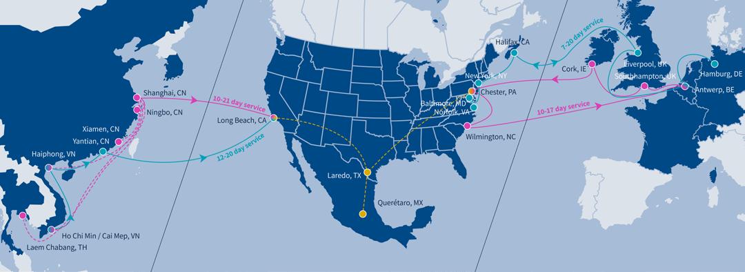En la Costa Oeste, transporta tu carga con servicio directo hacia el este desde China y Vietnam a Long Beach, con servicio feeder desde Tailandia. En la Costa Este, transporta en rutas este-oeste con servicio feeder disponible desde cualquier punto de Europa, el Reino Unido, Irlanda y Estados Unidos.