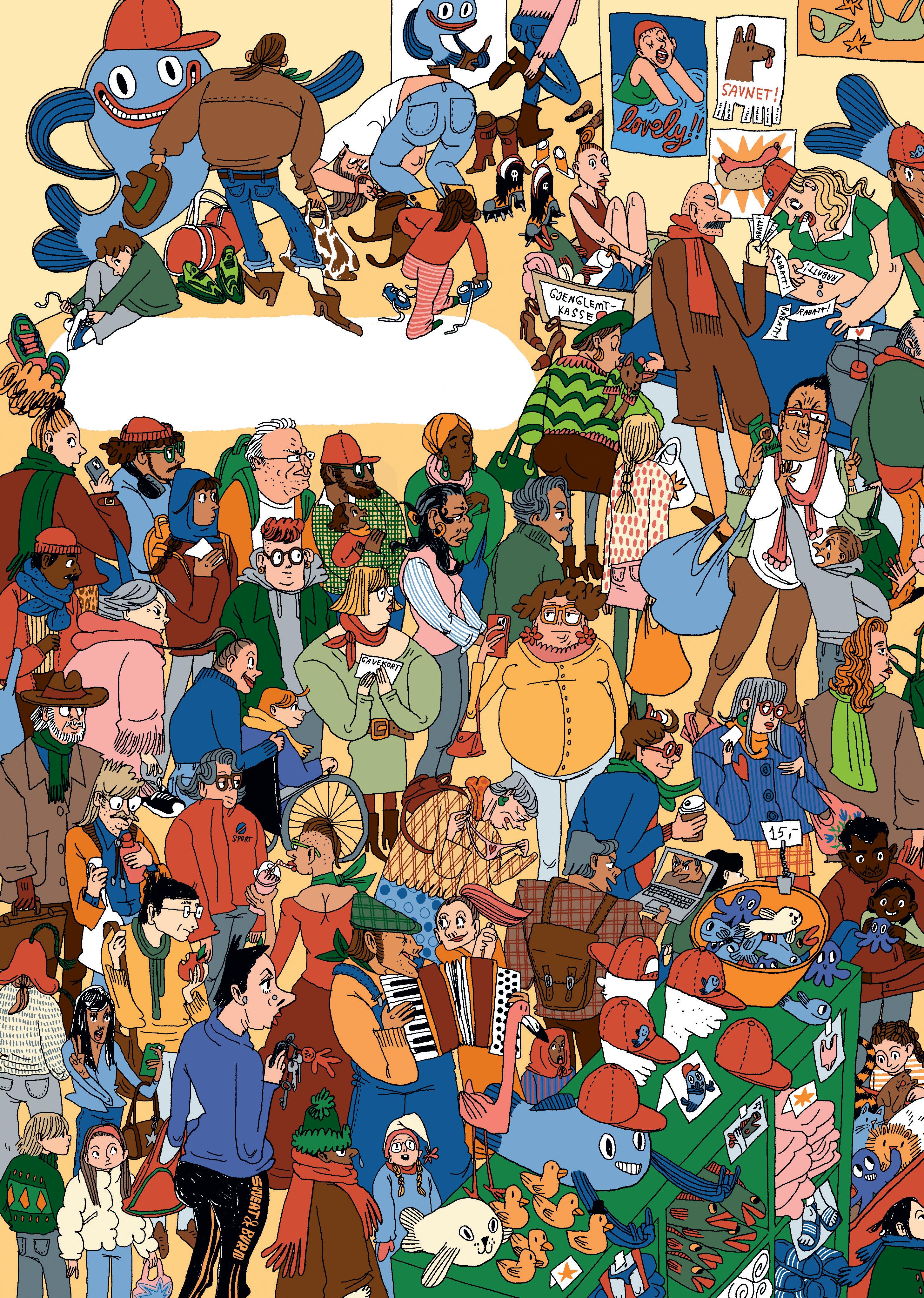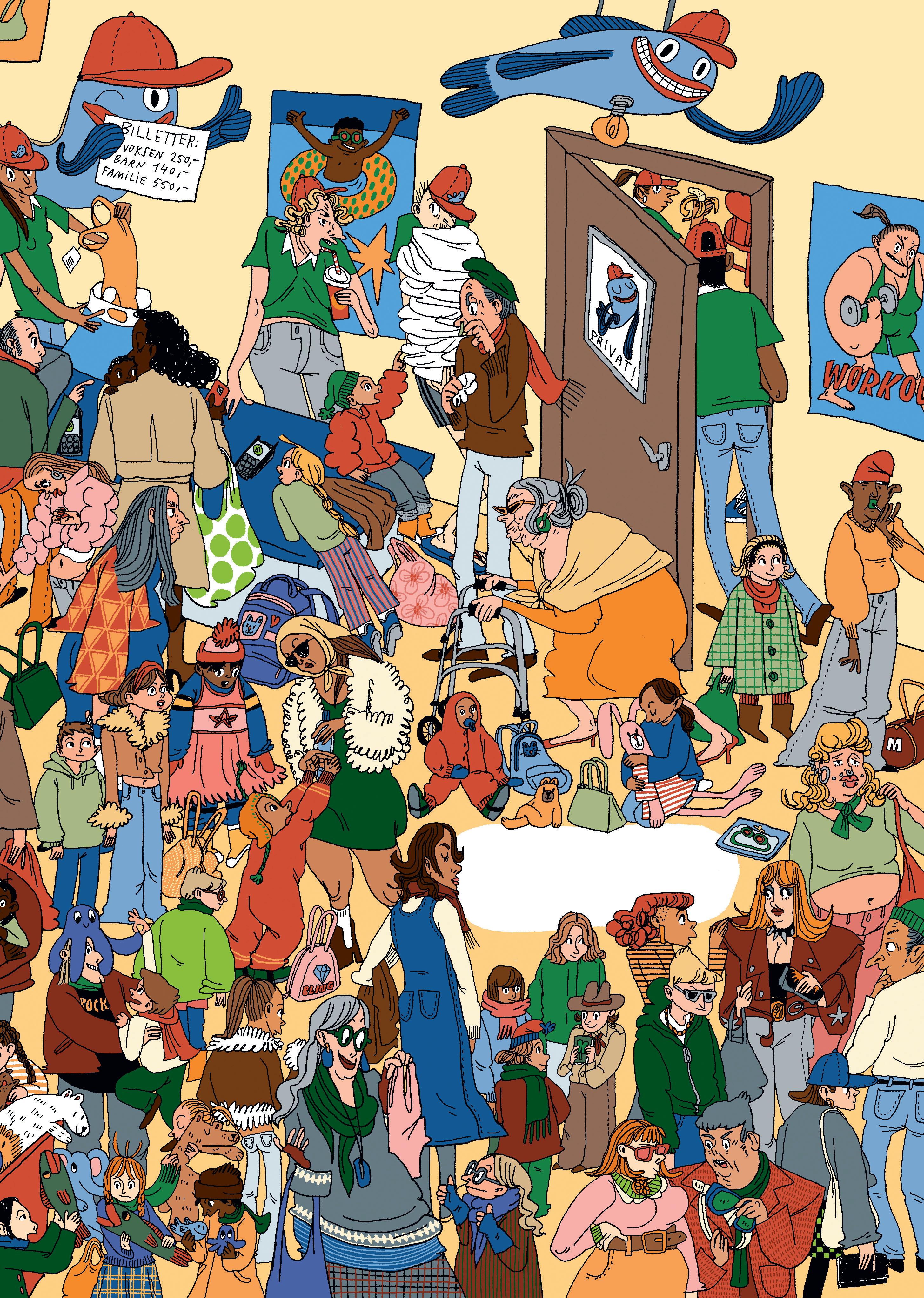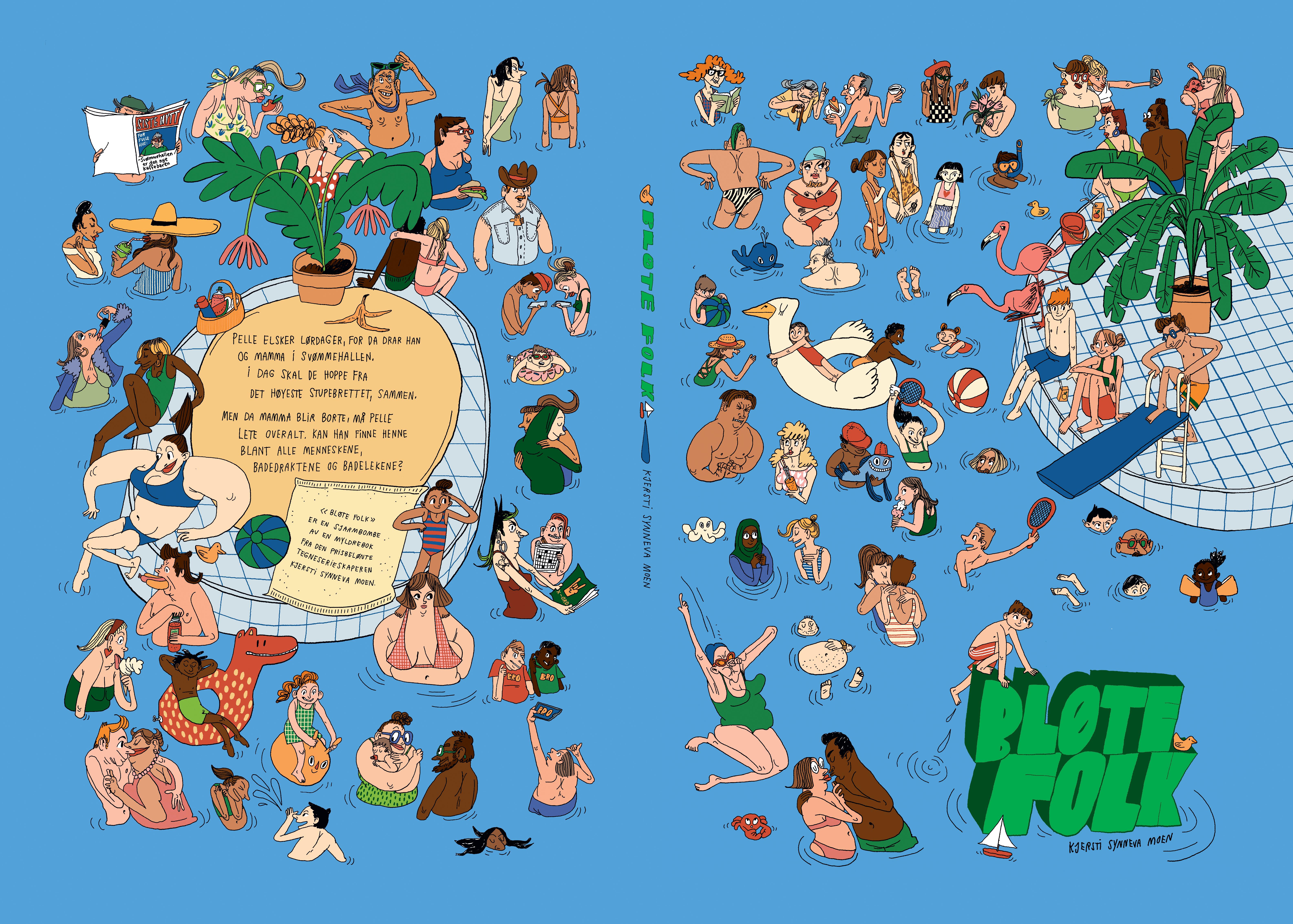 Mange folk vil svømme på en lørdag. – Veldig mange folk, sier mamma. Det lukter en blanding av jord, basseng og kokte pølser.