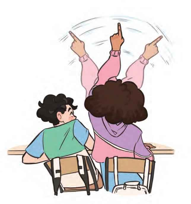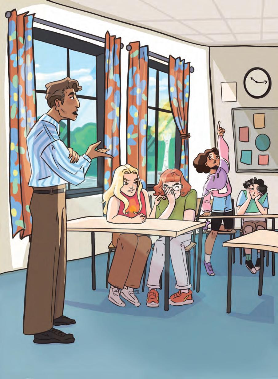 Hun tripper med føttene under bordet. Resten av klassen unngår blikket til Fredrik. Noen ser ned, mens andre kikker irritert bort på Mona.
