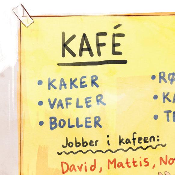 Vi skal selge: kaker, vafler, boller, rød saft, kaffe, te.