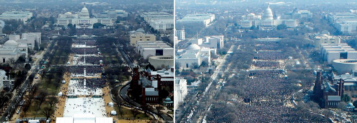 Beskrivelsen over er satt litt på spissen. Det er likevel ikke vanskelig å finne eksempler som viser at noe sånt er i ferd med å skje. Da president Trump tiltrådte i januar 2017, påsto han at det aldri før hadde vært flere til stede under innsettelsesseremonien. Selv om flere tv-stasjoner og aviser publiserte bilder som tydelig viste at det var langt flere til stede ved innsettelsen av president Obama åtte år tidligere, hevdet Trump at det var disse mediene som løy. Han gjentok derfor samme påstand flere ganger senere. En av Trumps rådgivere hevdet i et tv-program at presidenten ikke løy, men presenterte «alternative fakta». Det er ikke mulig å avgjøre på en vitenskapelig måte hvor stor en slik folkemengde er, hevdet hun.