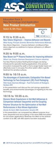 10:15 to 10:35 a.m. Styrenic Block Copolymers in Hot-Melt Adhesives: A Comparison between Sequential and Via-Coupling Polymer Structure for the Optimization of Hot-Melt Performances in Non-Woven Application Davide De Santi, R&D, Coordination, Versalis SPA In this presentation, we compared two different polymer structures, sequential and via-coupling, in the same HMA formulation for non-woven applications. Moreover, the effect of the di-block content of an SBC with 40% styrene has been evaluated.