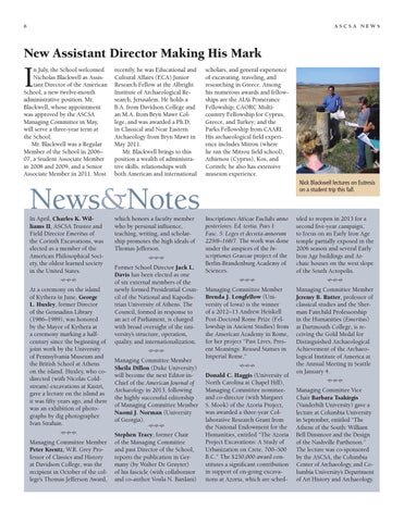 n July, the School welcomed Nicholas Blackwell as Assistant Director of the American School, a new twelve-month administrative position. Mr. Blackwell, whose appointment was approved by the ASCSA Managing Committee in May, will serve a three-year term at the School. Mr. Blackwell was a Regular Member of the School in 2006– 07, a Student Associate Member in 2008 and 2009, and a Senior Associate Member in 2011. Most