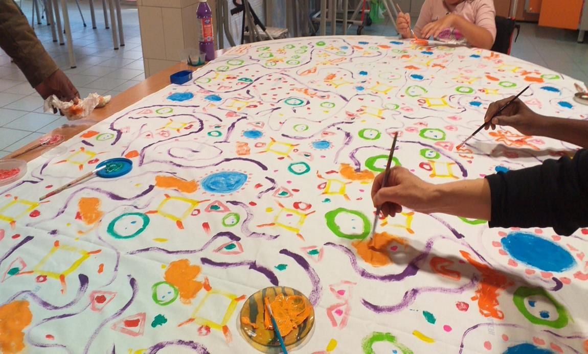 • The children arrange themselves in a circle around a table, on which a large drawing paper is spread.