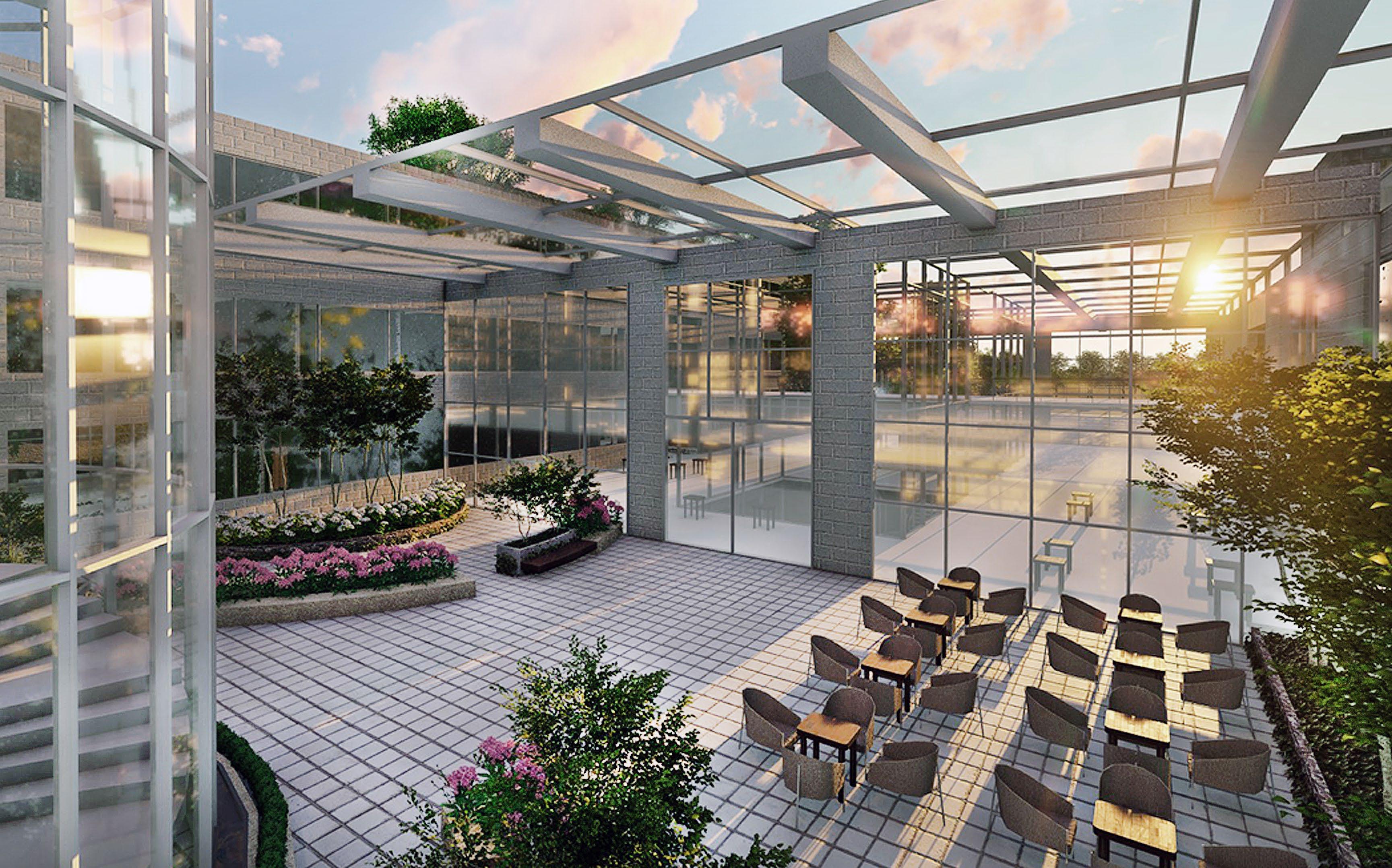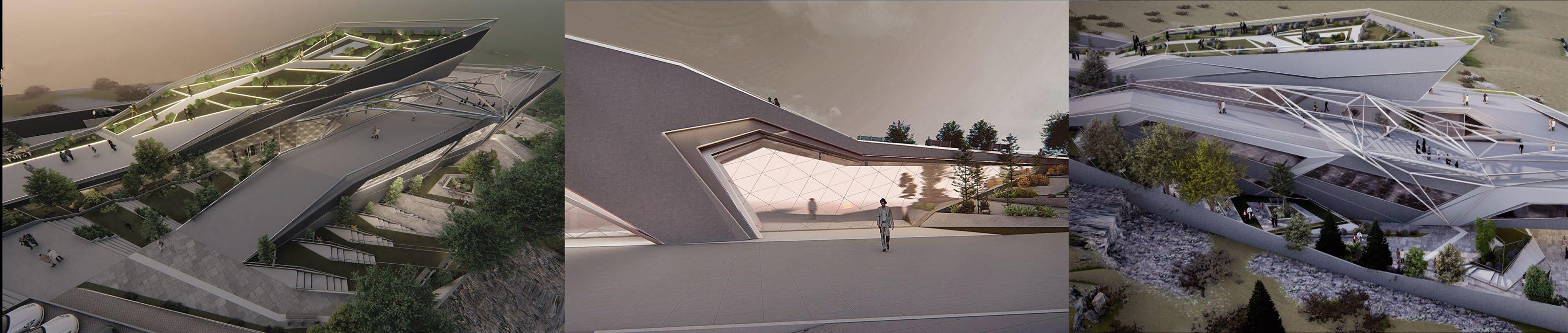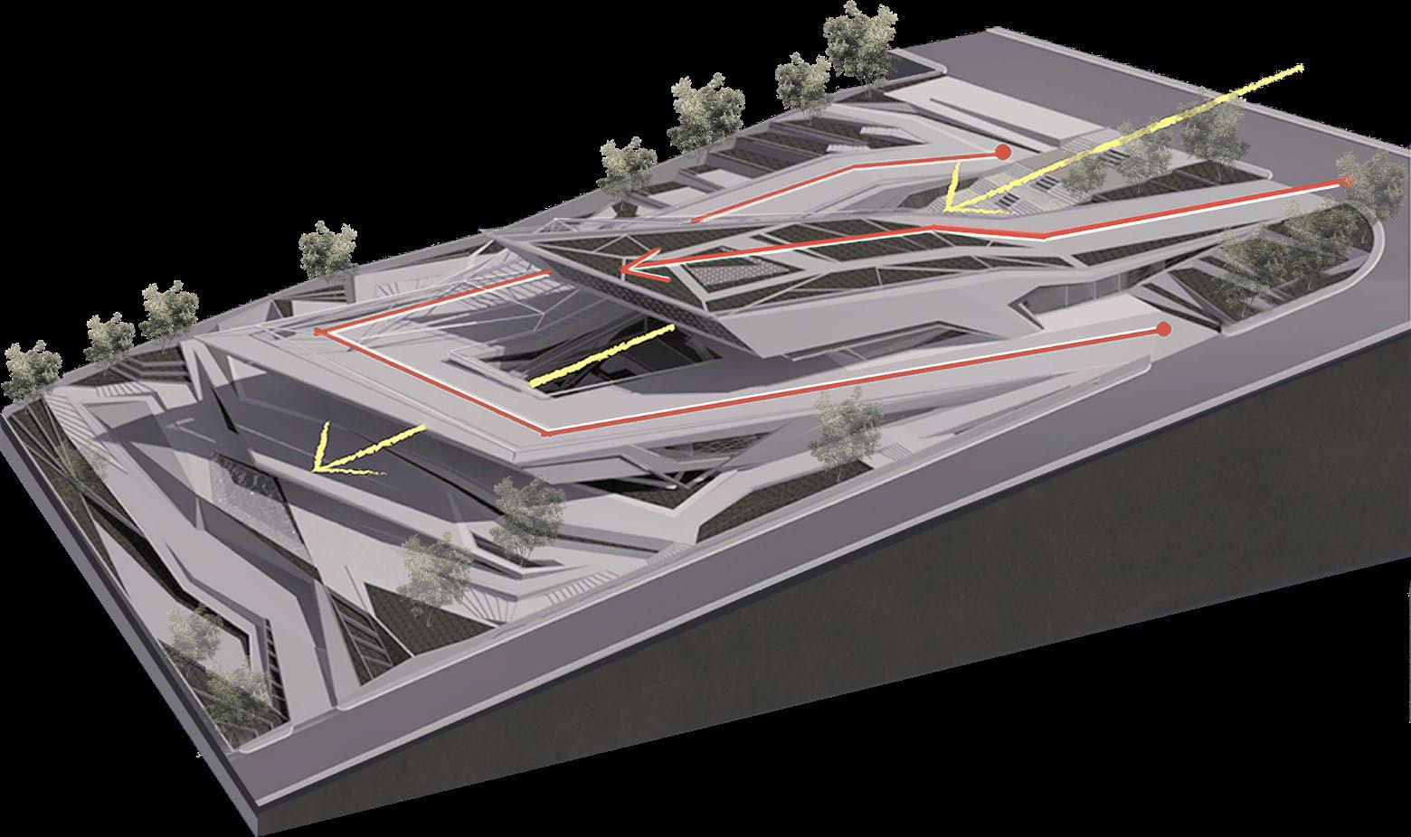 The site design features a main path which links flexible interactive outdoor spaces, beginning with the green walkway, passing through the plaza and courtyard, and ending with gathering nodes within the botanic garden. The roof of the building is designed to provide cultural and social interaction areas such as the urban living room where people can congregate and enjoy the view of Bethlehem city, as well as the outdoor theater which serves as a multifunctional performance and display area.