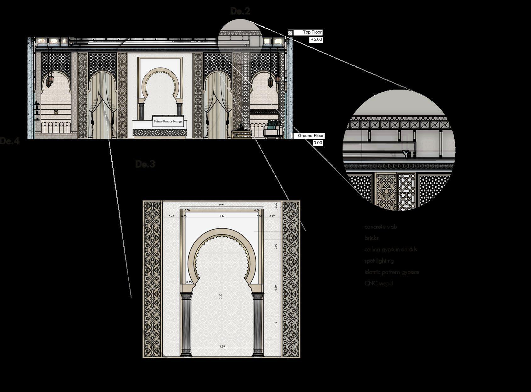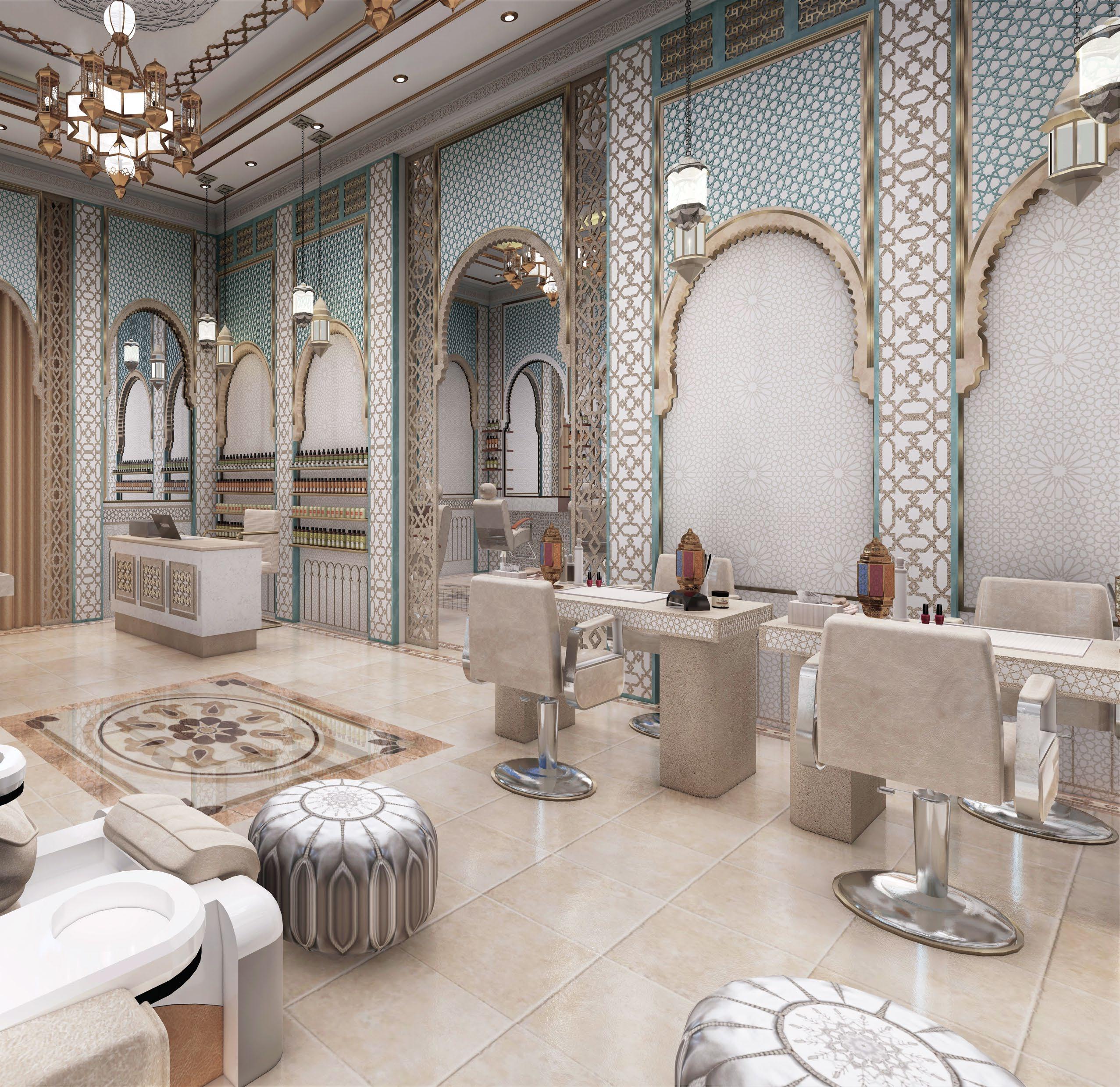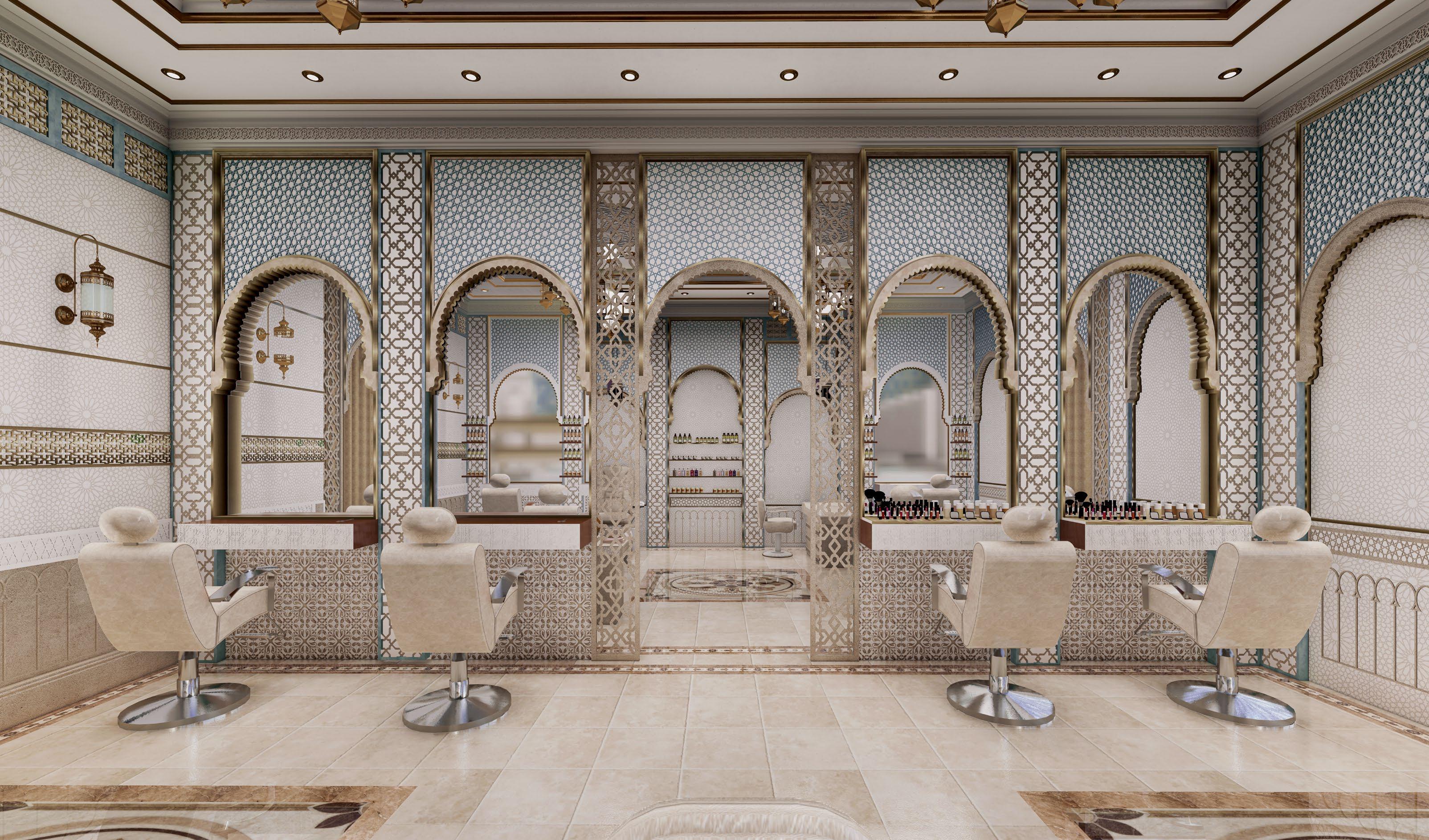 A 200 square meter beauty lounge drawing inspiration from the Moroccan/Andalusian aesthetic. The interior design encapsulates the opulence of Moroccan Style through intricate details, ornate carvings, and vibrant patterns.