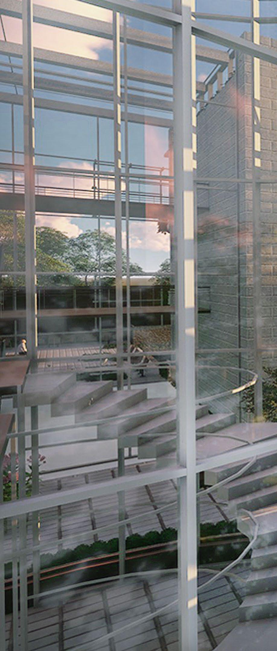 Large glass area for better view Create shadow from cantilever Cross-view communication inside the building