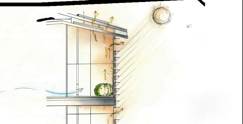 The sun breakers allow 1/3 of the sun radiation to get in, causing the heat needed for the solar space to work as a cooling system, in addition to the effect of the passive evaporative cooling system.