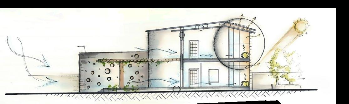 Ventilation: The pottery wall, water elements, and greenary cool down the air entereing the villa. Shading: 2/3 of the sun radiation is blocked to prevent overheating).