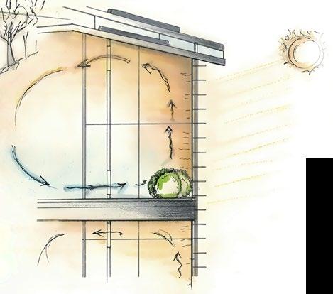 Deciduous trees in front of the southern facade block unwanted sunlight in summer while letting it in during winter as the leaves have fallen. Windbreaks are planted to block the prevailing western wind. Indoor plants in the solar space help retain as much heat as possible.