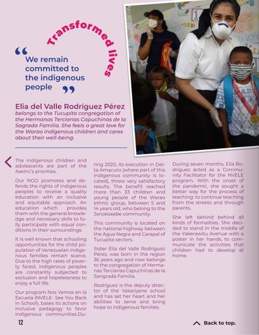 ring 2020, its execution in Delta Amacuro (where part of this indigenous community is located), threw very satisfactory results. The benefit reached more than 33 children and young people of the Warao ethnic group, between 5 and 14 years old, who belong to the Janokosebe community. This community is located on the national highway between the Agua Negra and Carapal of Tucupita sectors. Sister Elia del Valle Rodríguez Pérez, was born in the region 36 years ago and now belongs to the congregation of Hermanas Terciarias Capuchinas de la Sangrada Familia.